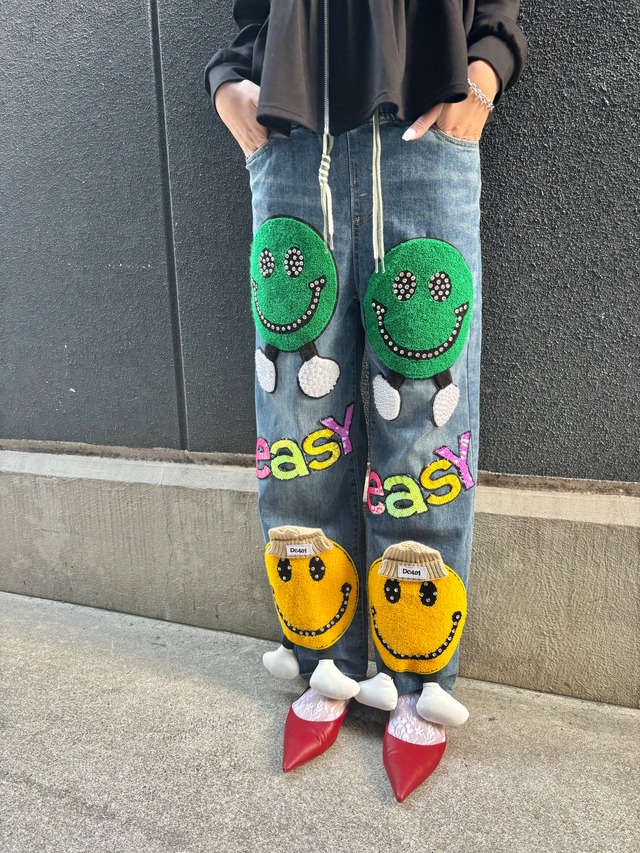 3D smiley decoration design denim pants デニム パンツ スマイリー ニコちゃん カジュアル ゴムウエスト