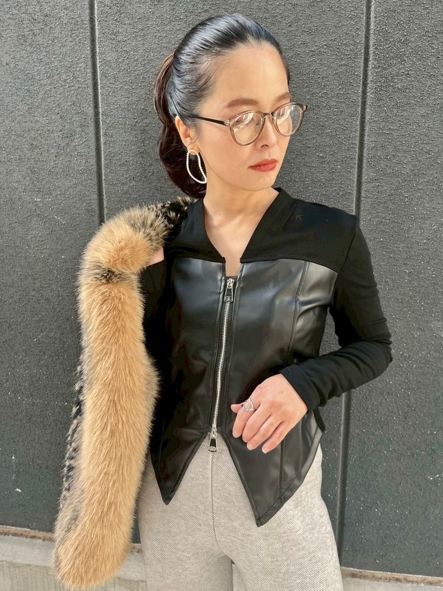 eco leather docking design stretch tops トップス ストレッチ エコレザー ドッキング 合皮 ジップアップ