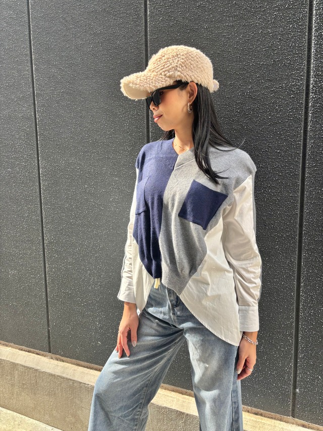 mix color docking design shirt シャツ デザインシャツ 異素材切替 ニット 配色 ドッキング ポケット Vネック