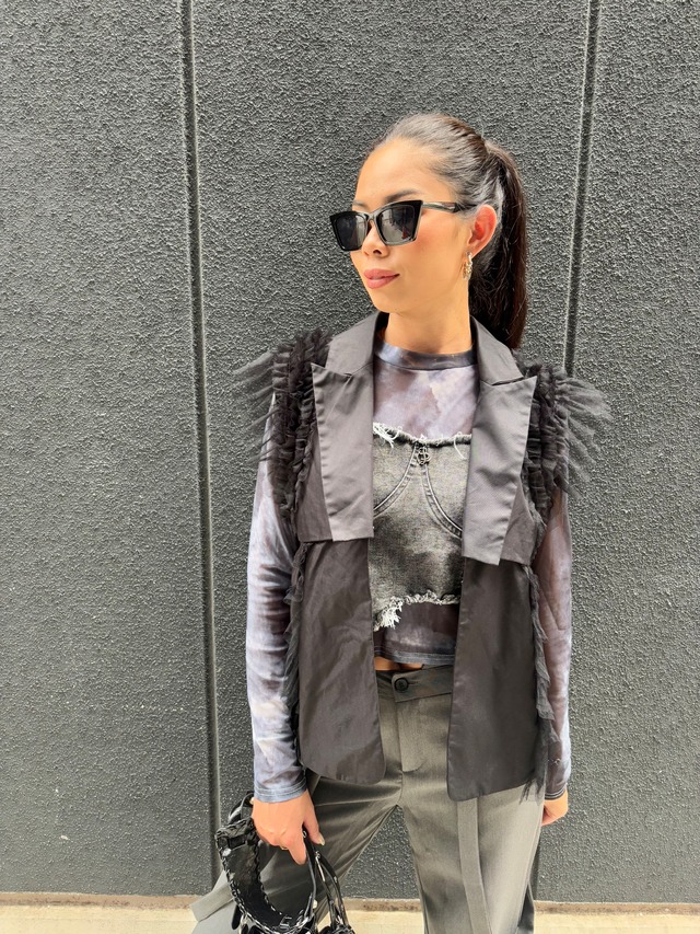 tulle frill design vest ベスト チュール フリル 襟付き ブラック 黒 重ね着