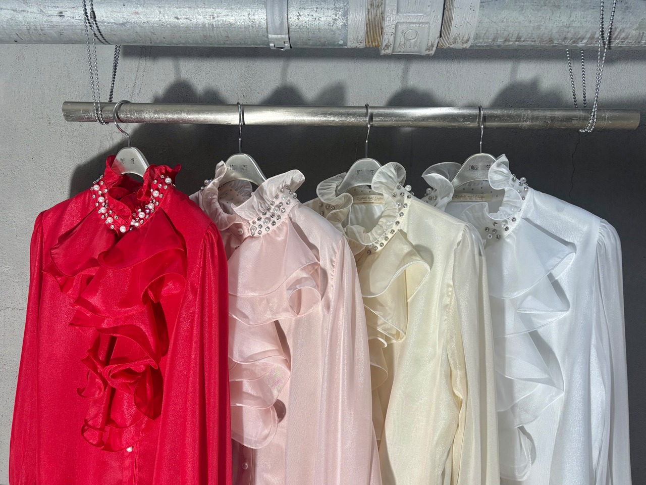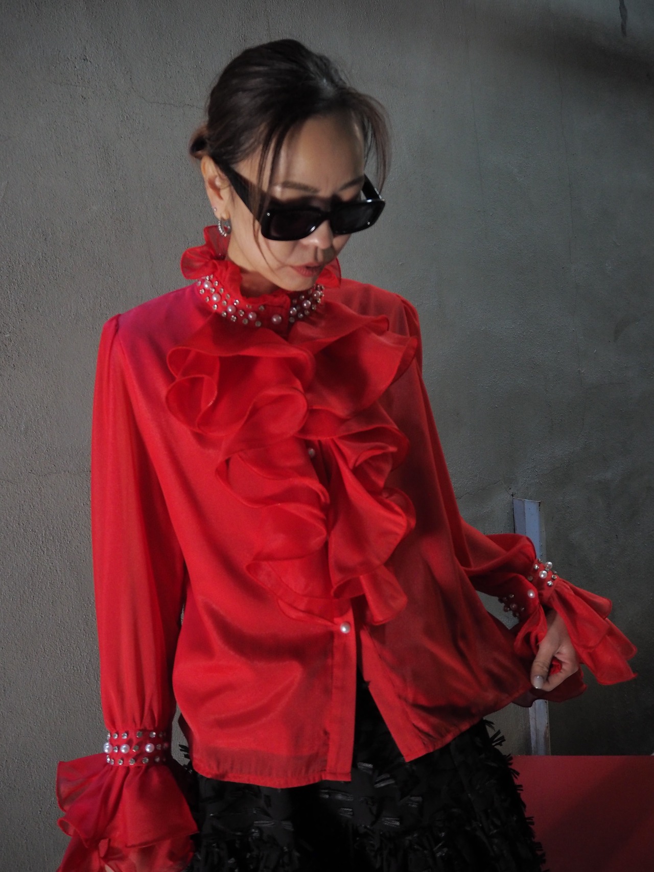 贅沢なフリルと華やかなビジューが魅力のスタンドネックデザインシャツが登場です♪