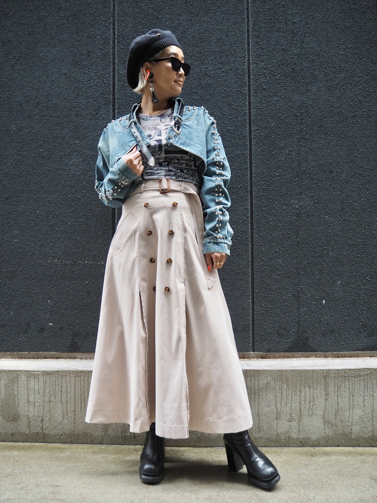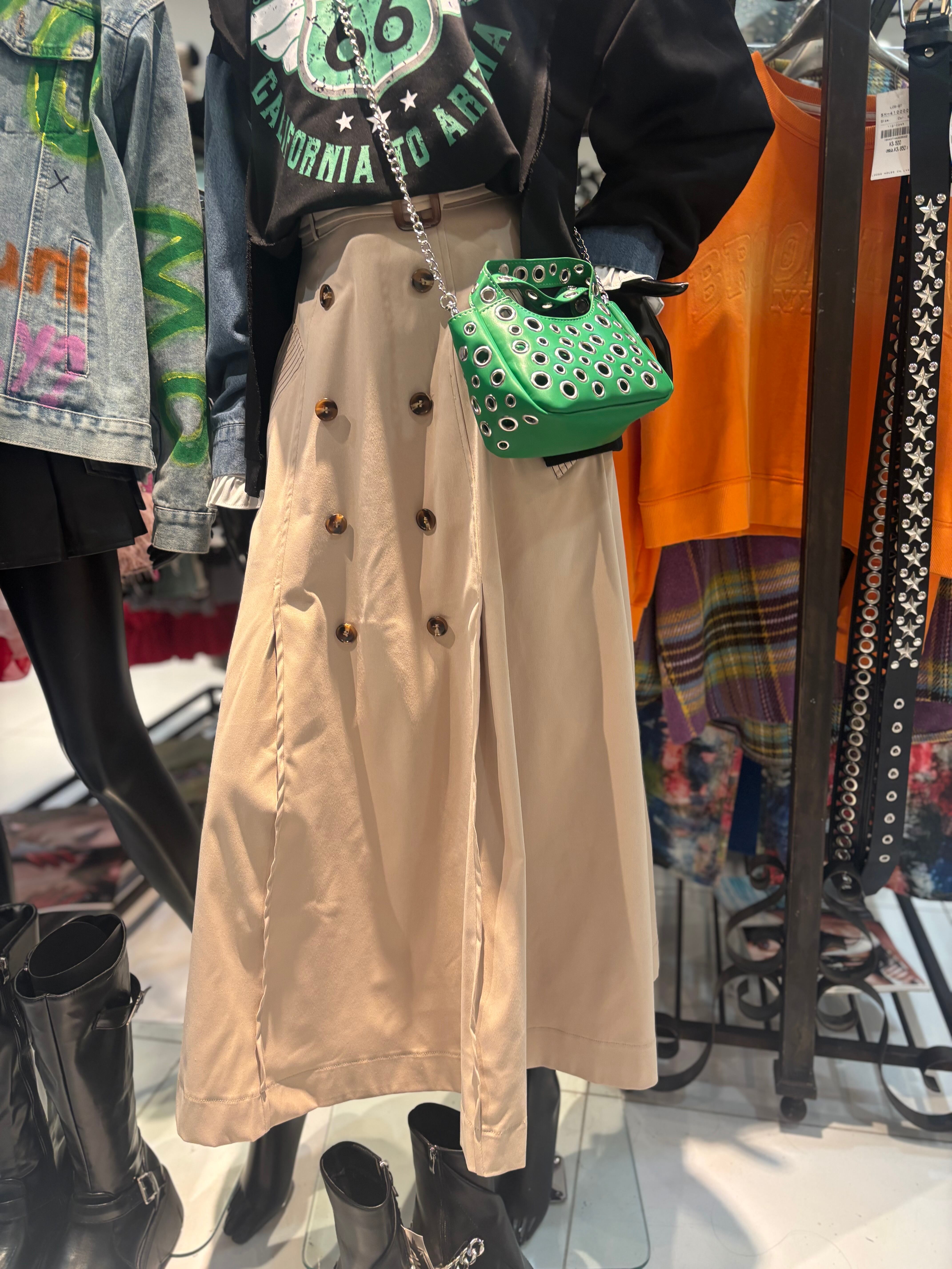 トレンチ風のデザインが特徴的なフレアスカートです。