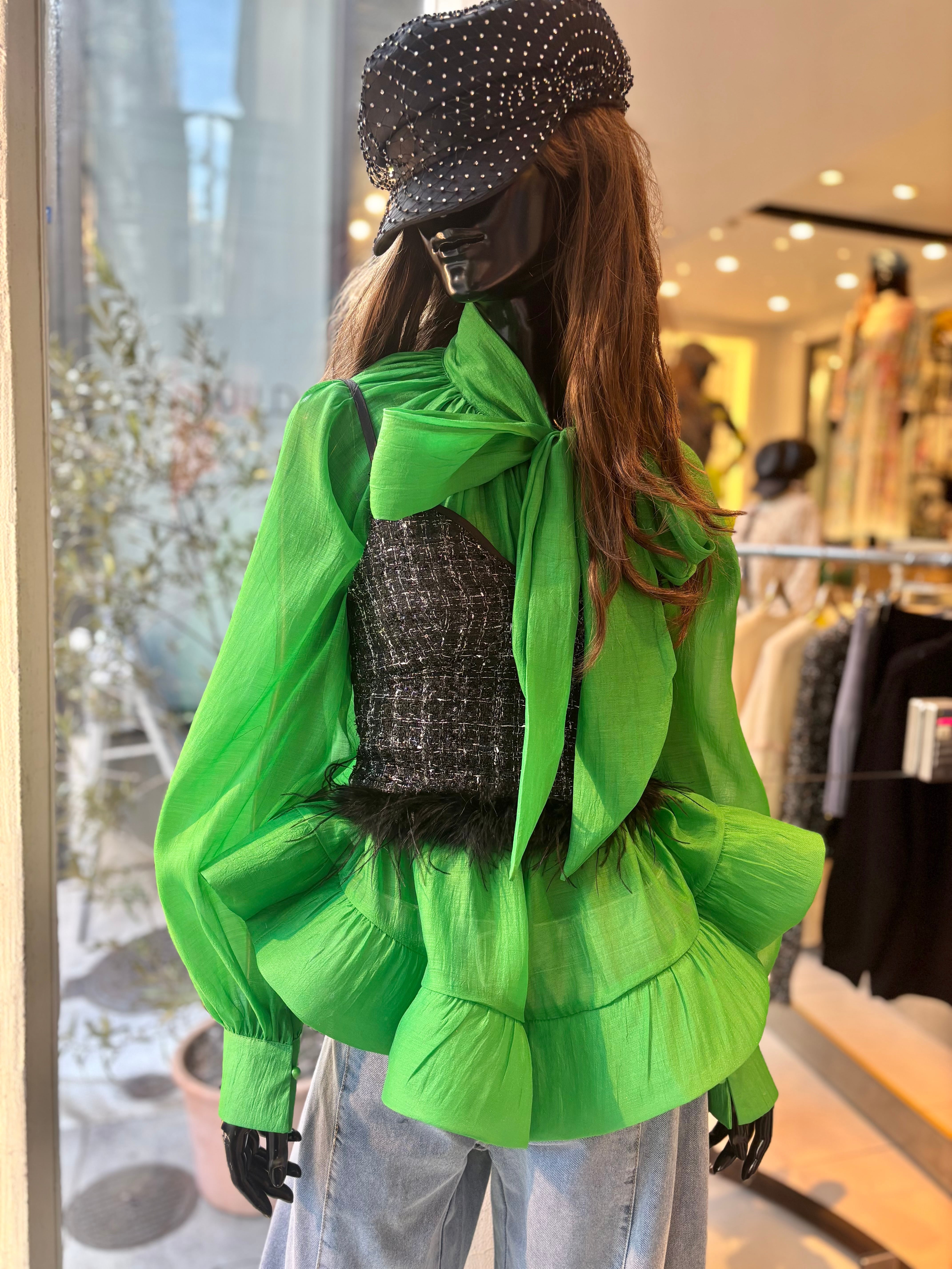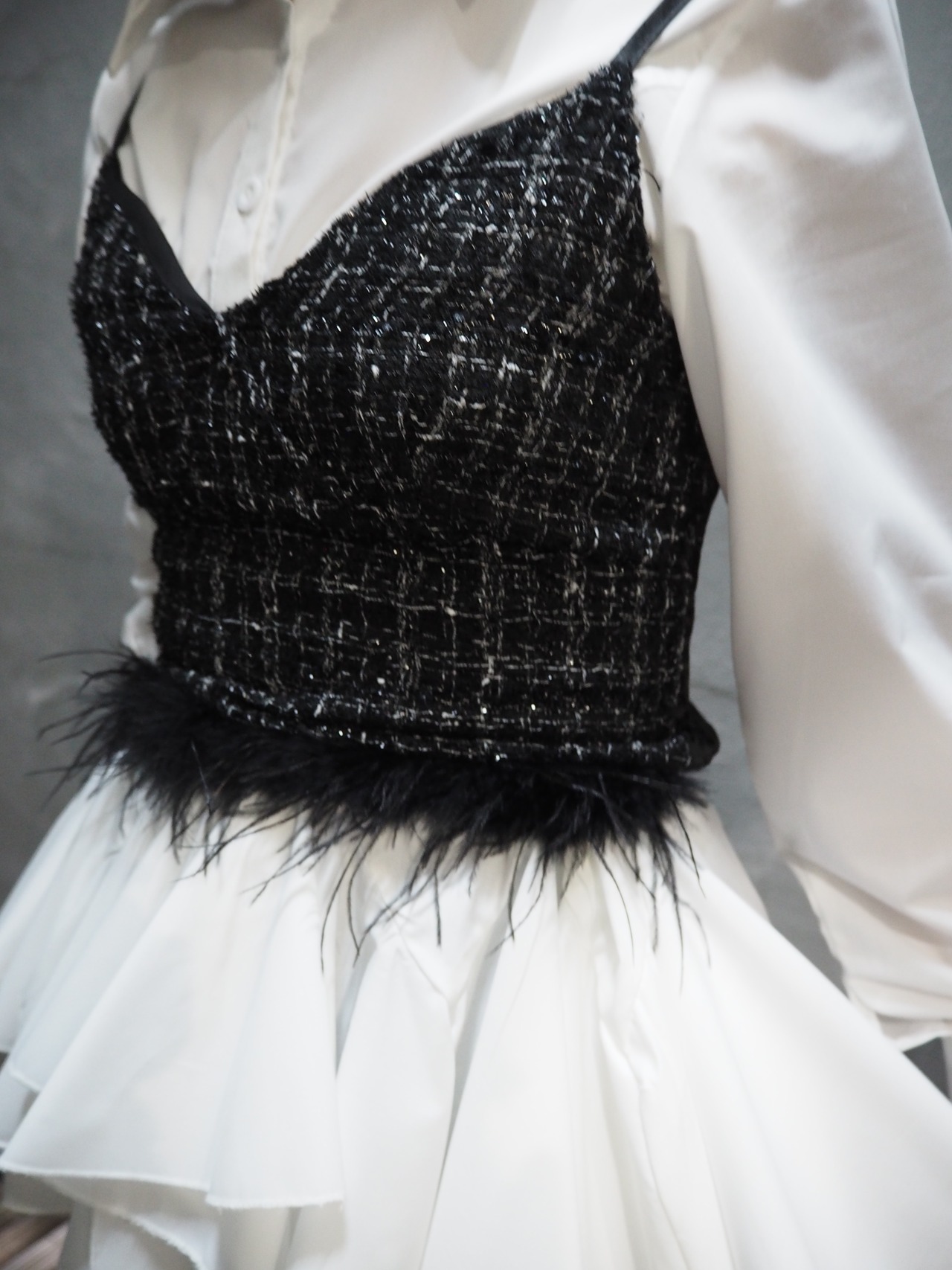 上品なツィード素材とふんわりとしたフェザーのデザインが絶妙に融合し