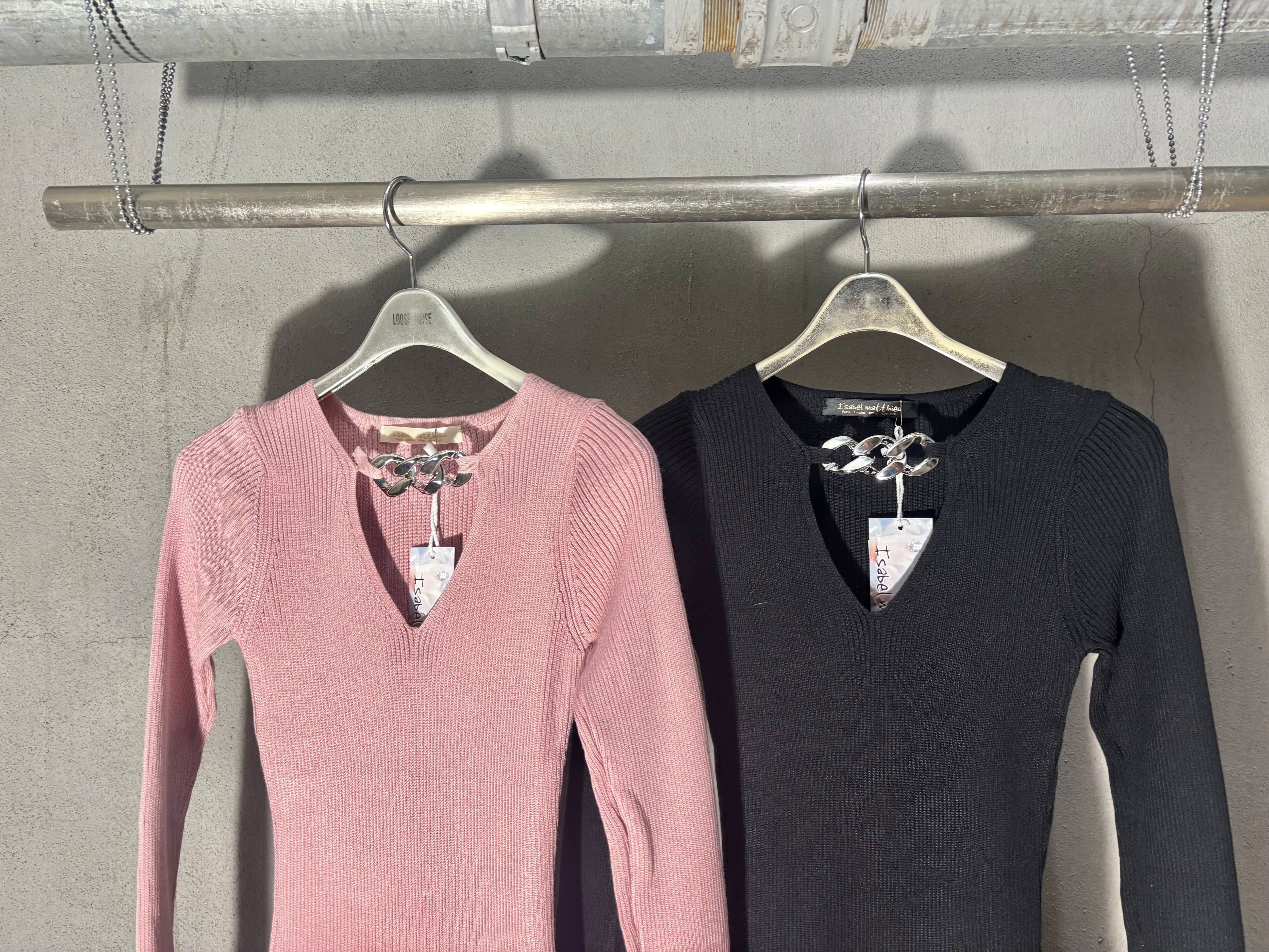 Vネックデザインとトレンディなチェーンがアクセントとなり