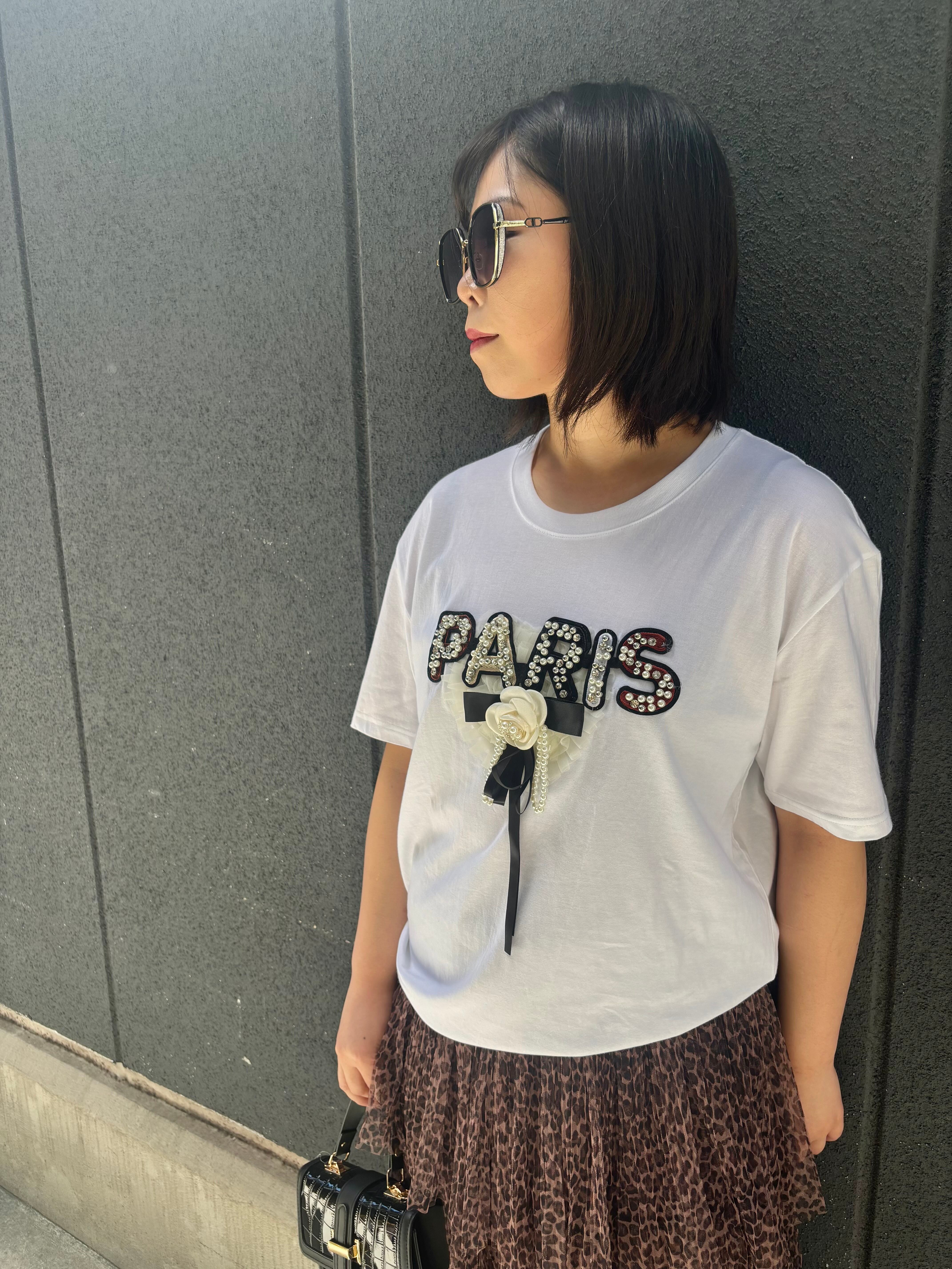 PARIS pearl × bijou design T-shirt Tシャツ パール ビジュー リボン