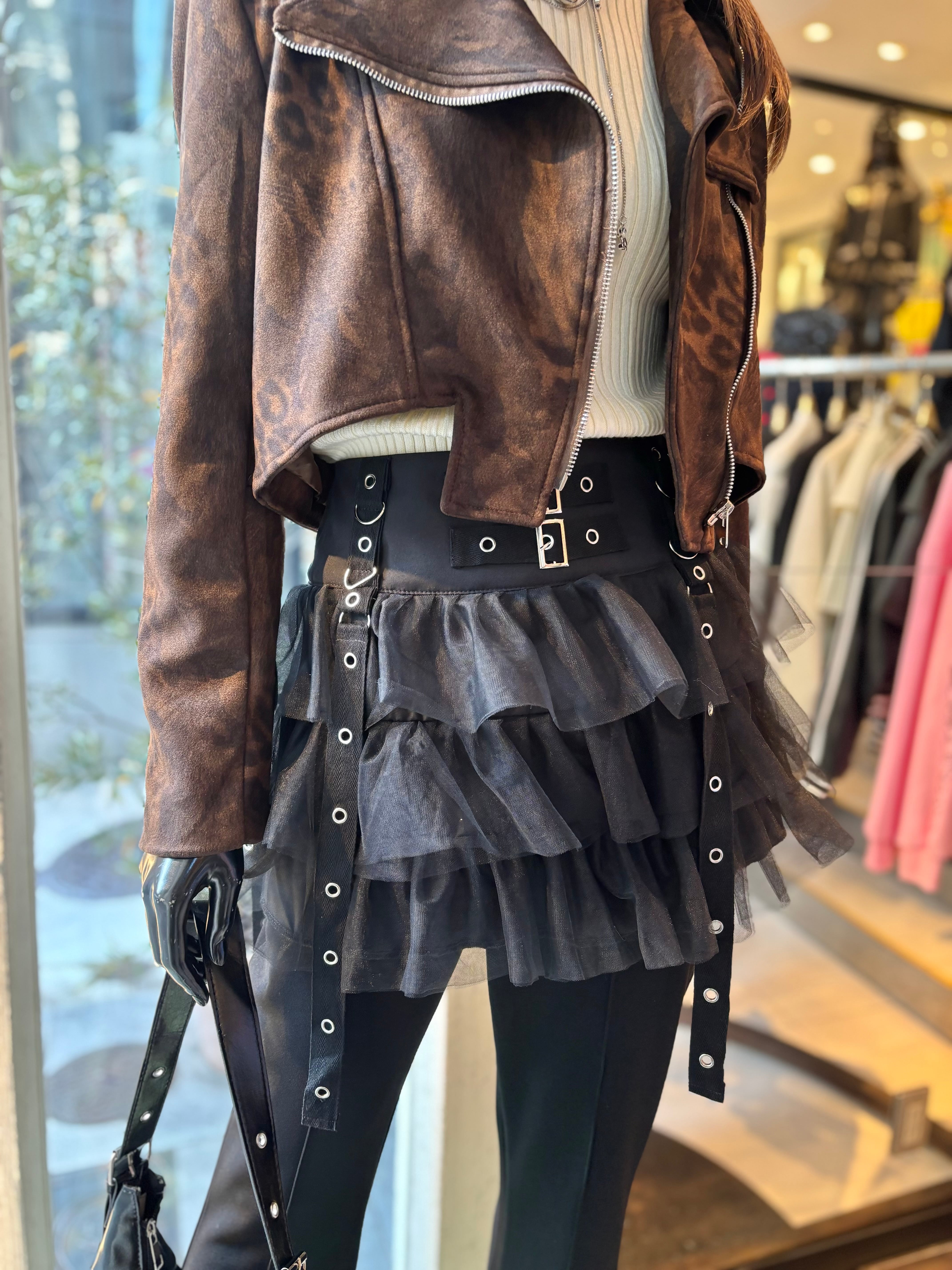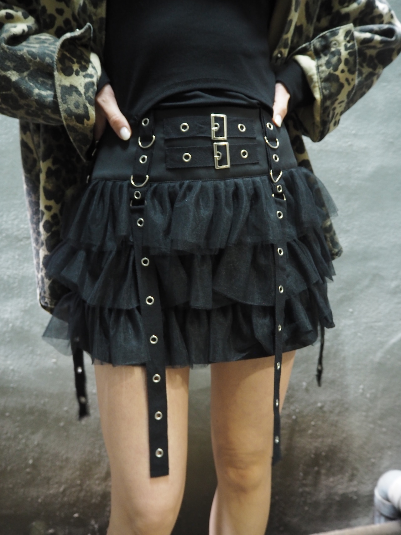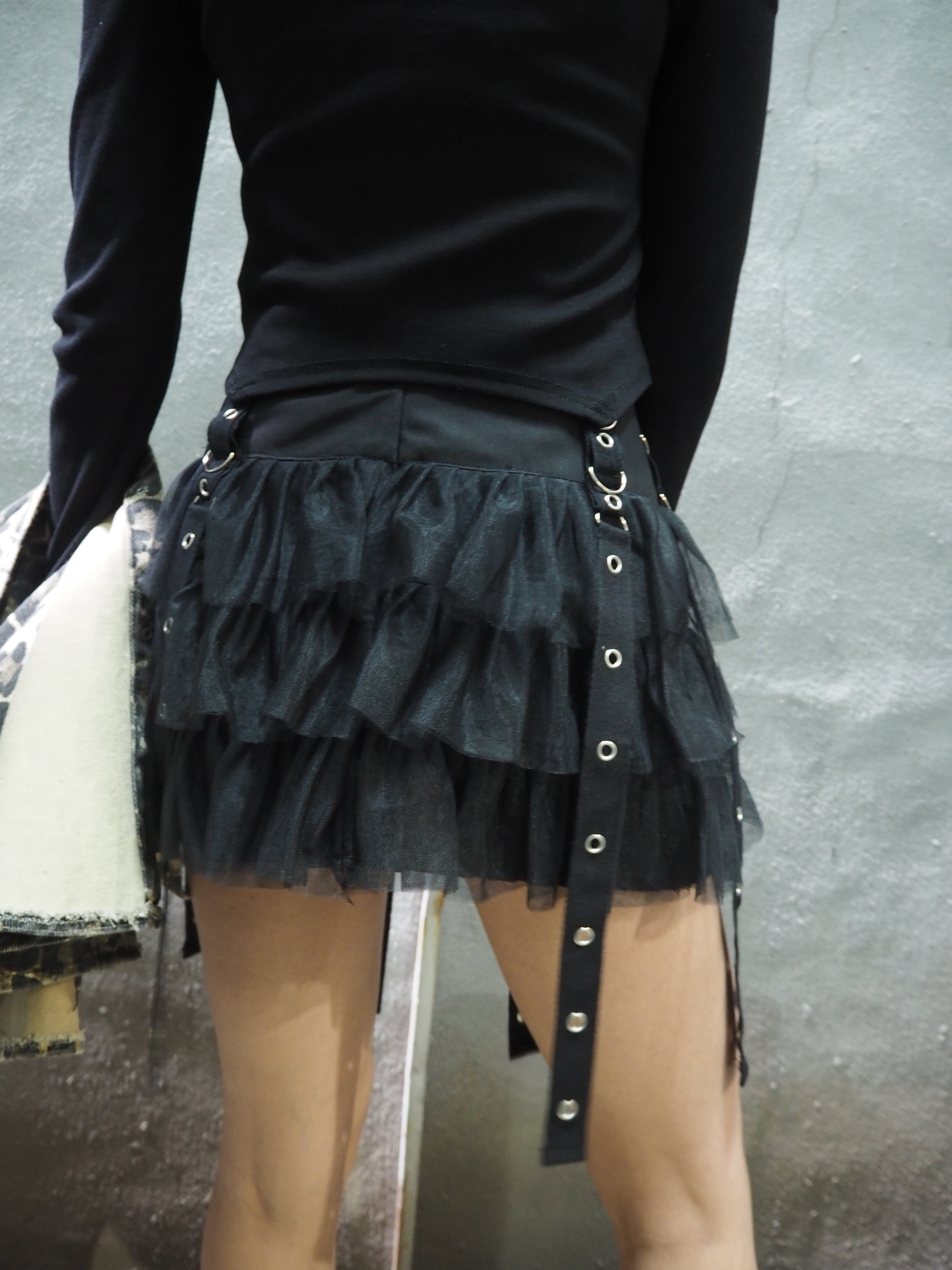 tulle frill × eyelet tape design mini skirt スカート ミニスカート ブラック 黒 チュール フリル アイレット テープ