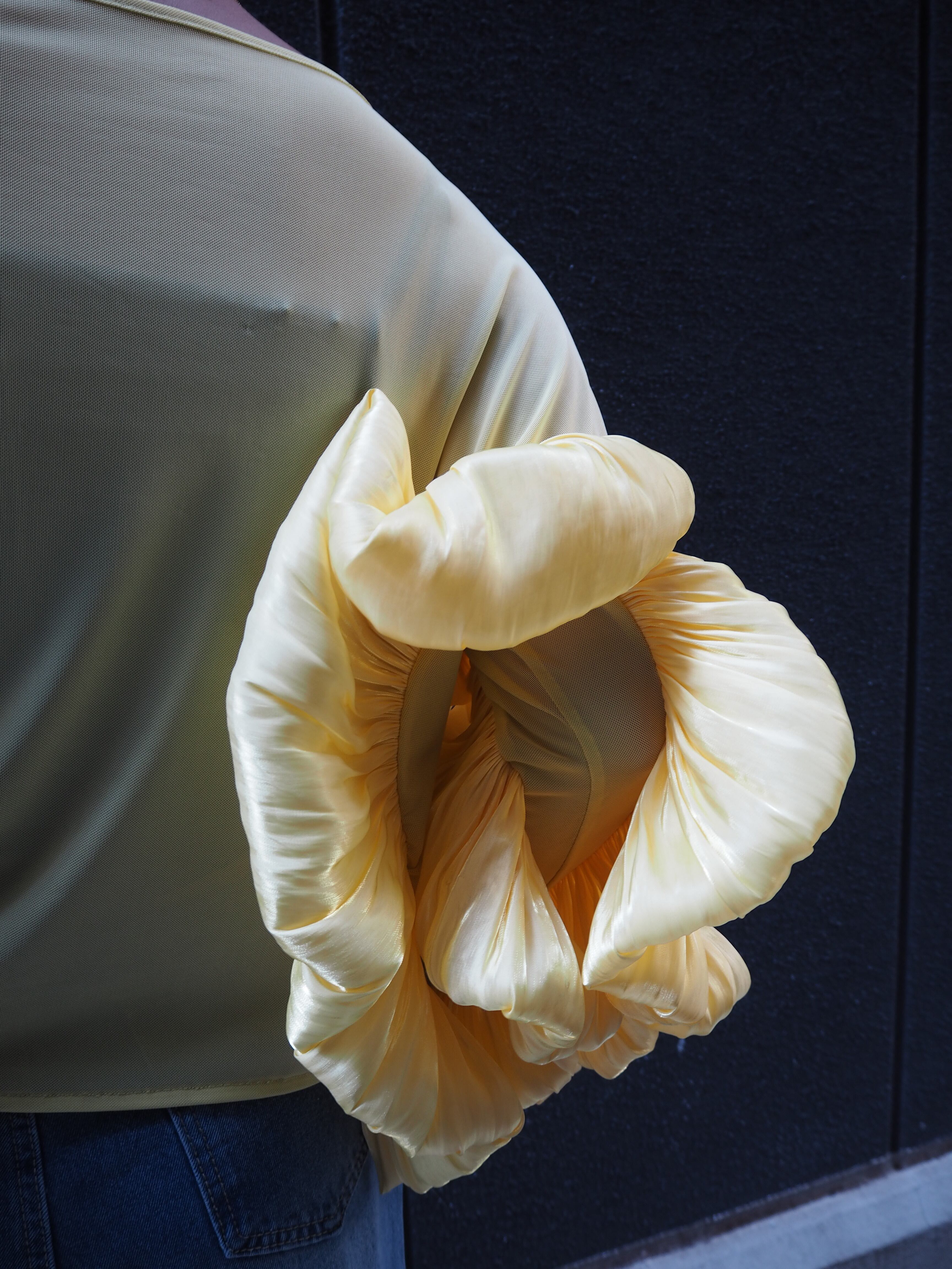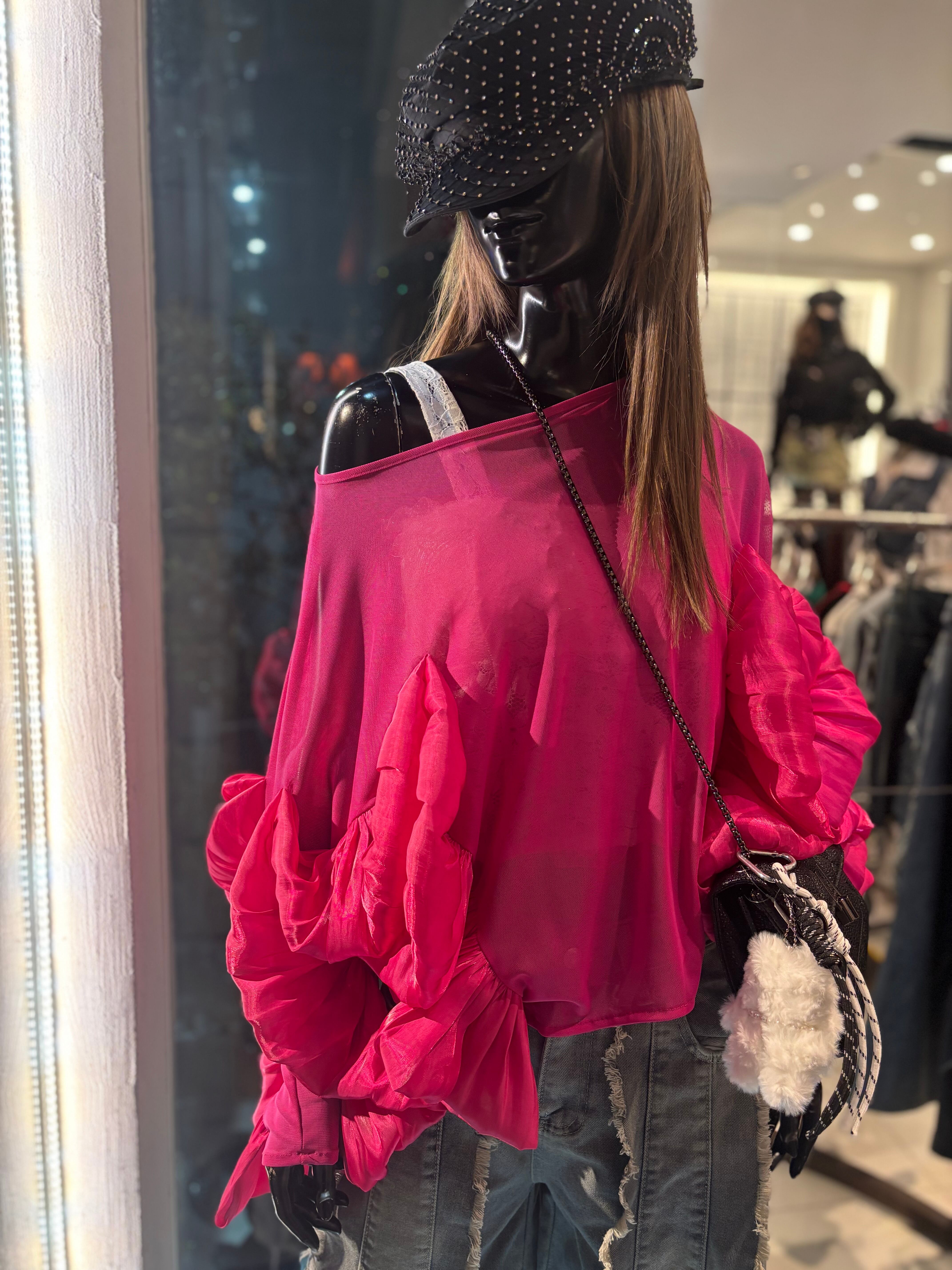 stretch net volume frill sleeve design tops トップス フリル ボリューム ストレッチ ネット メッシュ