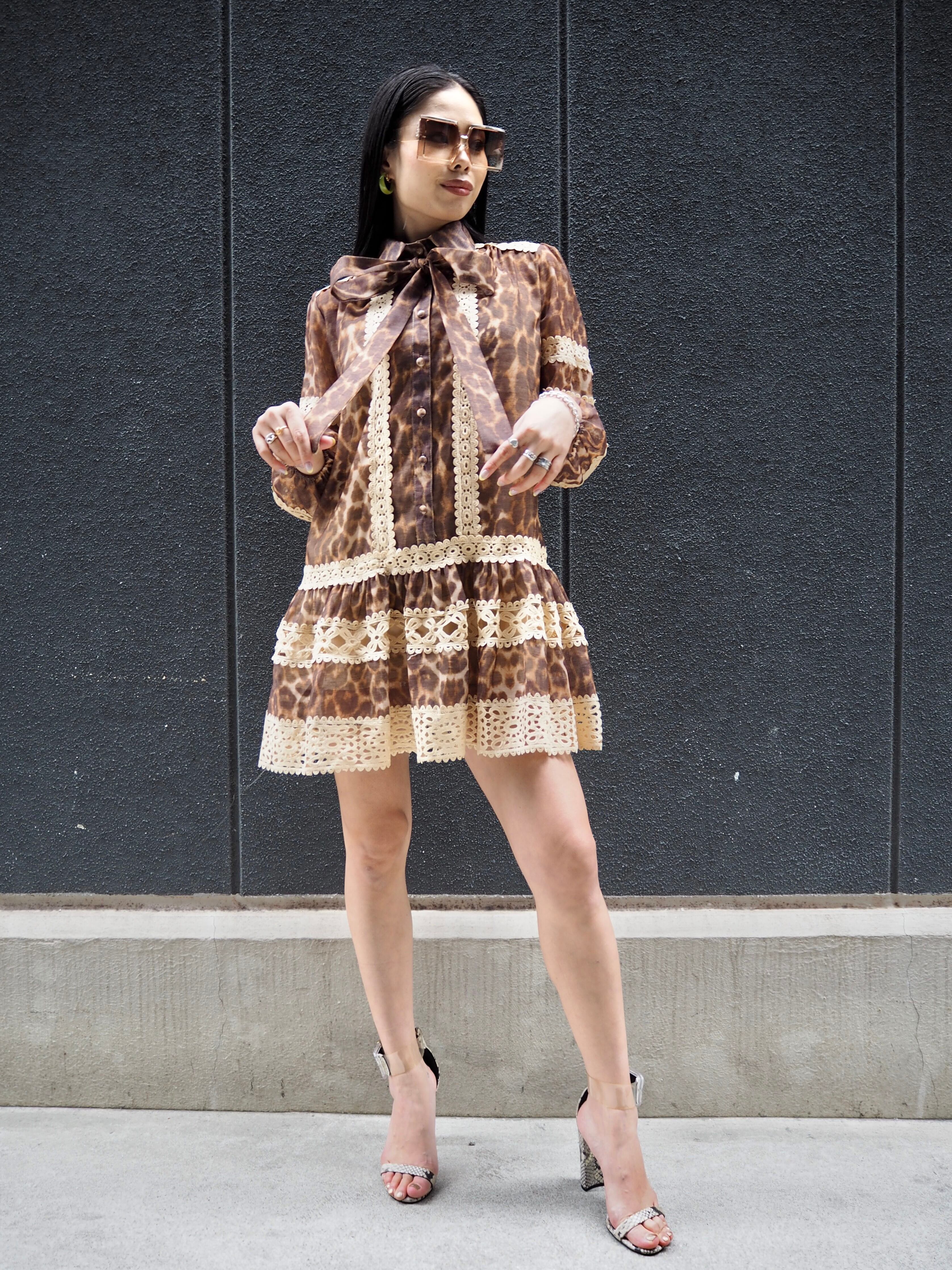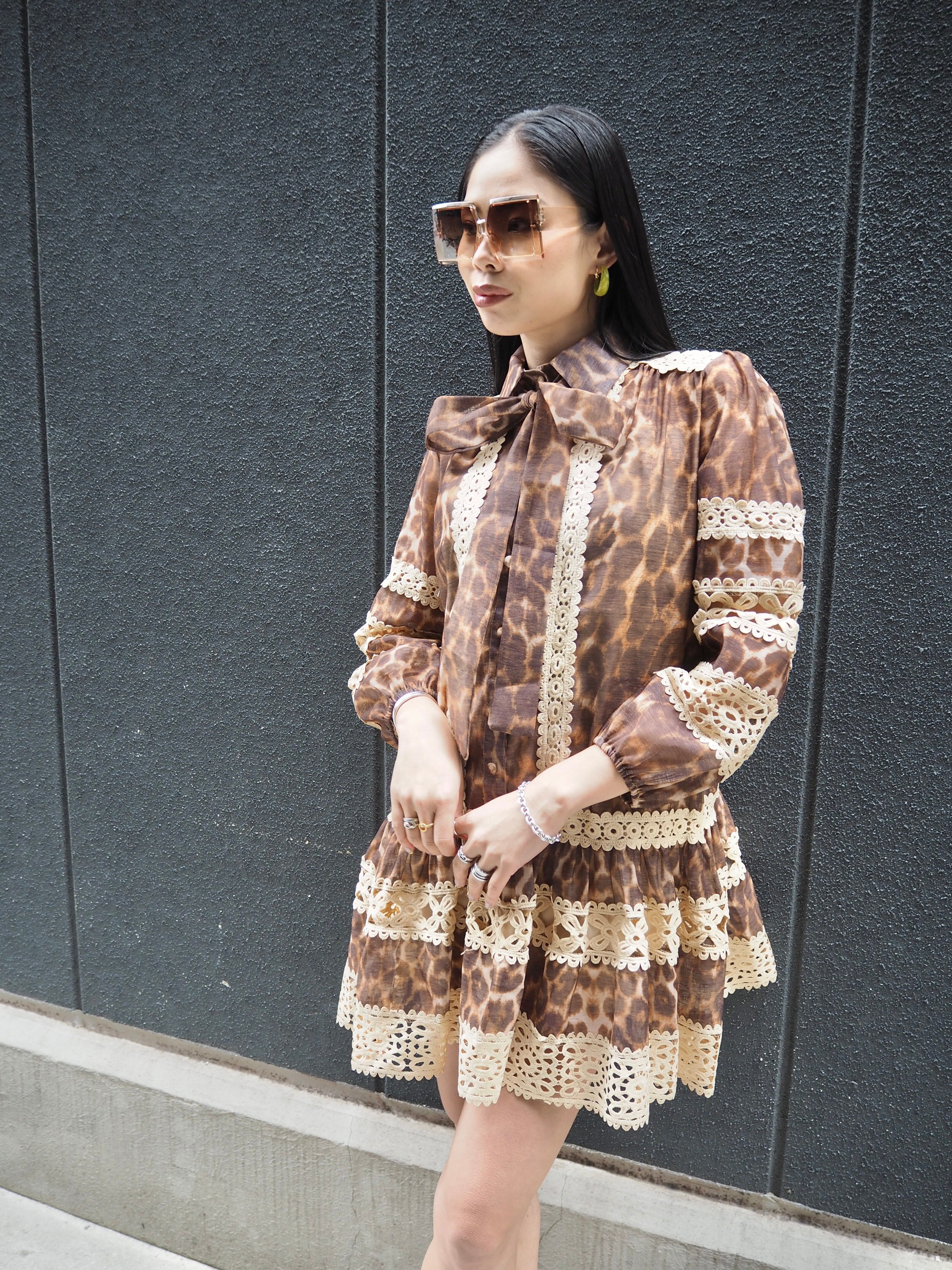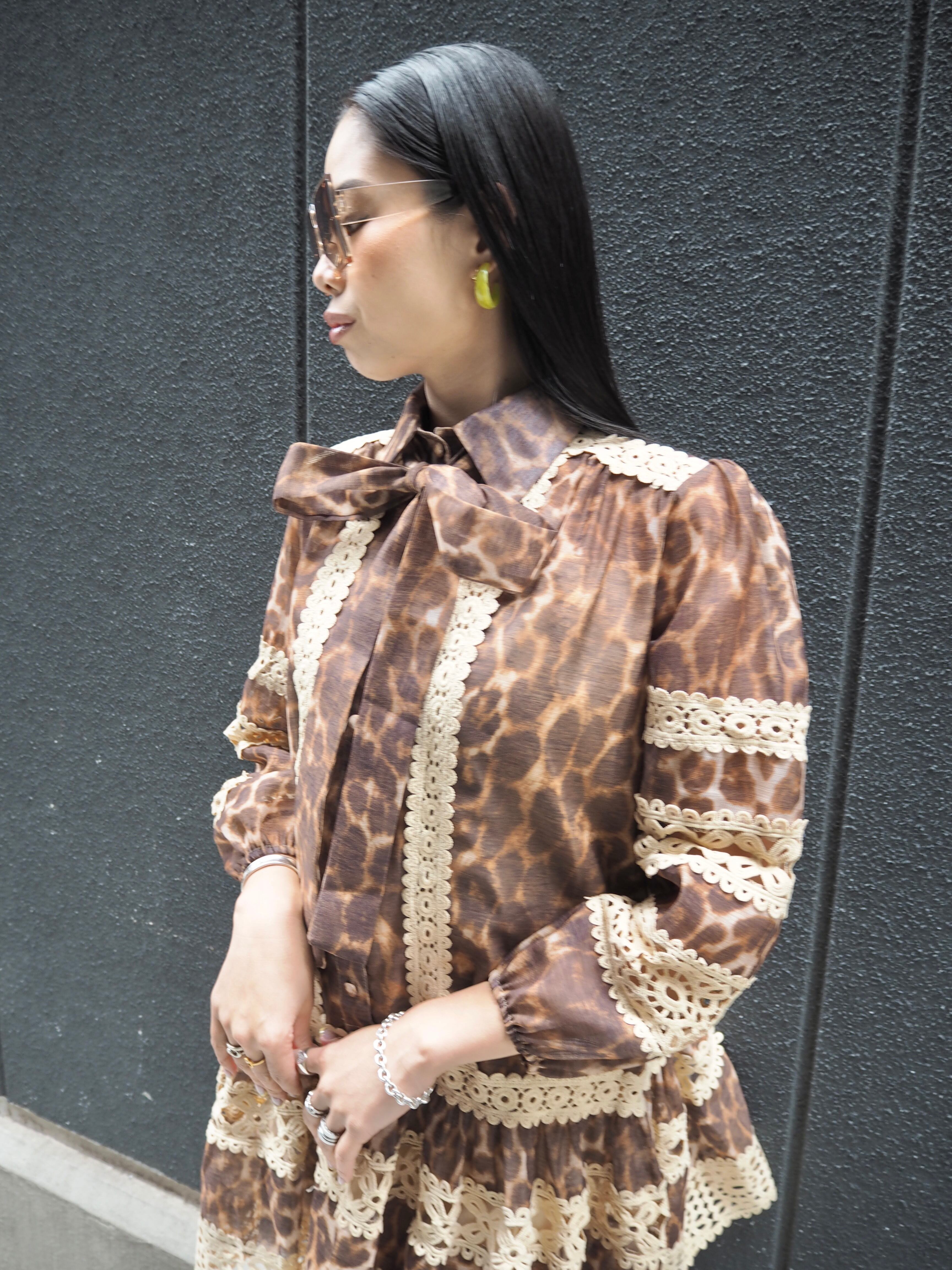 leopard × lace change design mini one-piece ワンピース ミニワンピ レオパード 豹柄 ひょう レース ボウタイ リボン