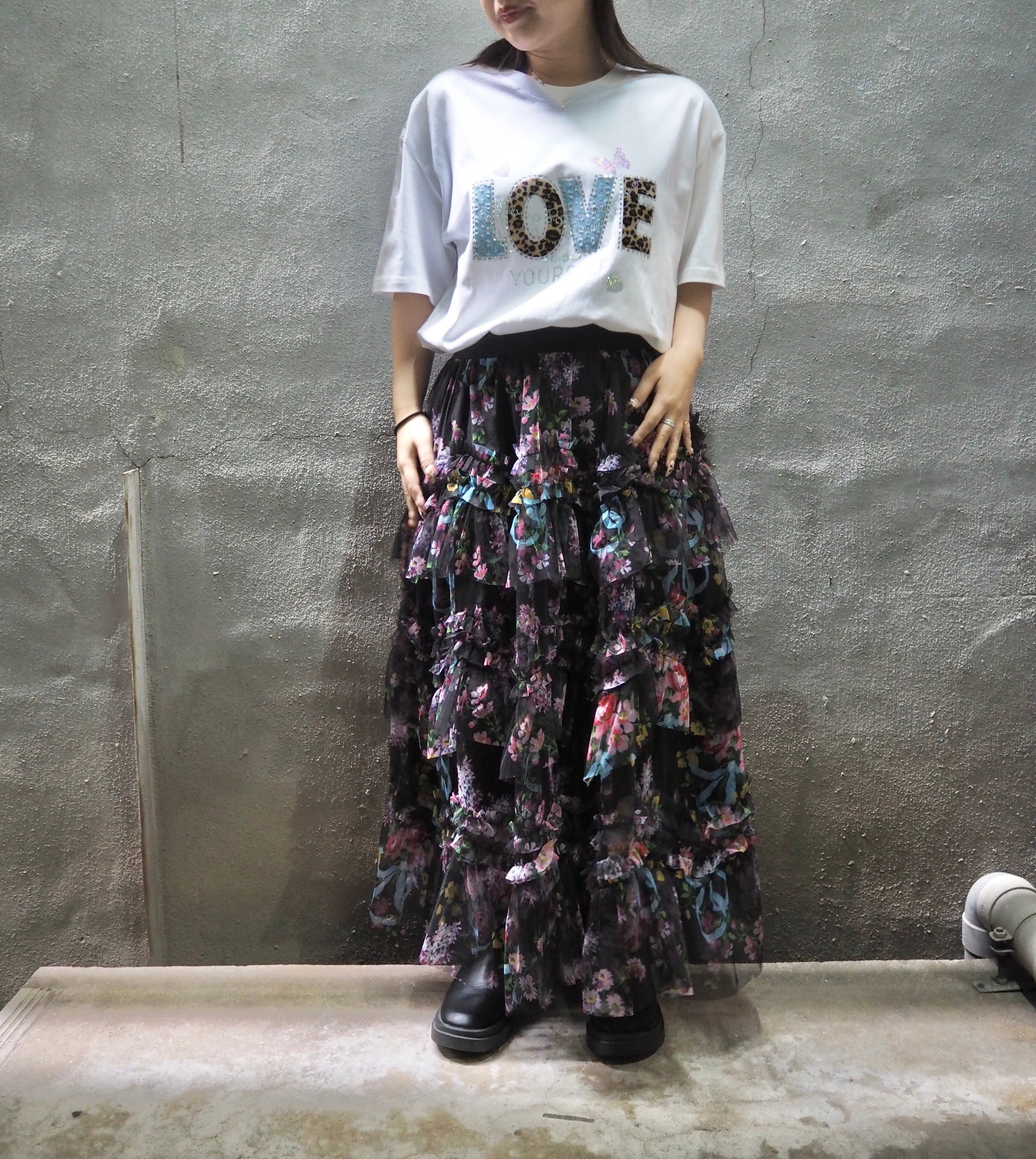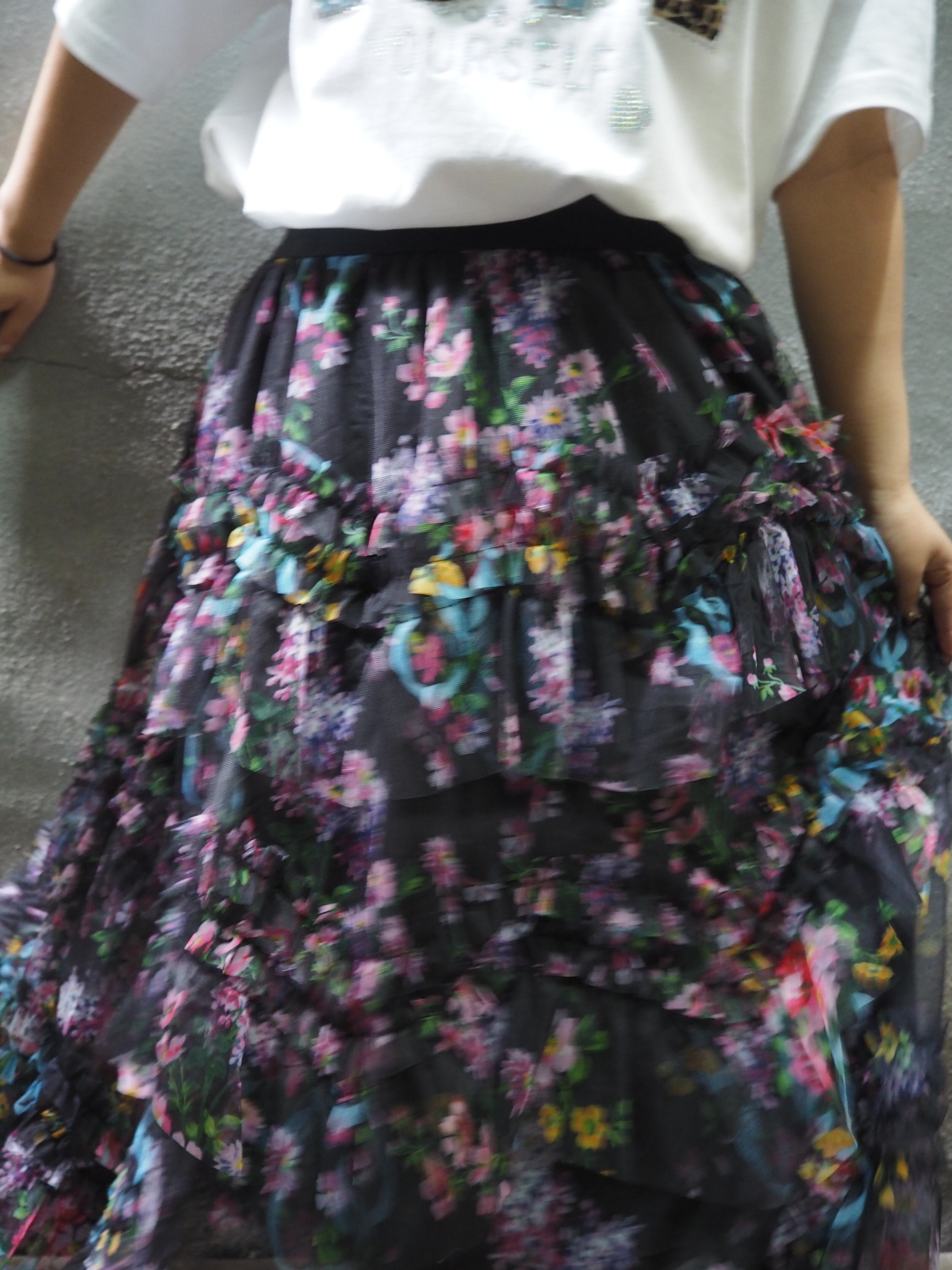 flower print frill mix design tulle long skirt スカート チュール フリル ロングスカート 花柄