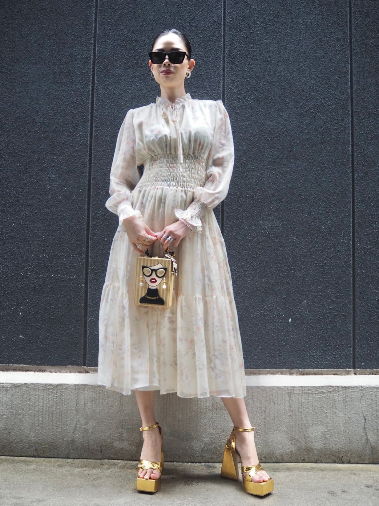 flower print shirring waist design chiffon long one-piece ワンピース ワンピ ロングワンピ 花柄 シャーリング