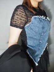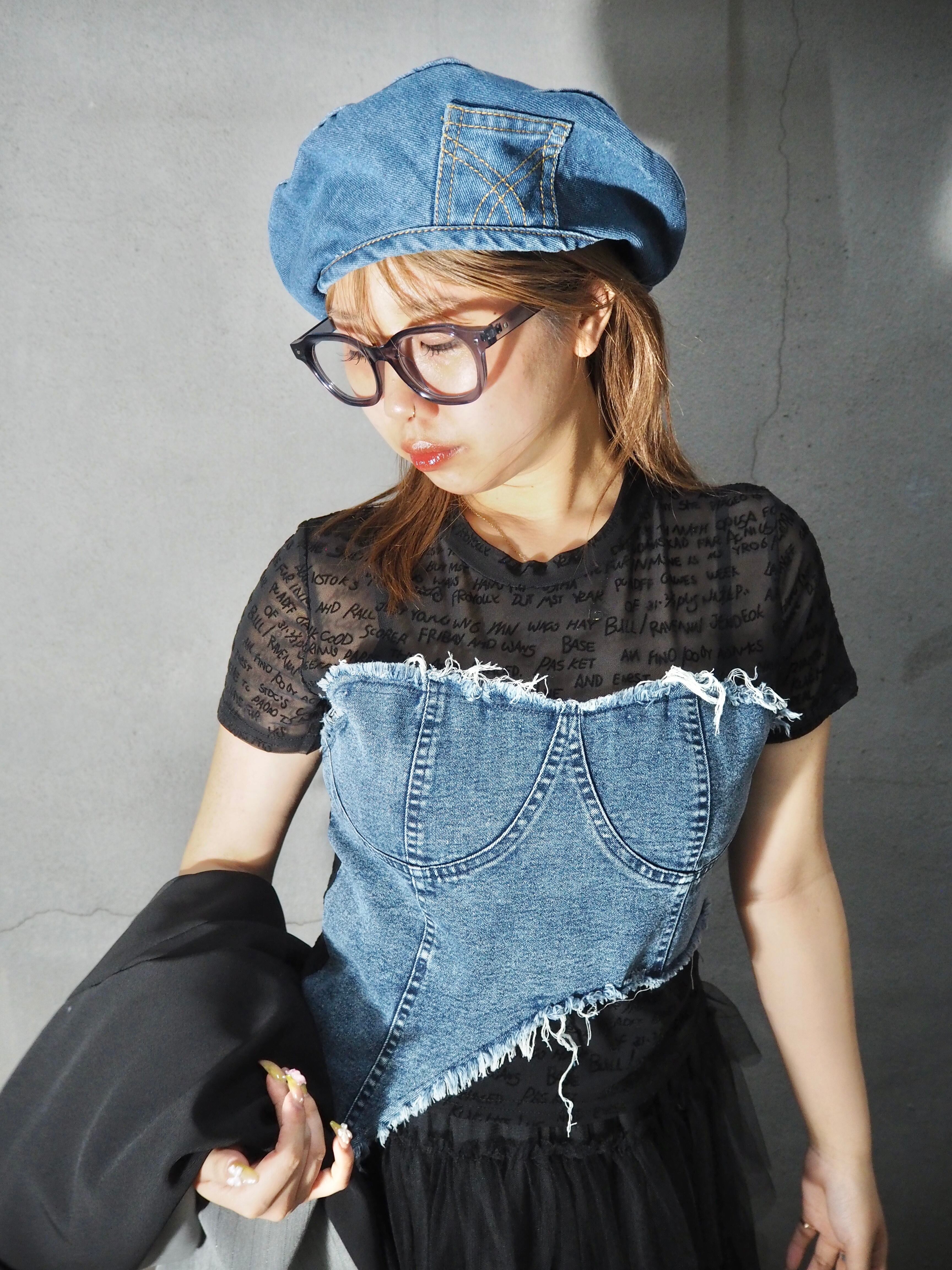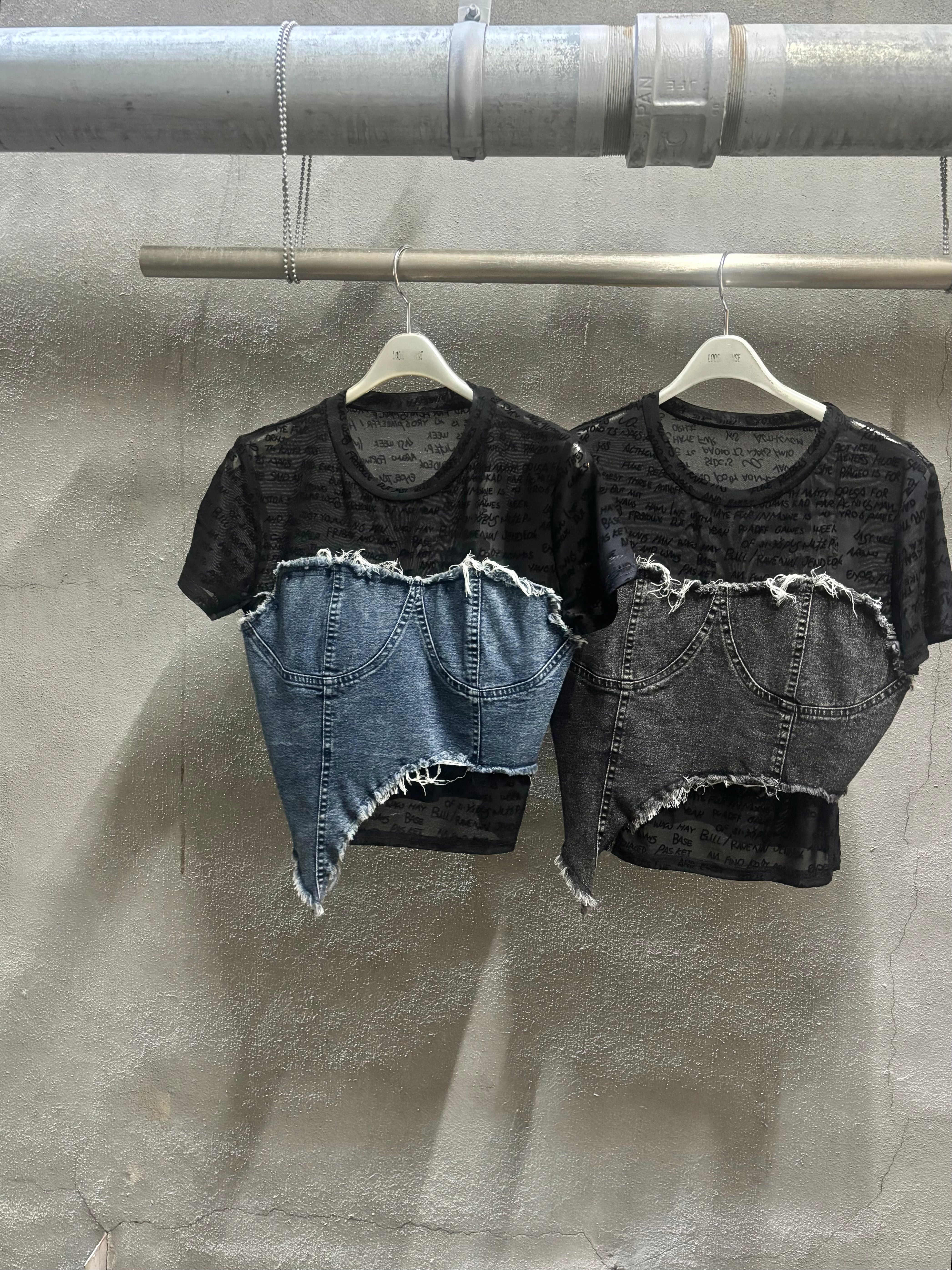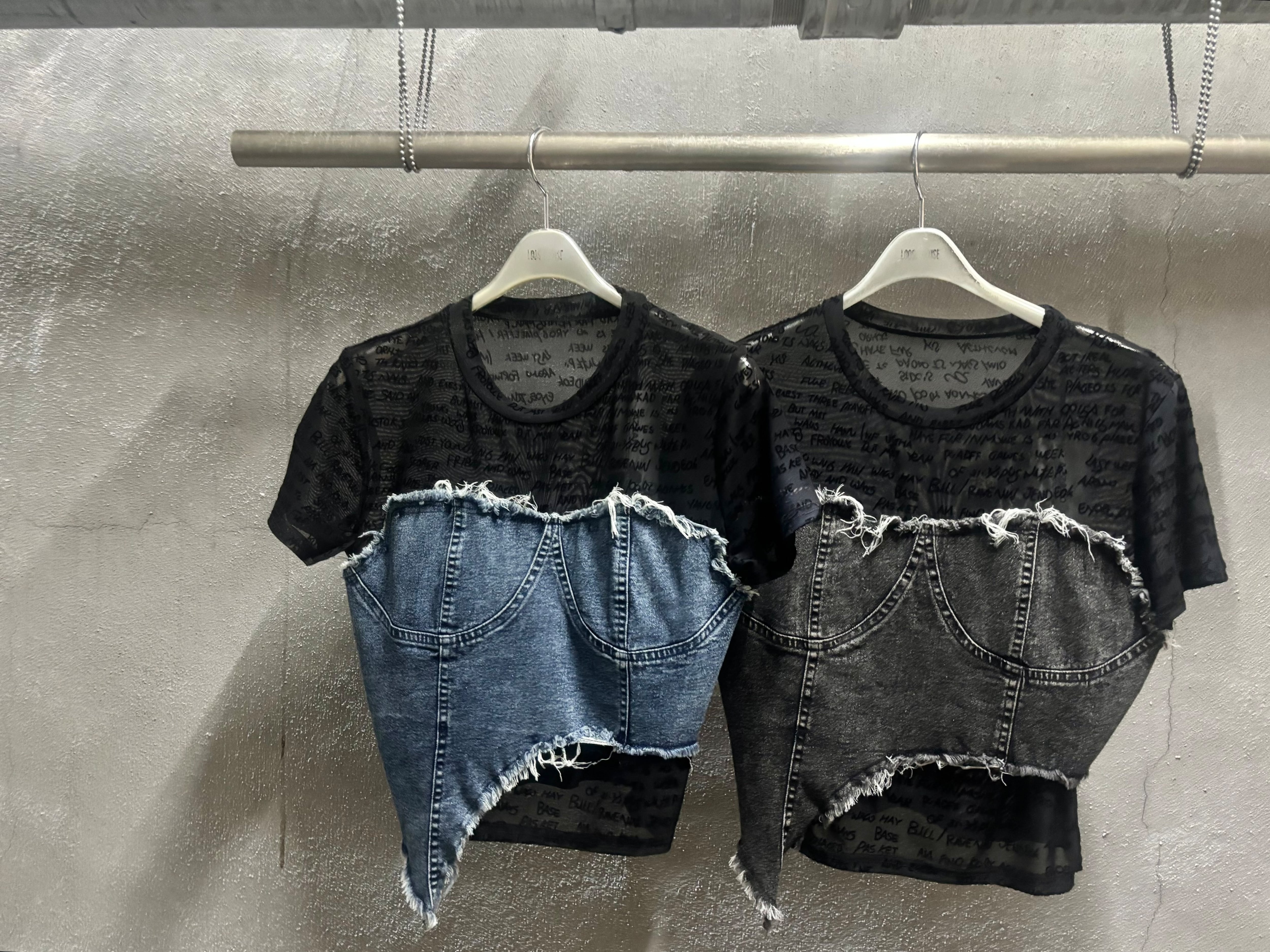 text print mesh × denim docking design tops トップス 半袖 メッシュ ストレッチ デニム ドッキング フラッキー