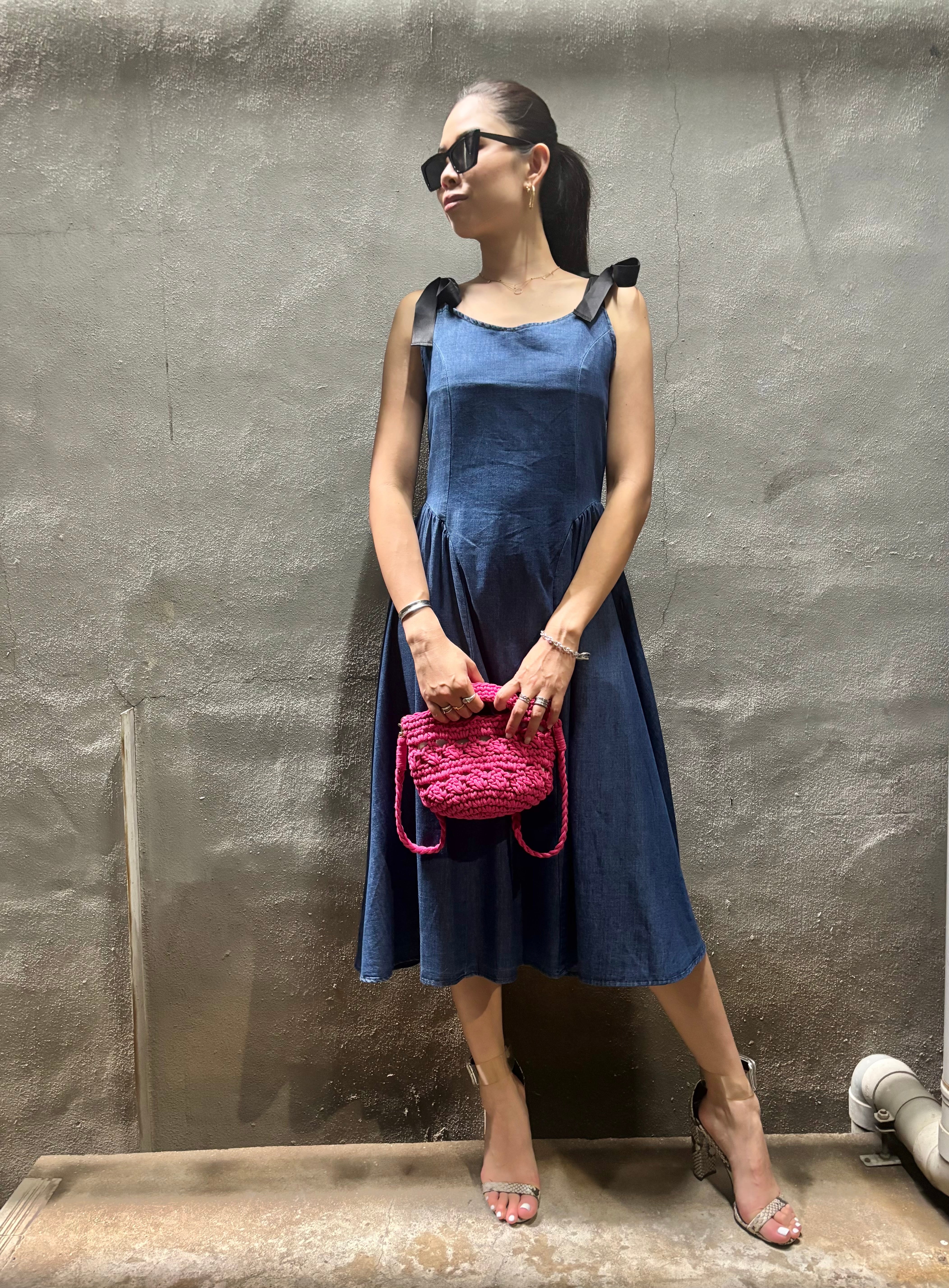 デニム素材を使用したこのワンピースは、ノースリーブデザインで、リボンの肩紐が特徴的♪