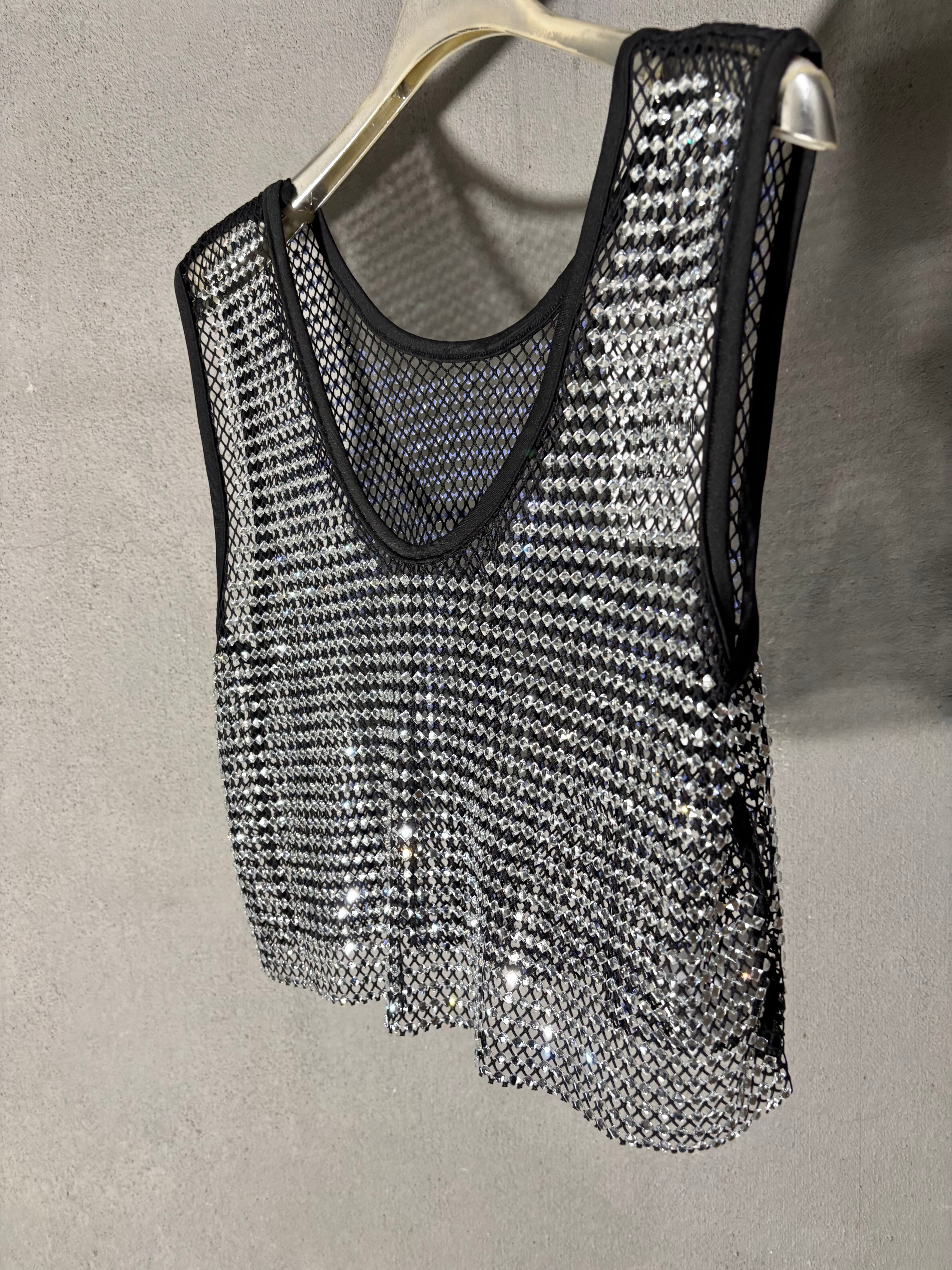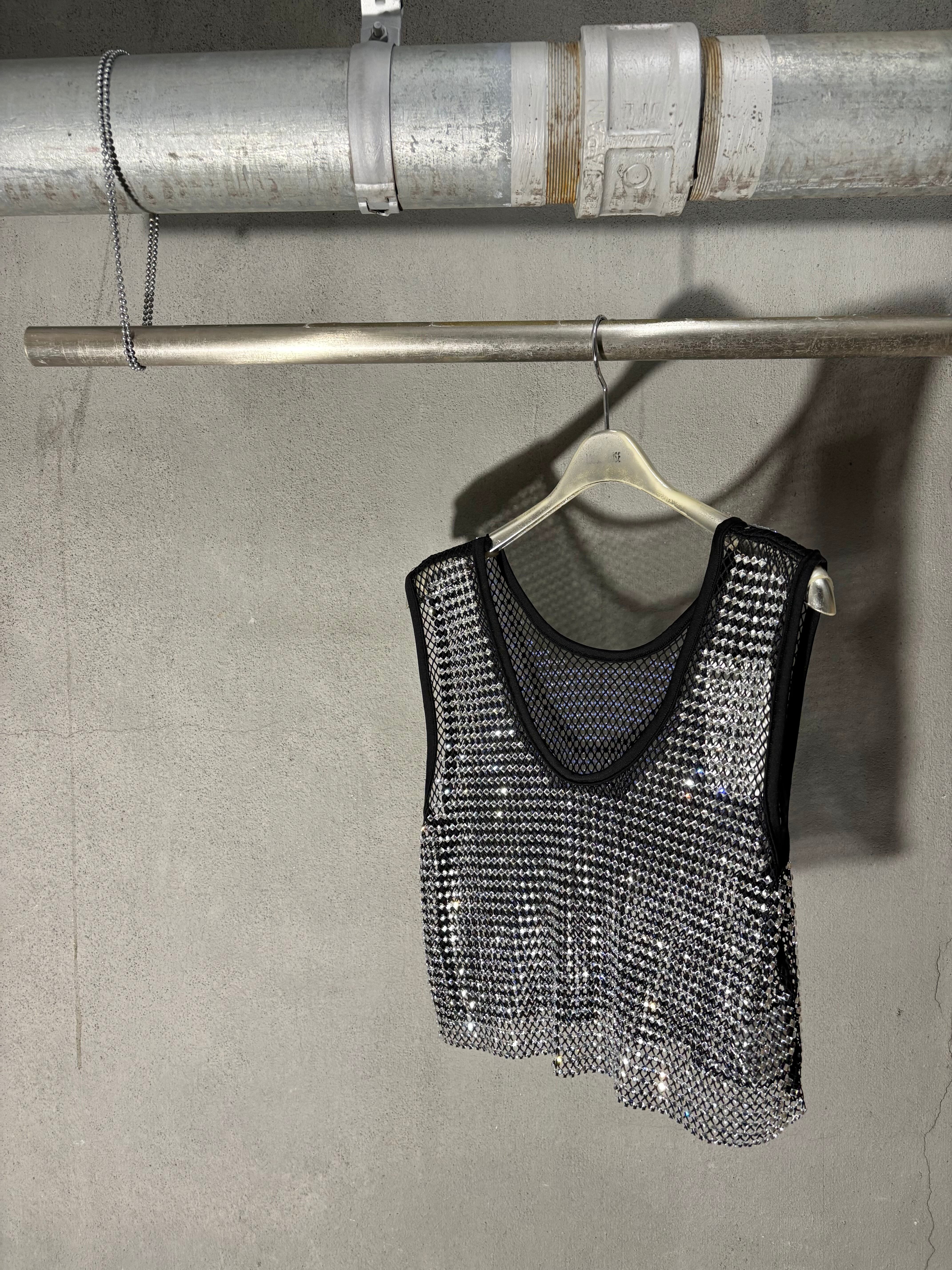 スクエア型のクリスタルが煌めく、美しいメッシュタンクトップです。