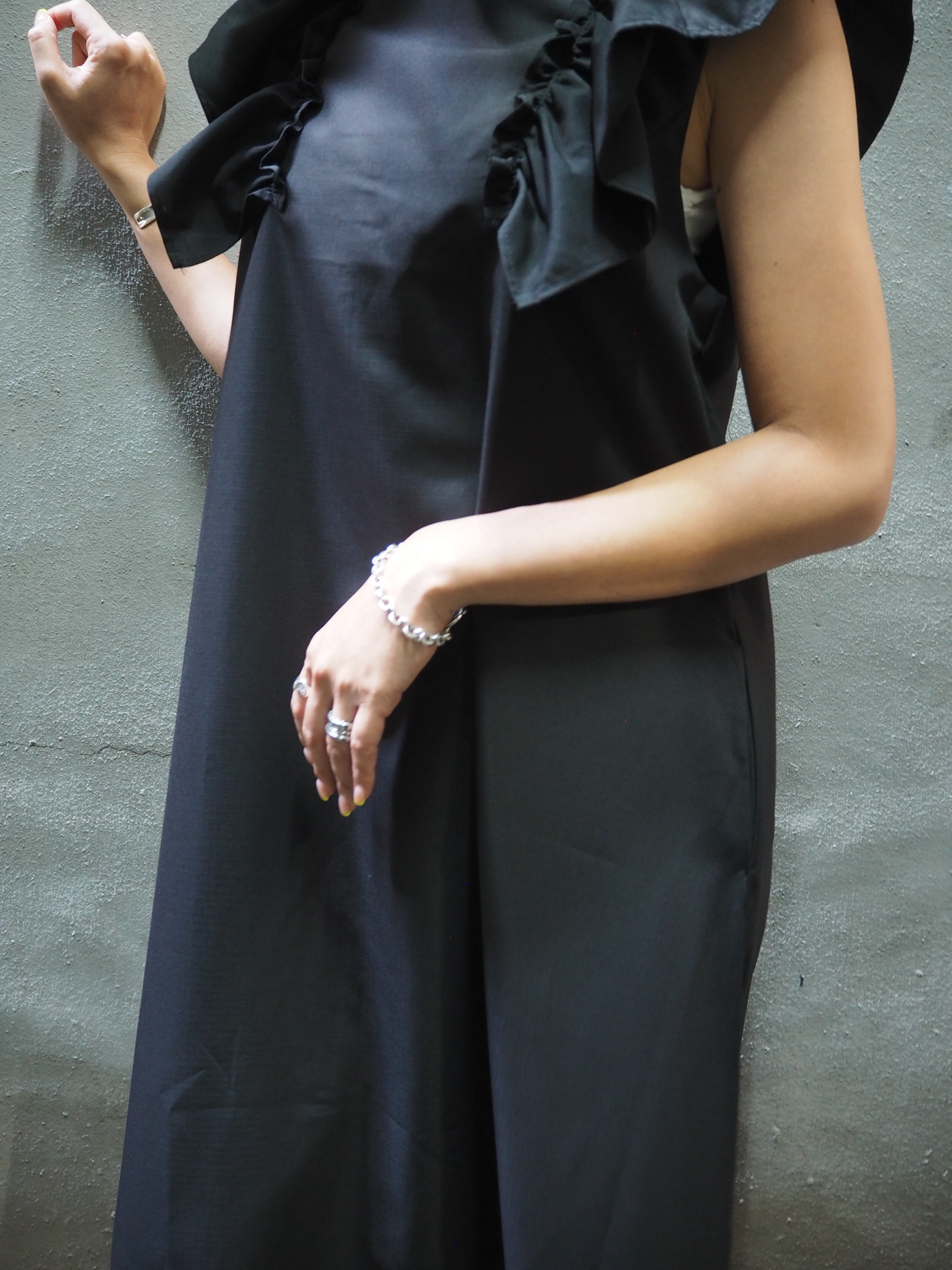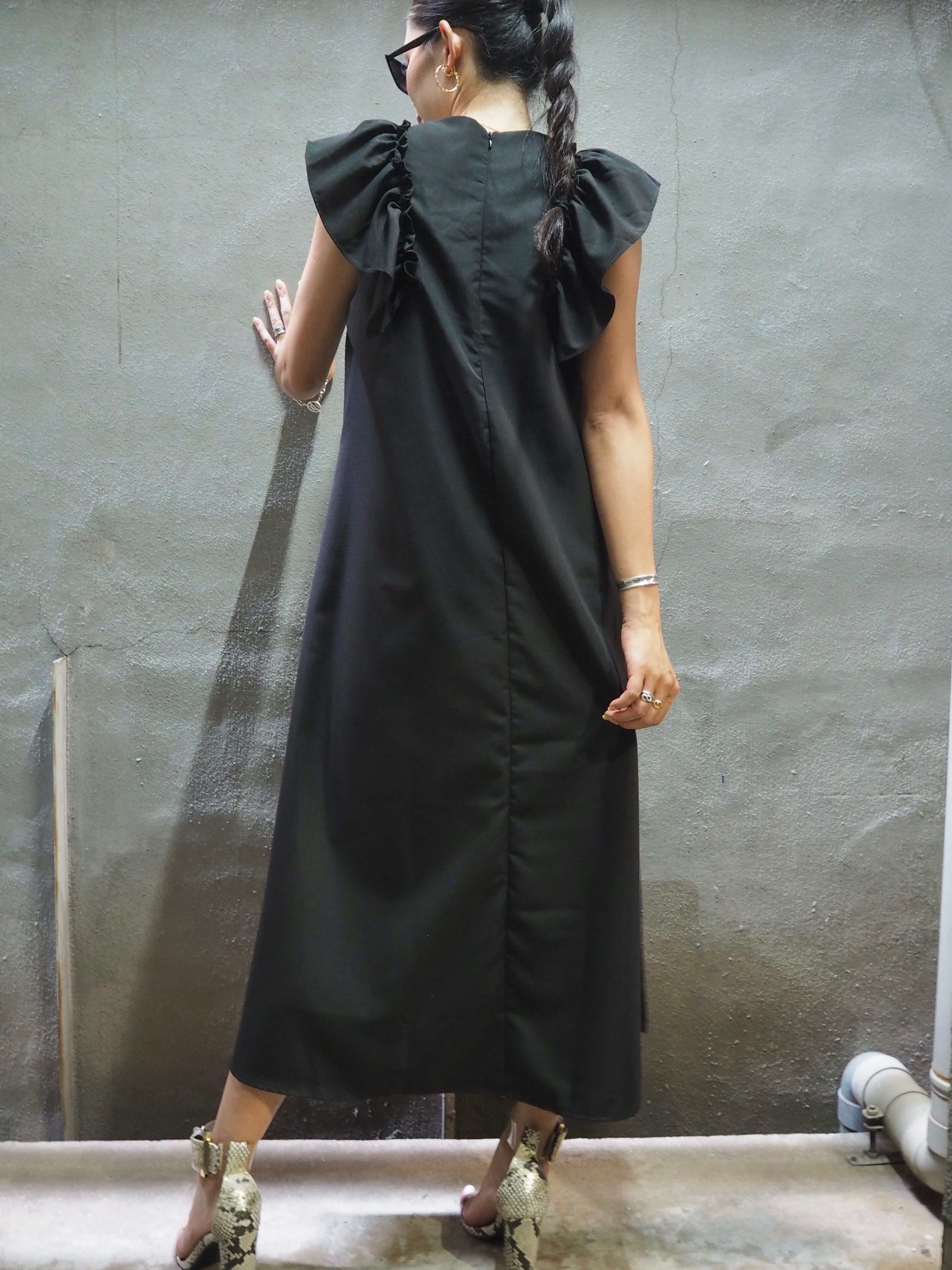 frill sleeve A-silhouette long one-piece ワンピーAライン ブラック 黒 フリル