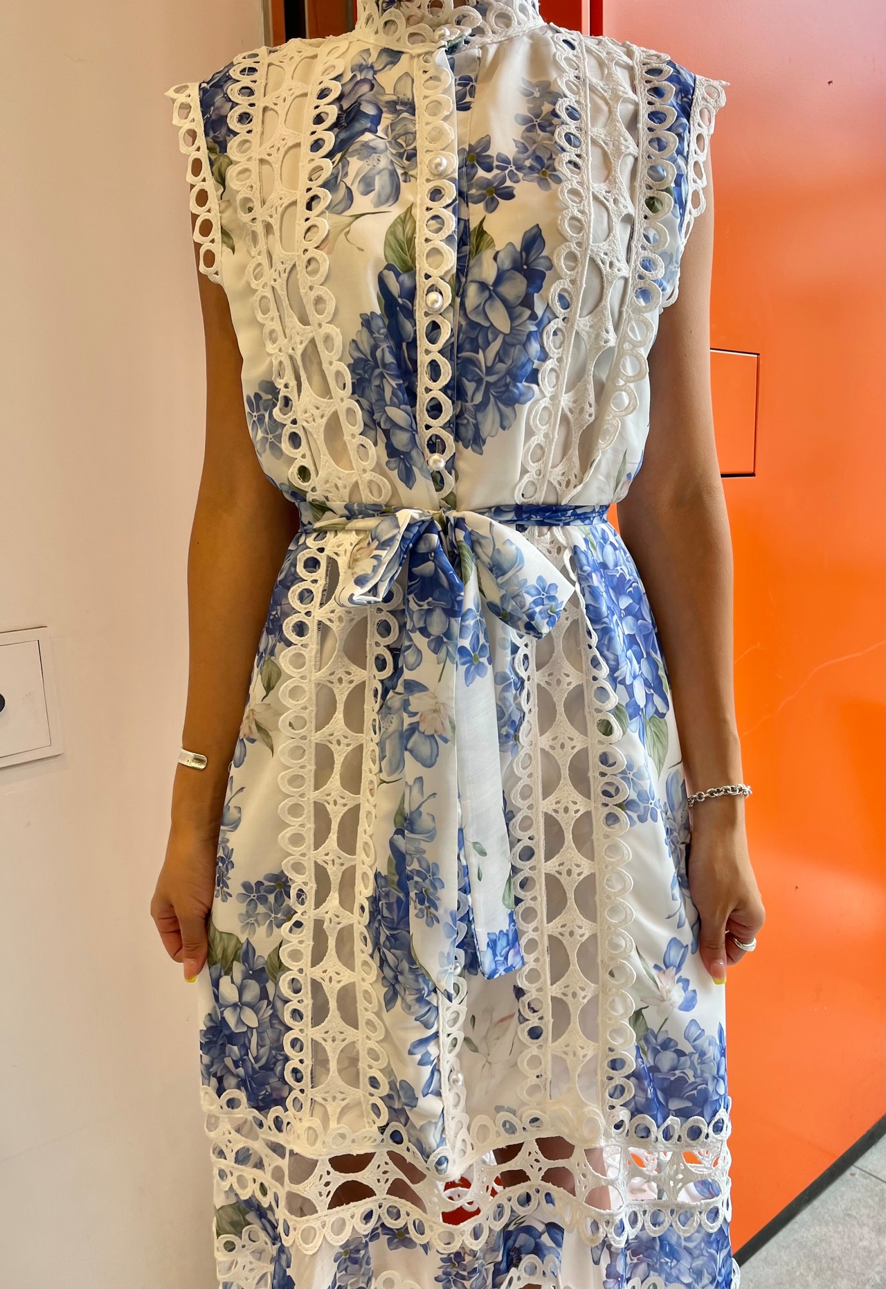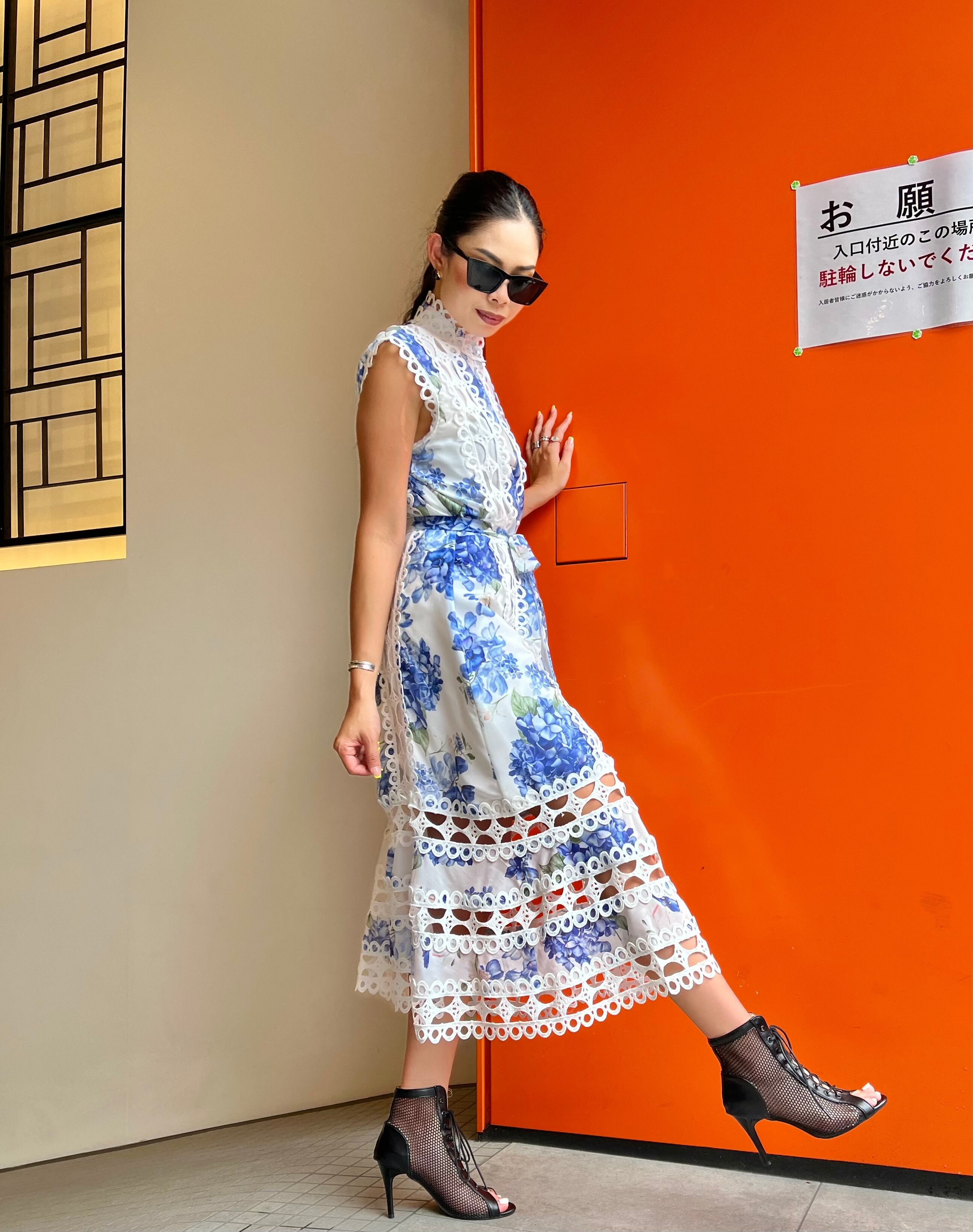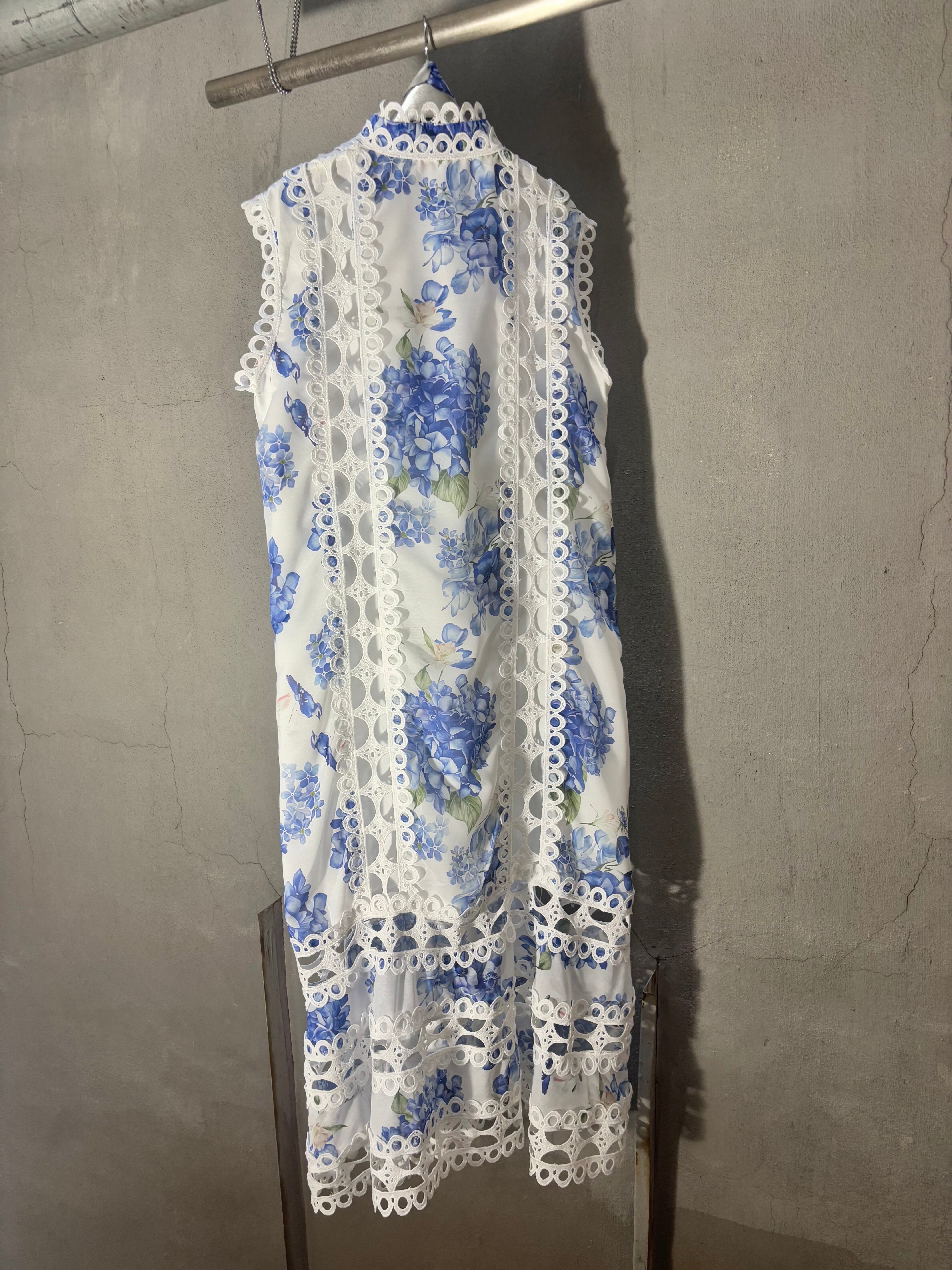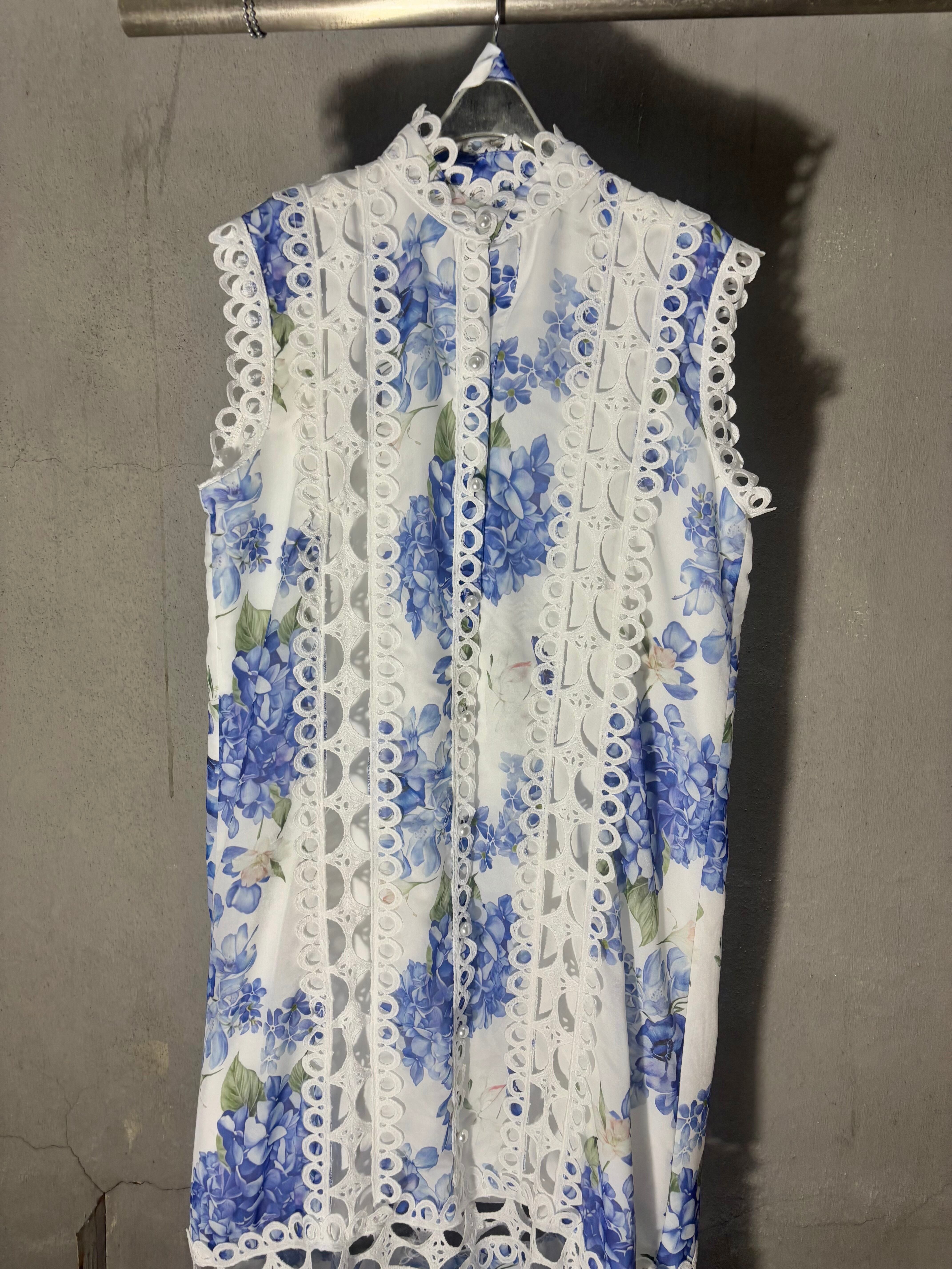 flower print × lace change design one-piece ワンピース ワンピ ドレス ノースリーブ 紫陽花 花柄 レース リボンベルト