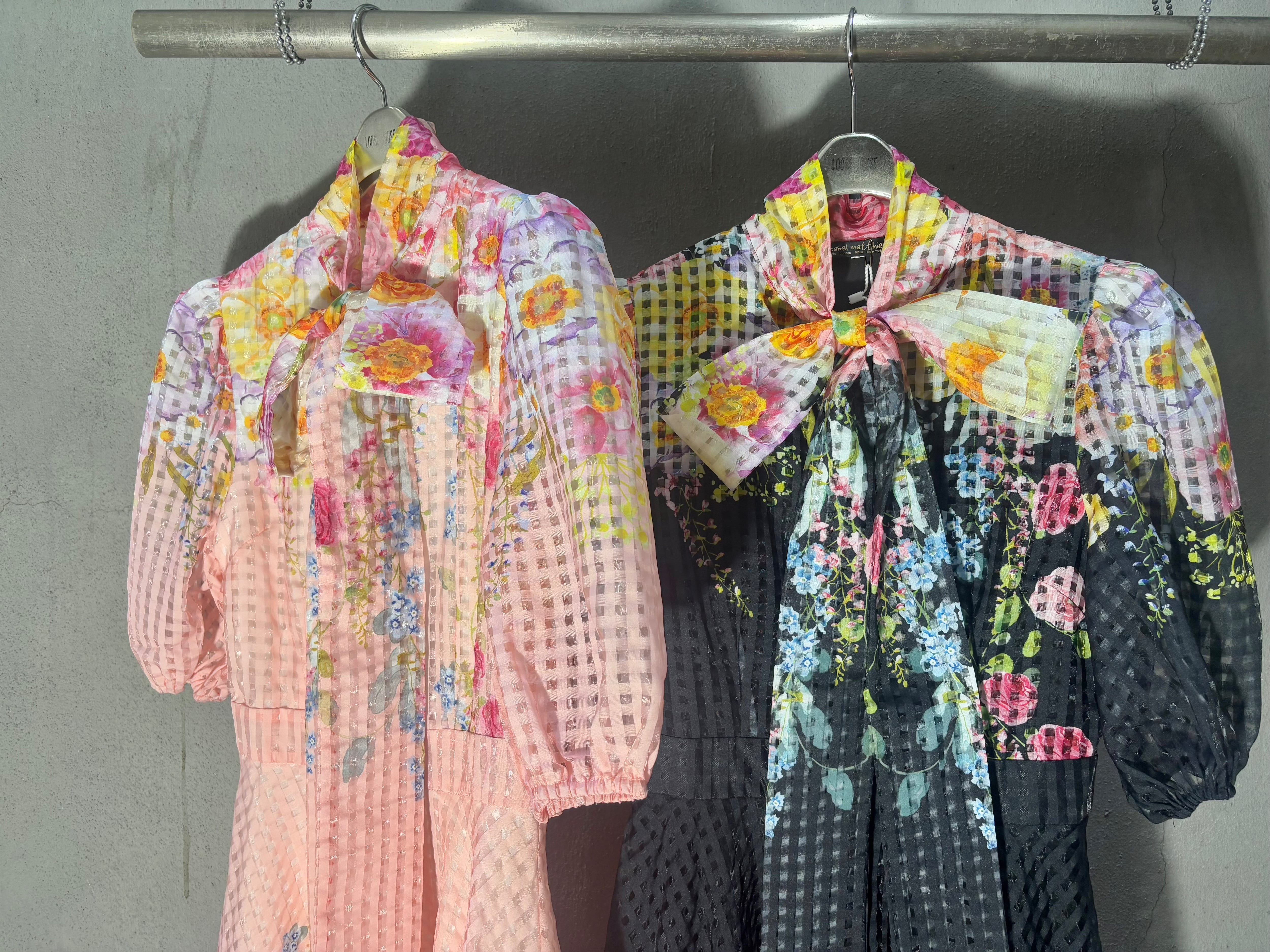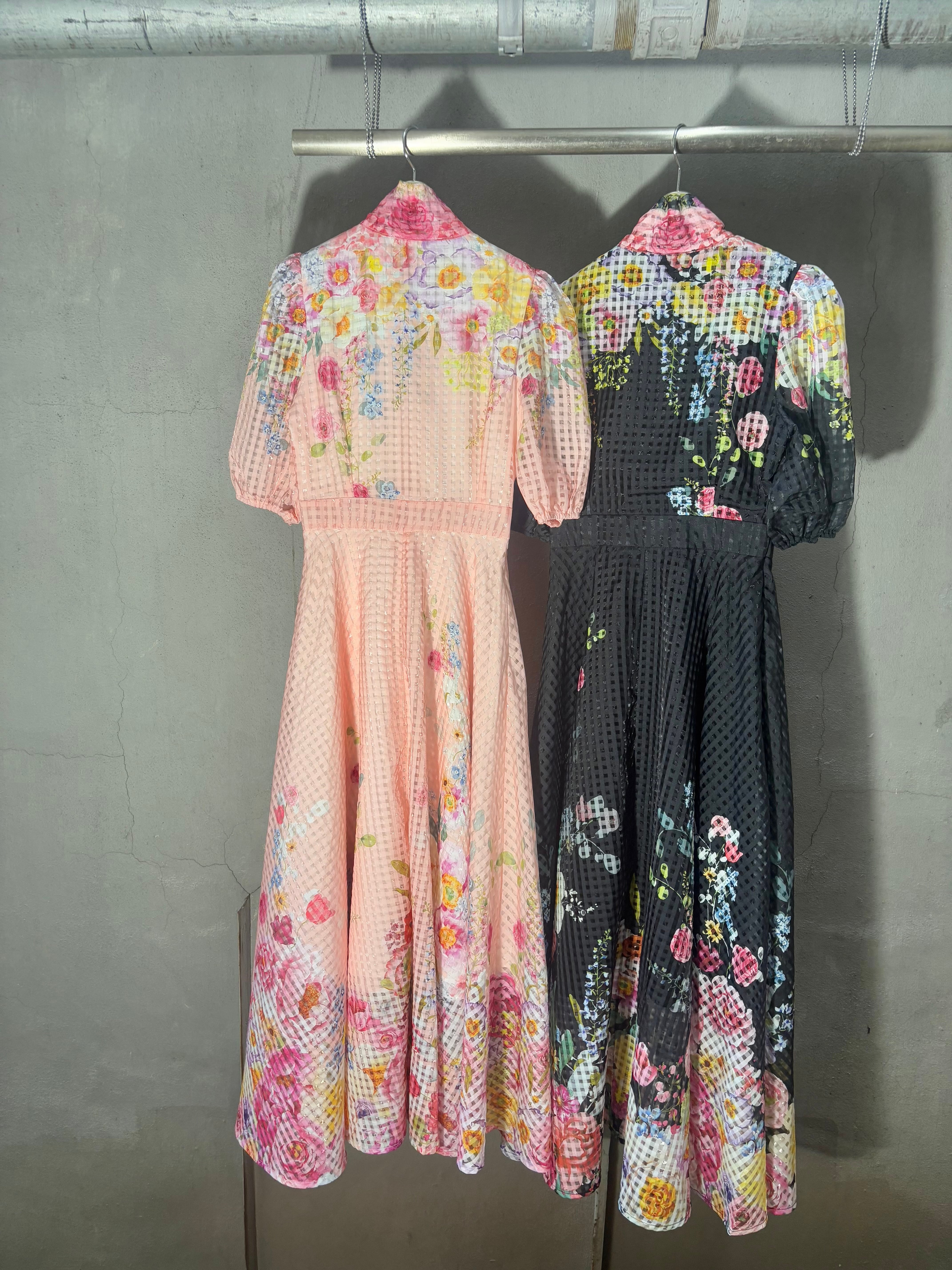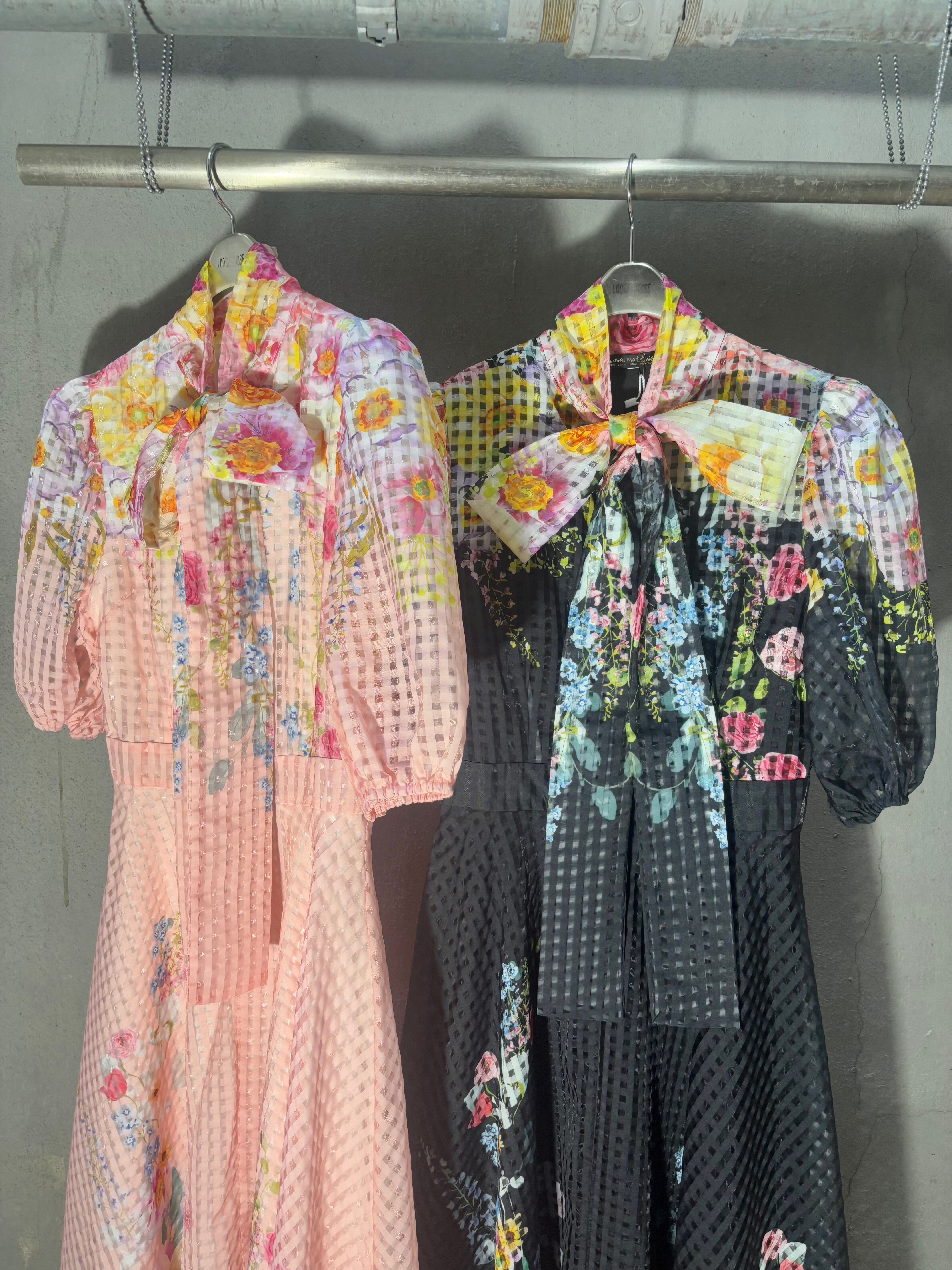 flower print × see-through check bow-tie ribbon design one-piece ワンピース ドレス ロングワンピ 花柄 シースルー ボウタイ リボン 半袖