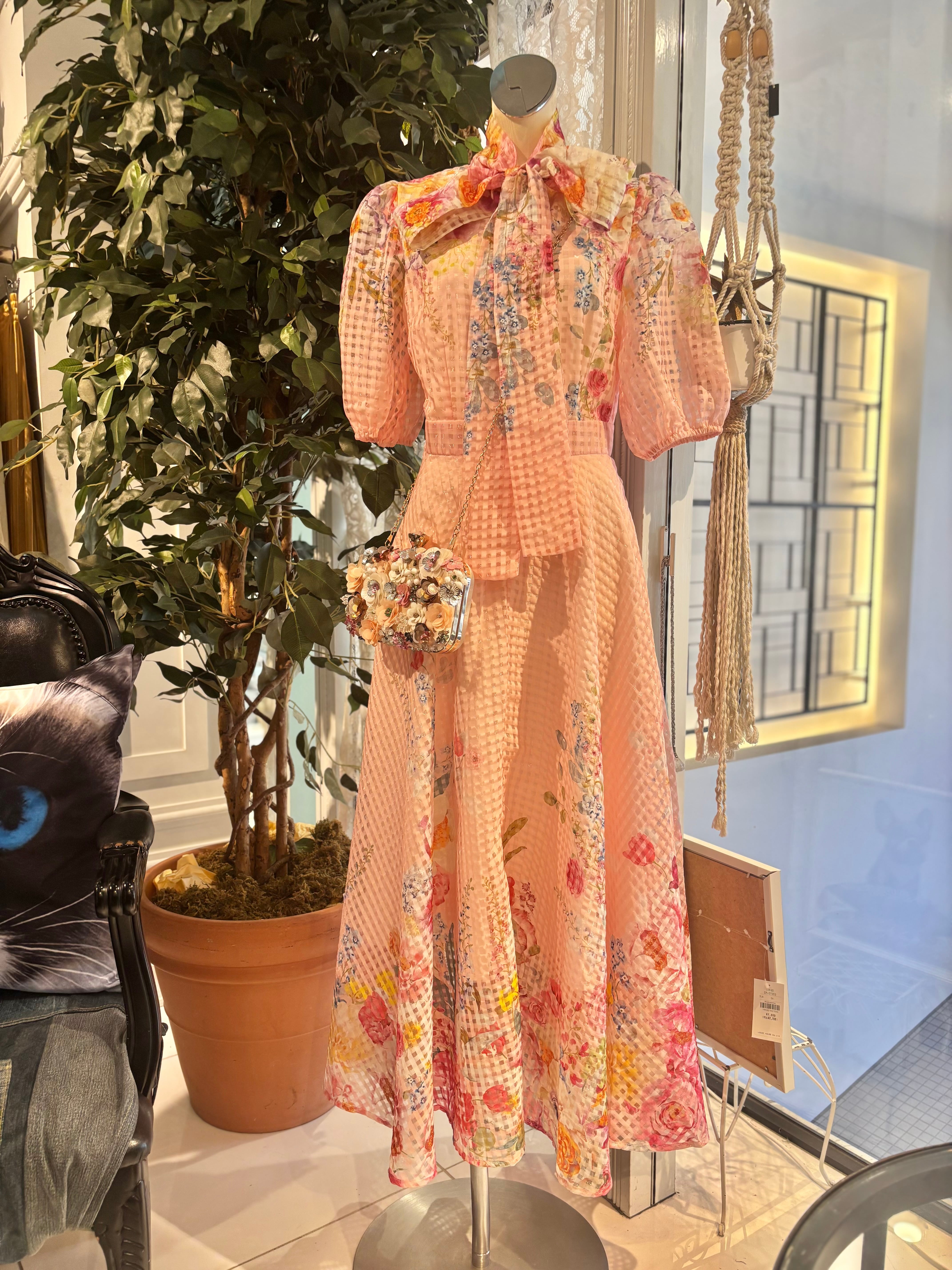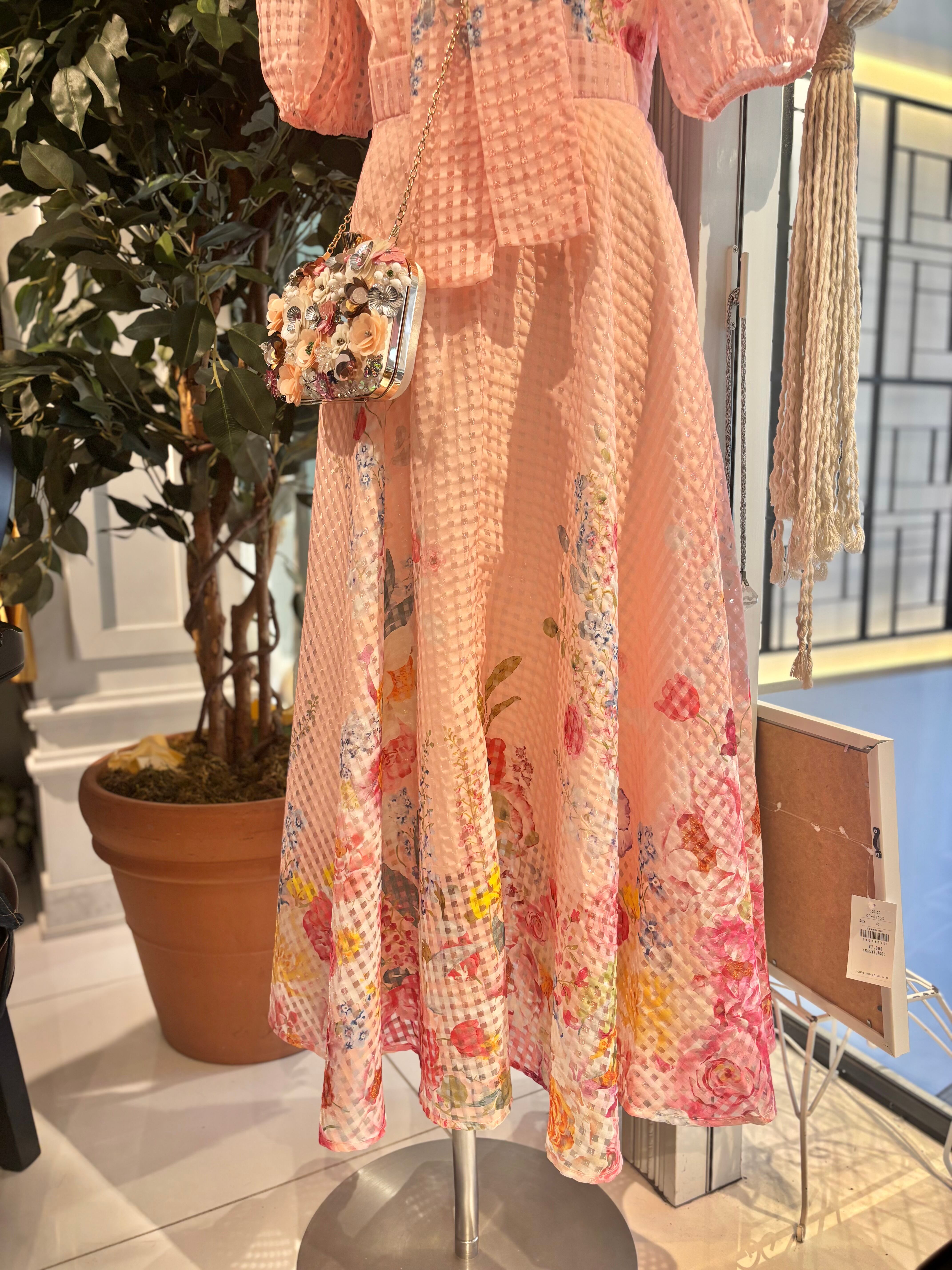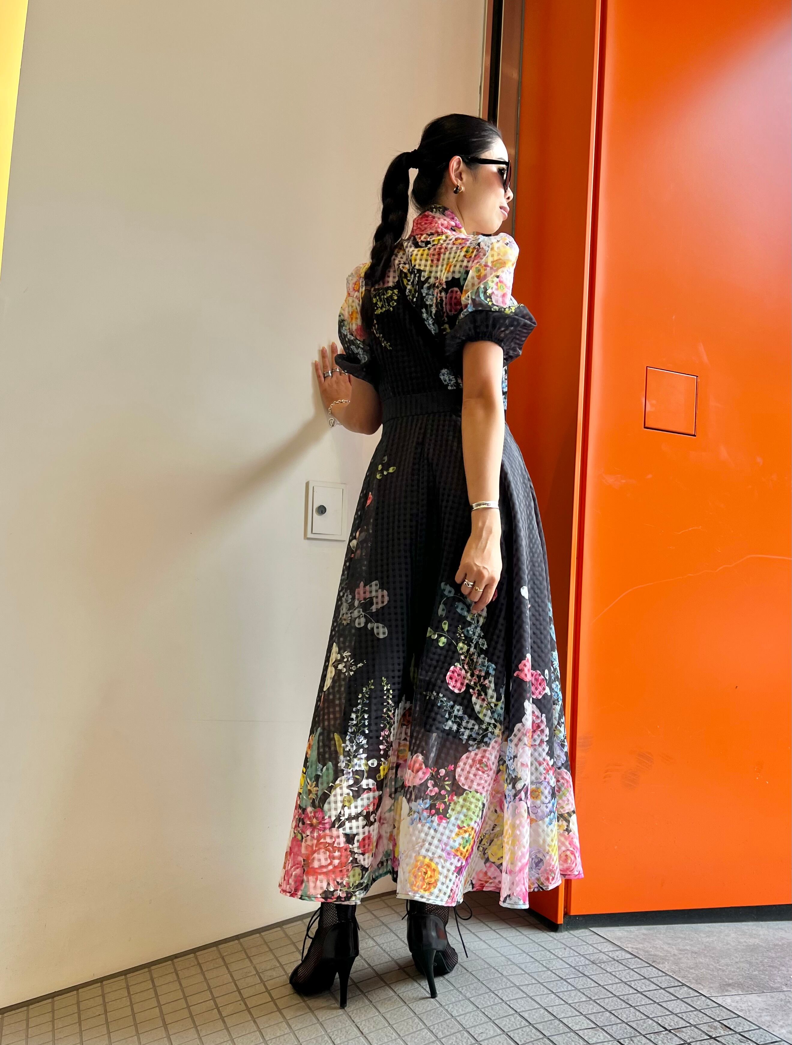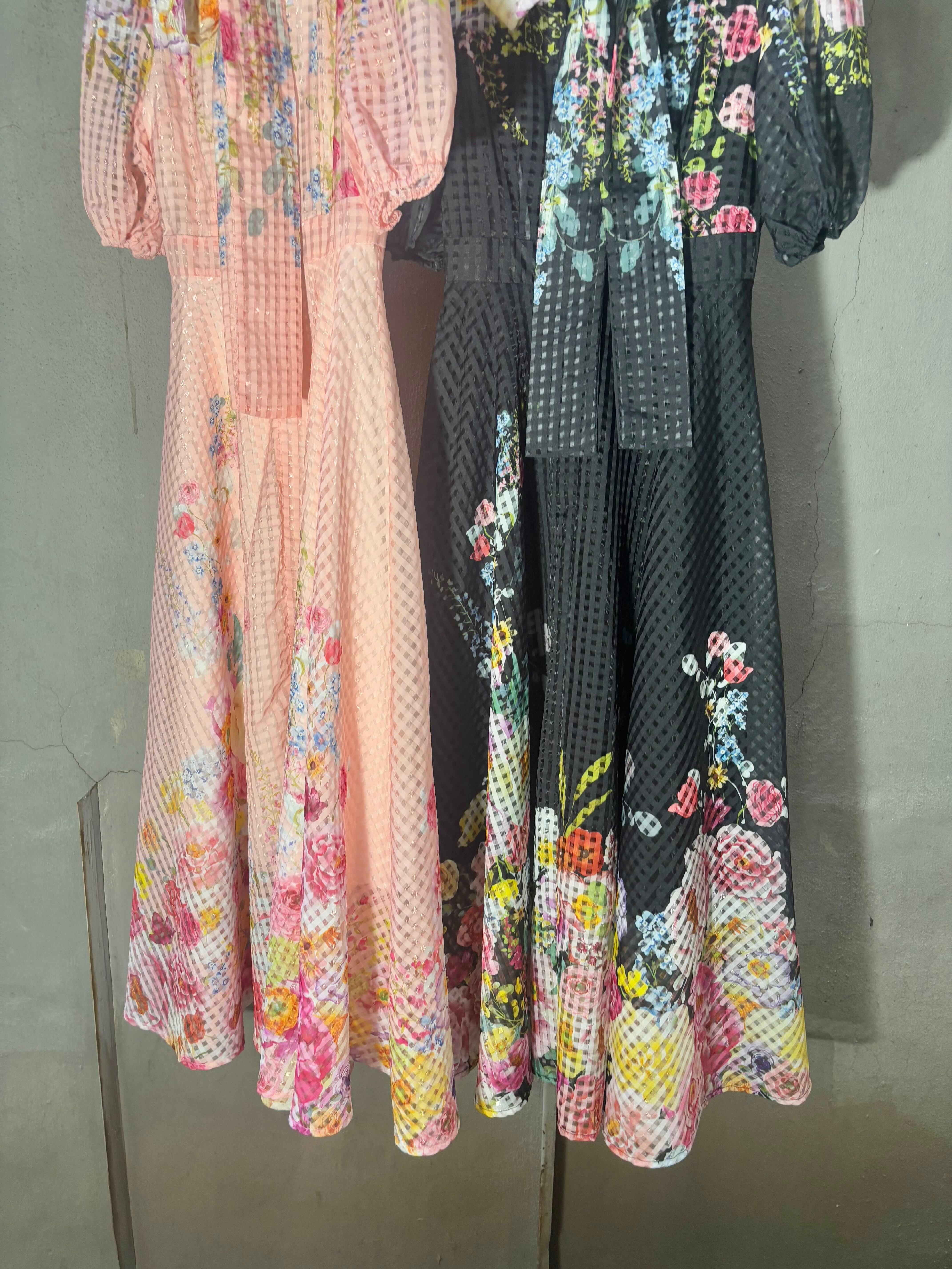 flower print × see-through check bow-tie ribbon design one-piece ワンピース ドレス ロングワンピ 花柄 シースルー ボウタイ リボン 半袖