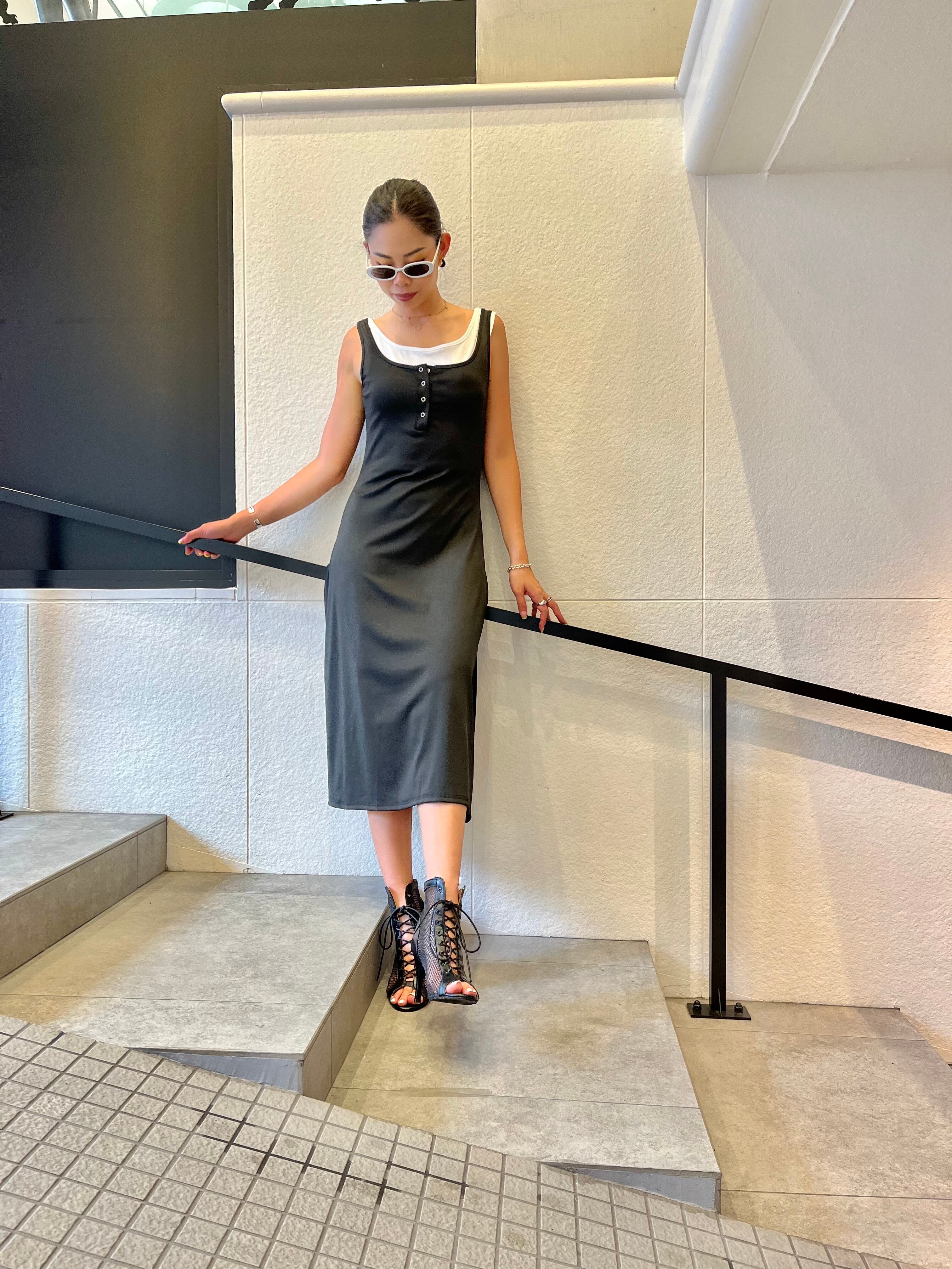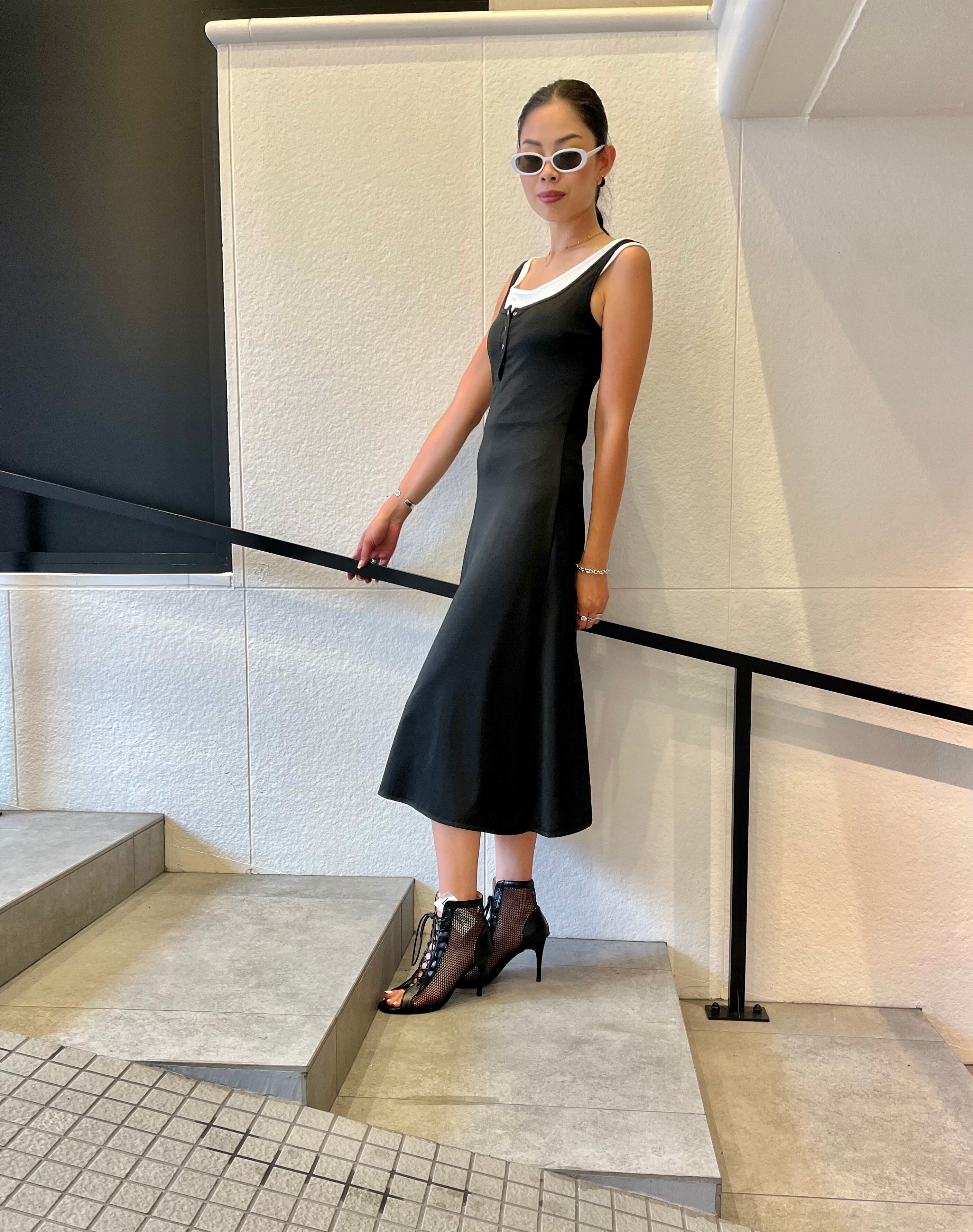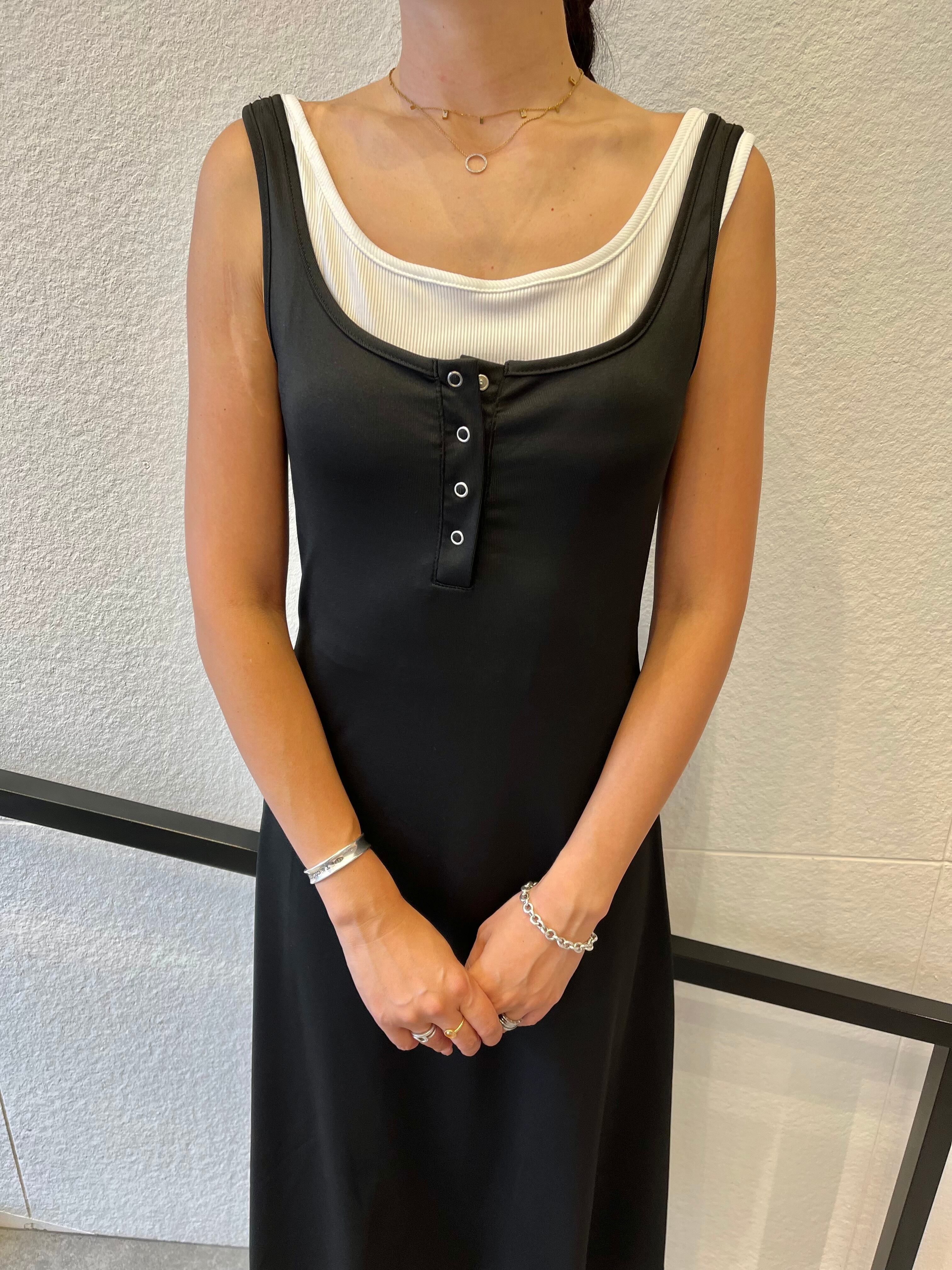 long one-piece ワンピース ワンピ 重ね着風 ブラック 黒 ストレッチ
