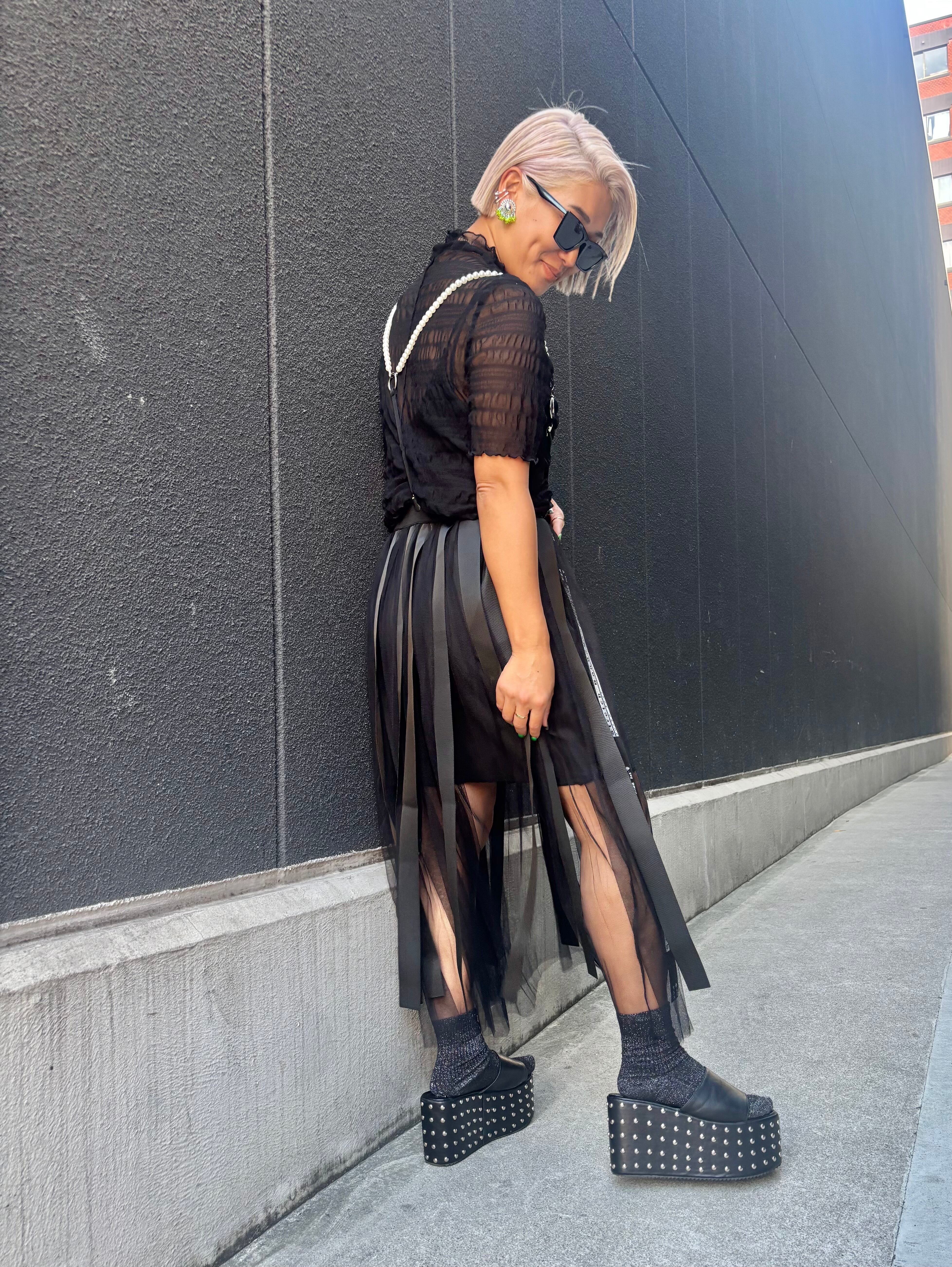 テープが重なった個性的なデザインが魅力のチュールスカートです♪