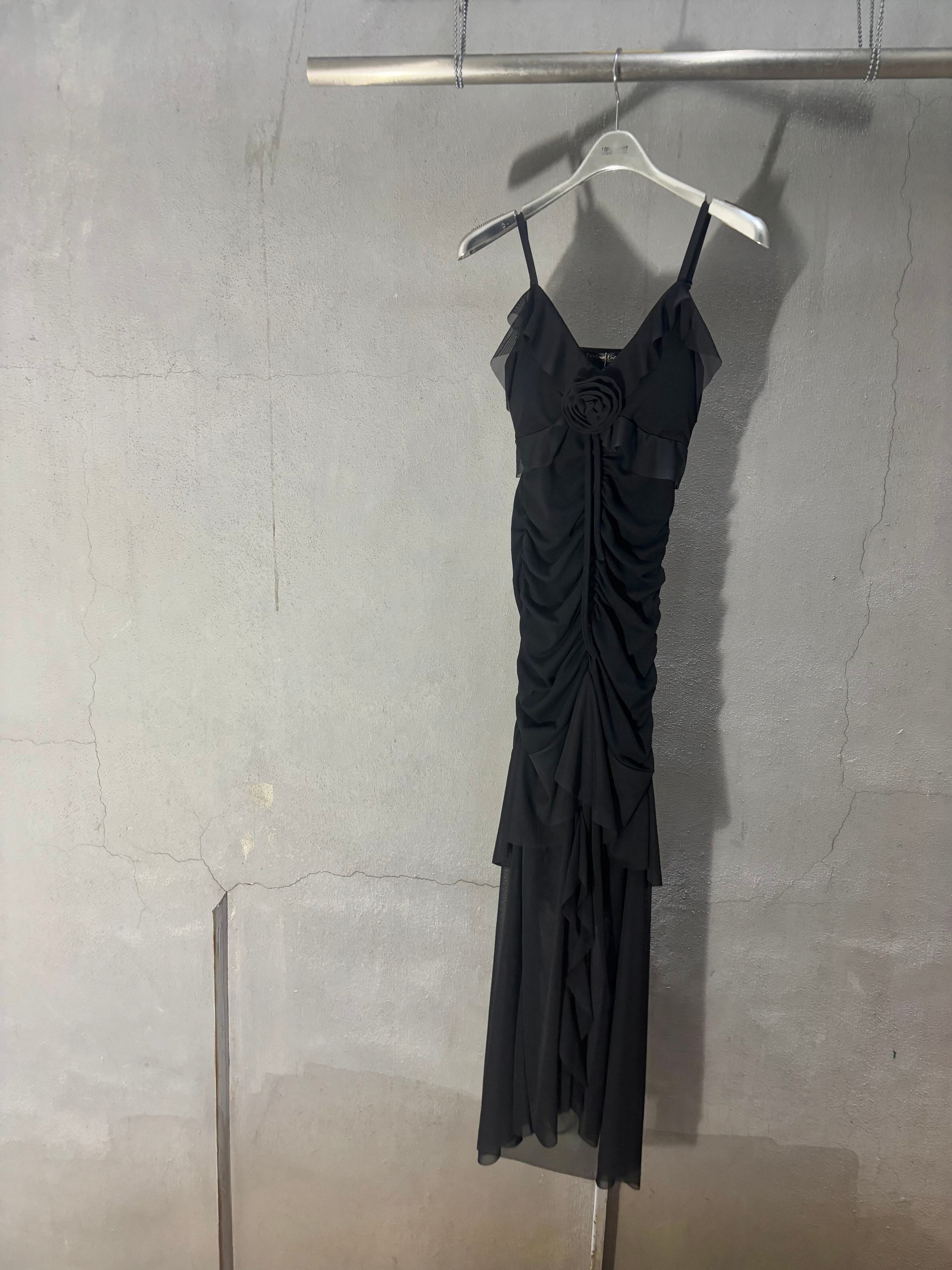 shirring mix tulle change design black one-piece ワンピース キャミワンピ シャーリング チュール 黒 ブラック ドレス
