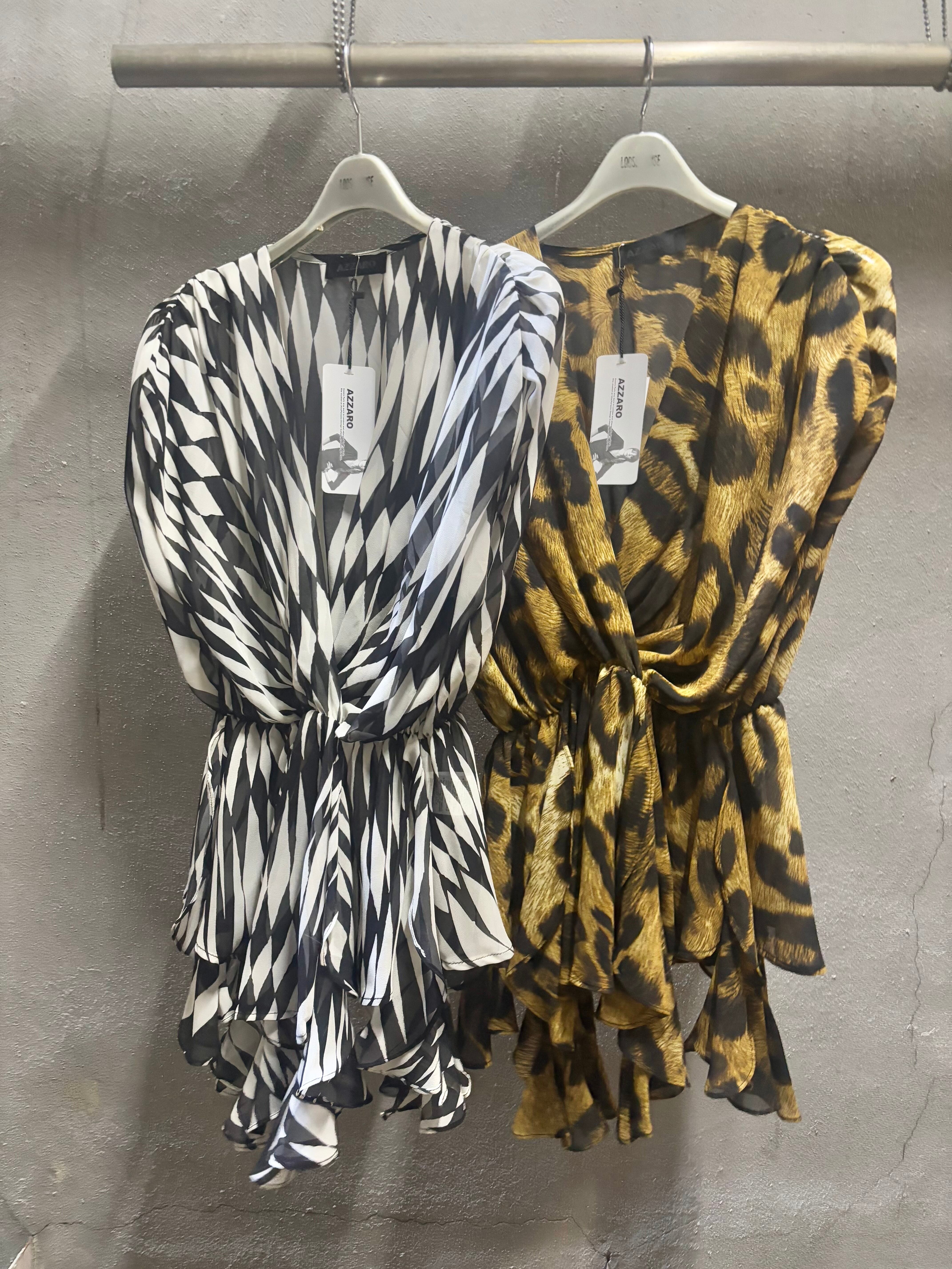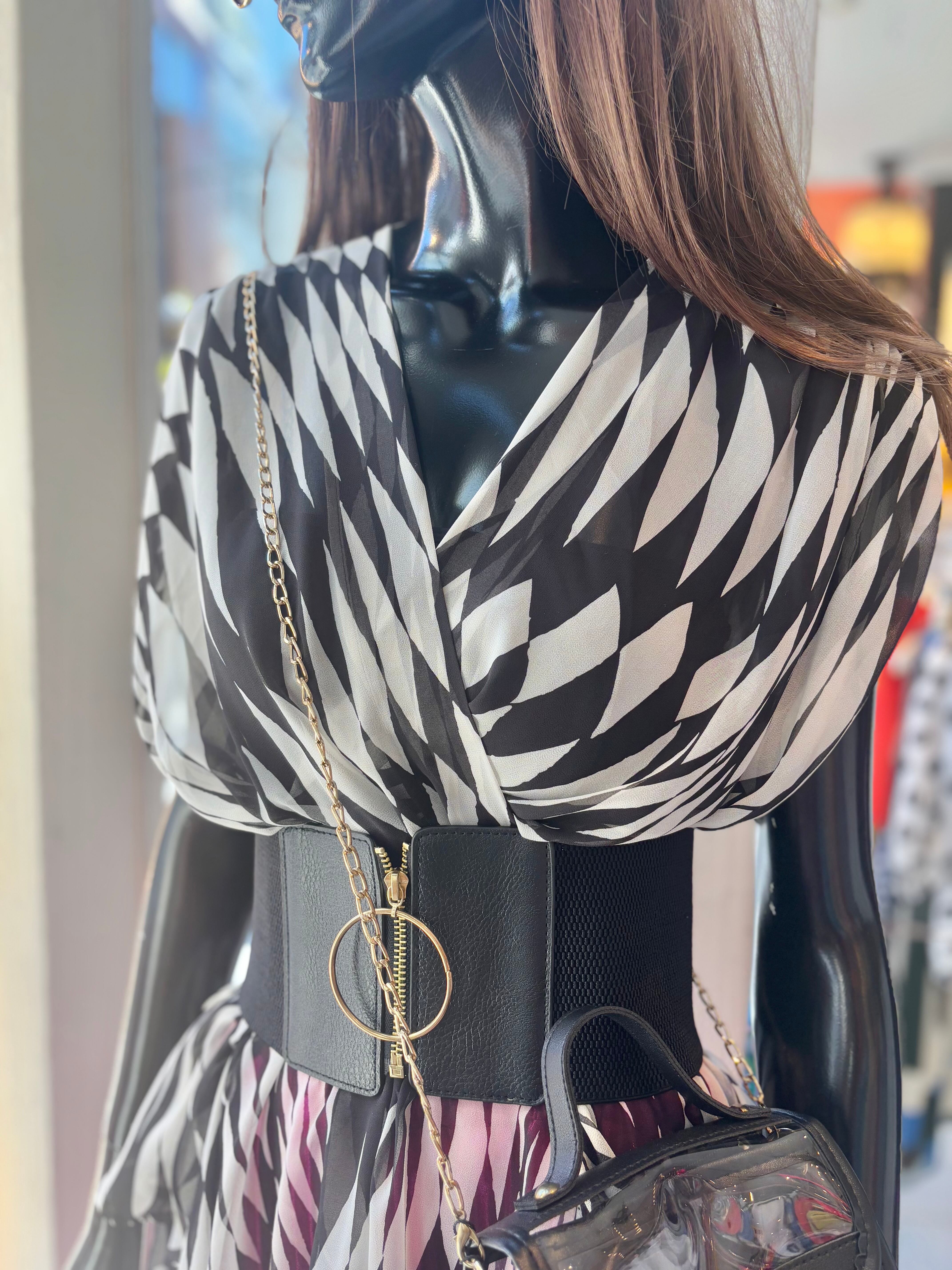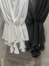カシュクール風のVネックデザインが顔周りをスッキリ見せ、おしゃれな印象を与えてくれます。普段使いや特別なシーンでも活躍間違いなしの一着です!