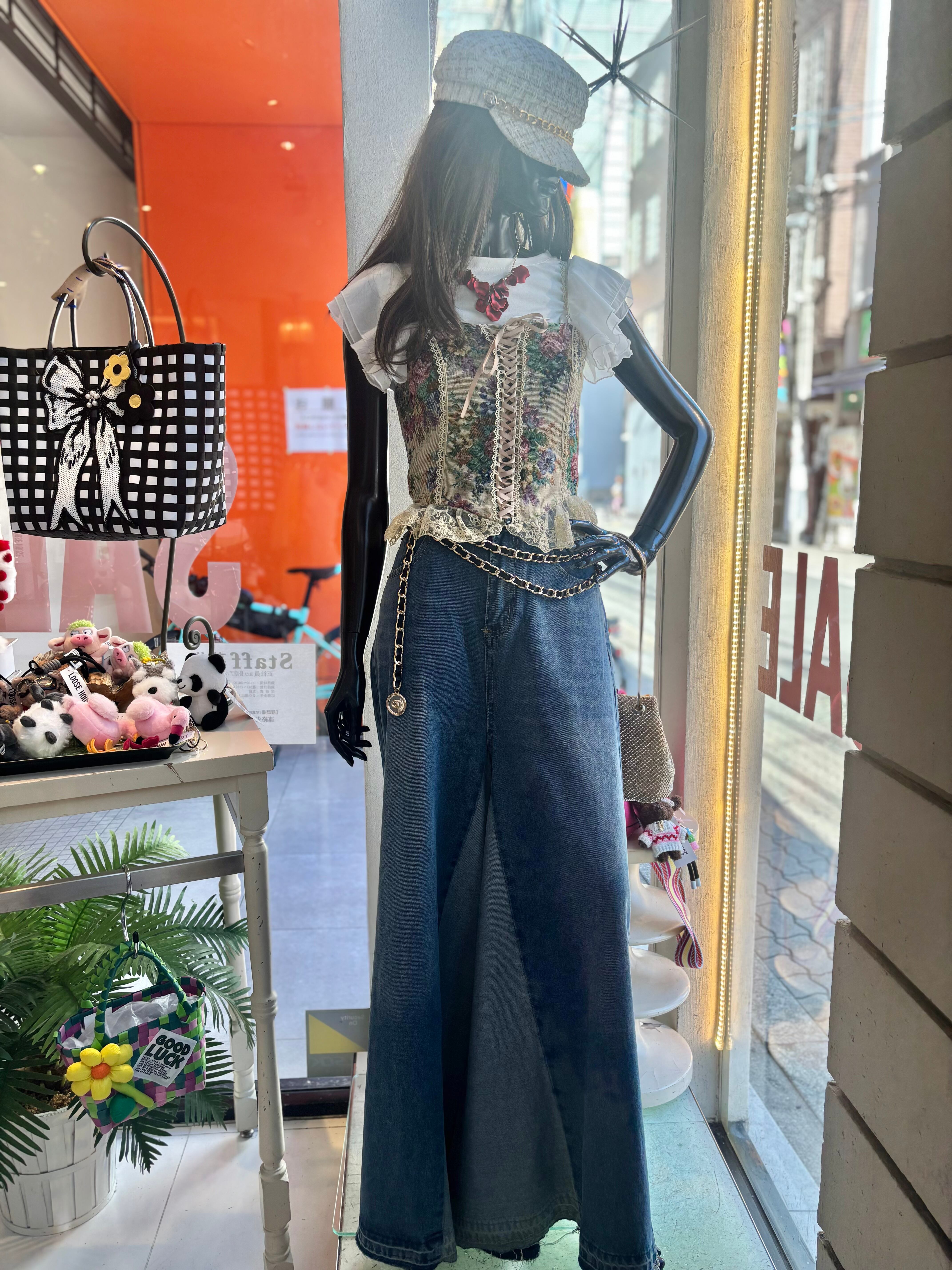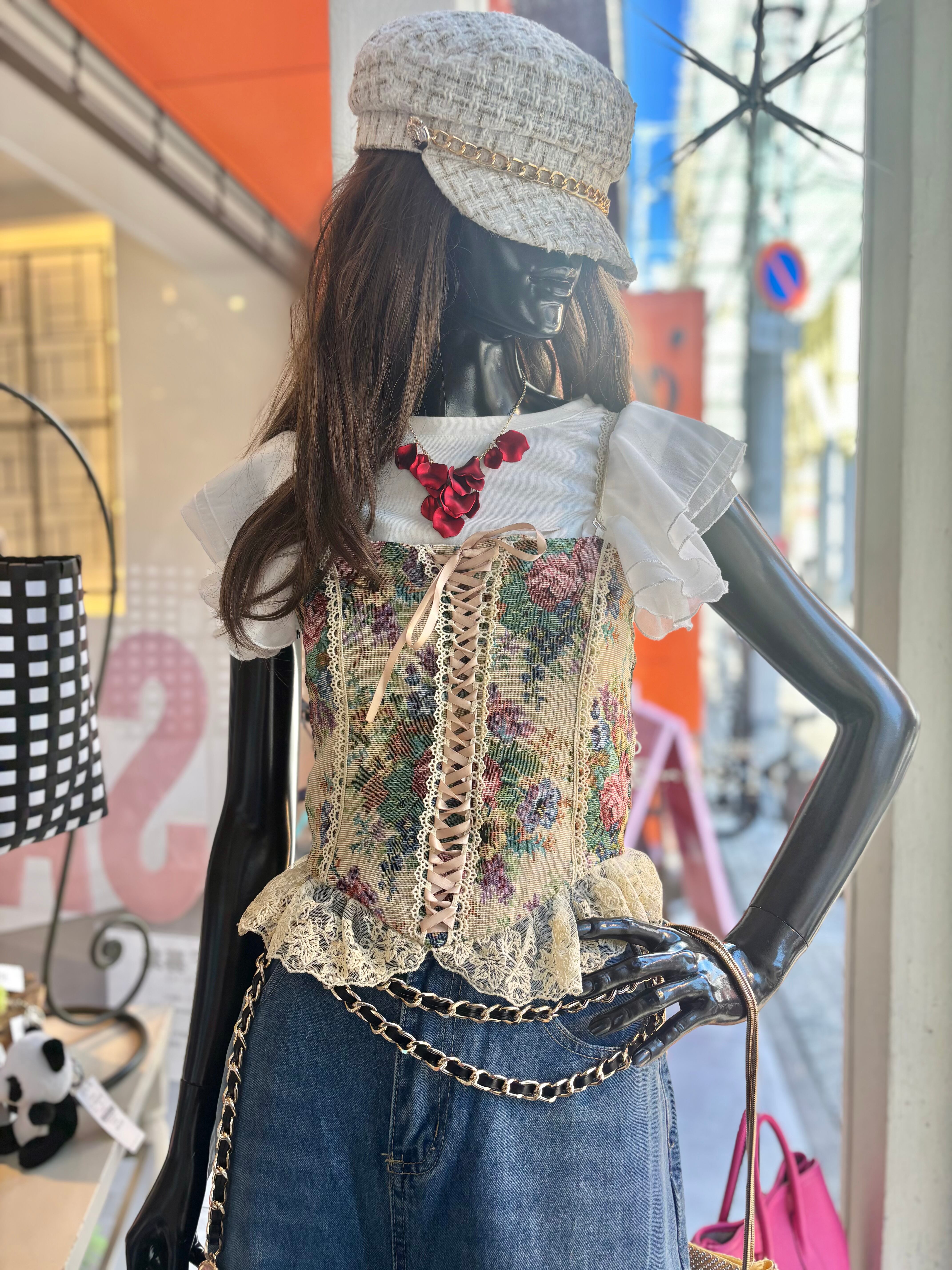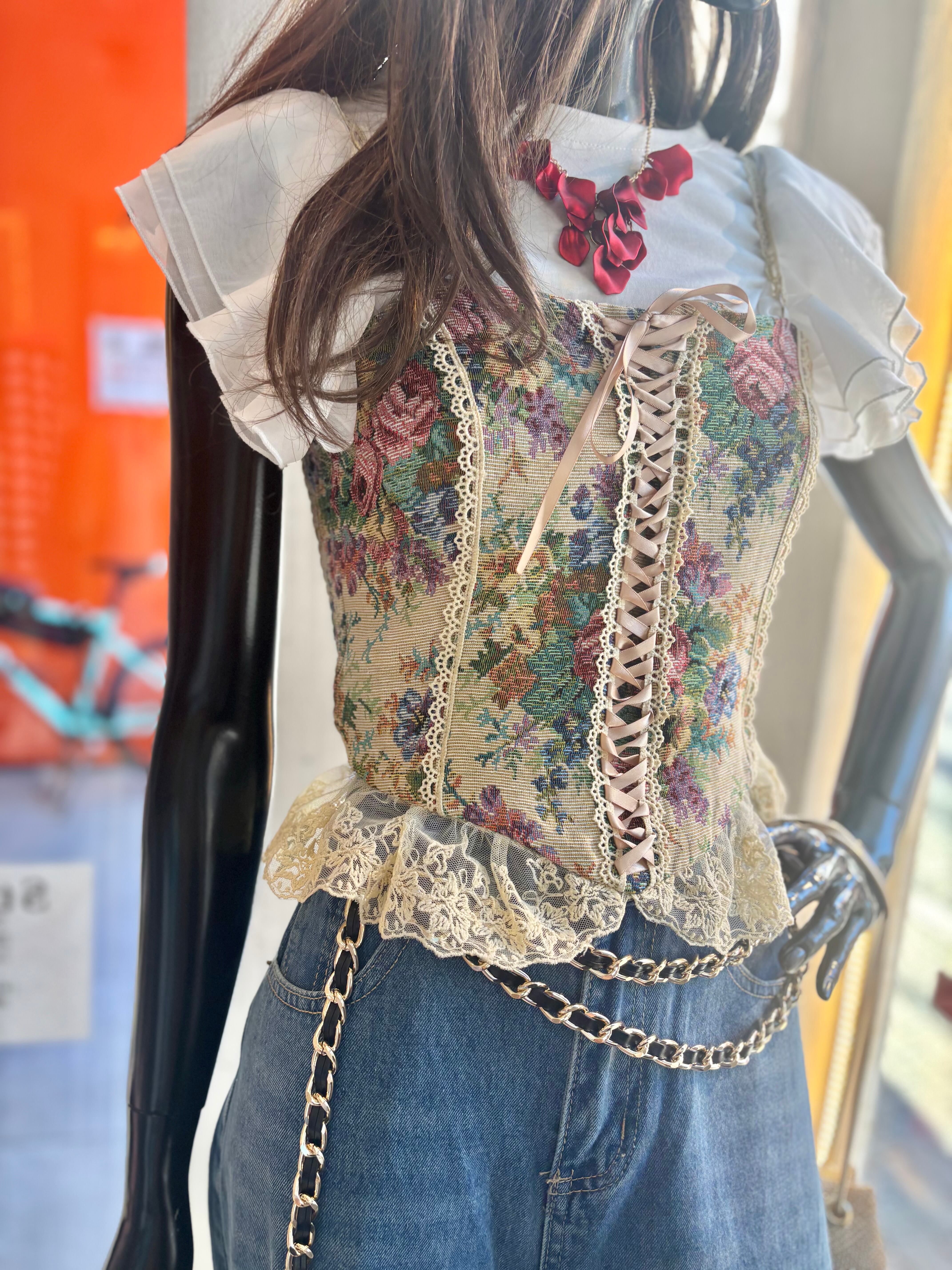 ゴブラン織り風の素材とレースアップデザインが絶妙に融合したこのビスチェは、
