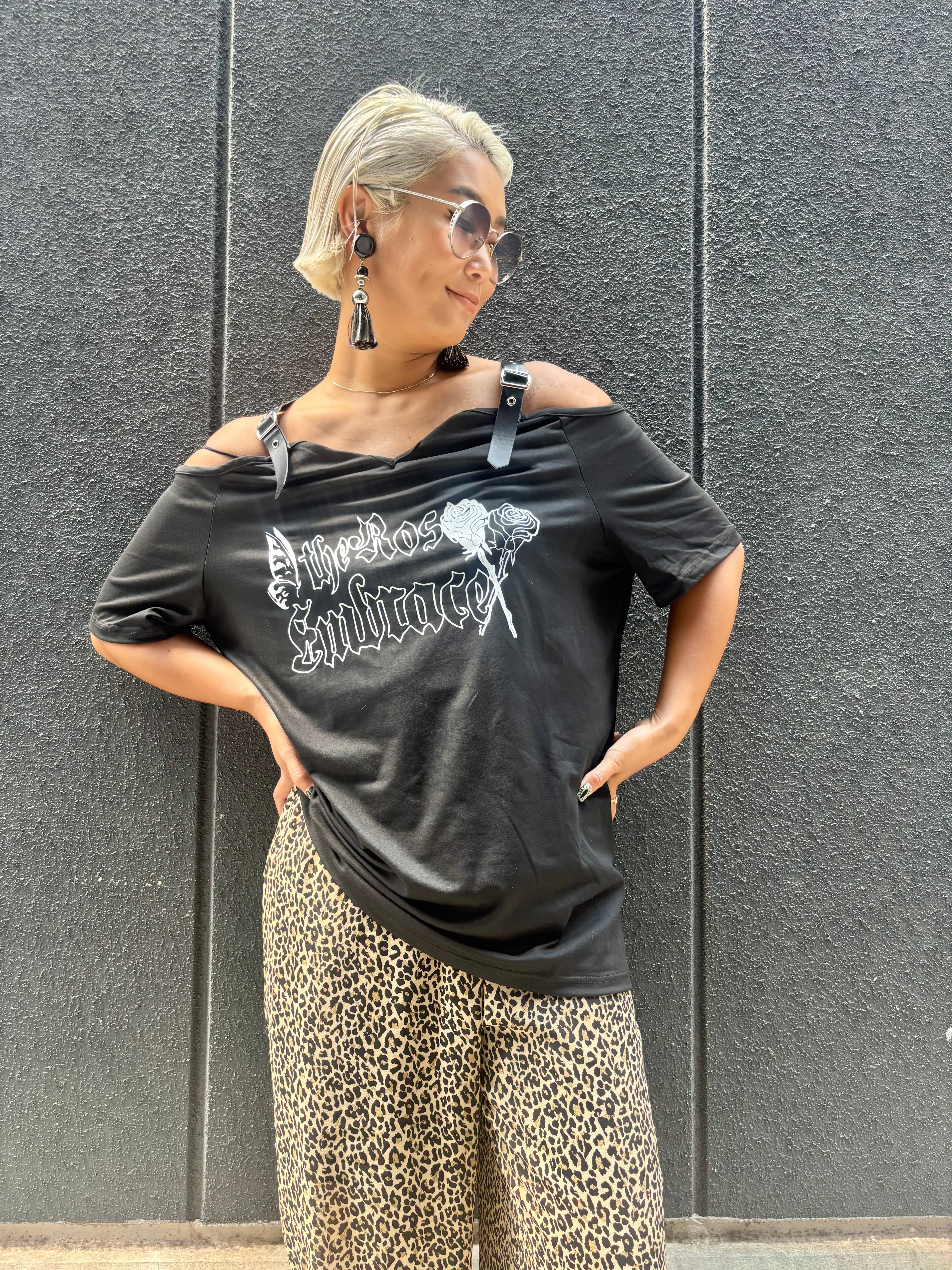 rose print × belted strap design tops トップス デザイントップス ブラック 黒 薔薇 ベルト ストラップ