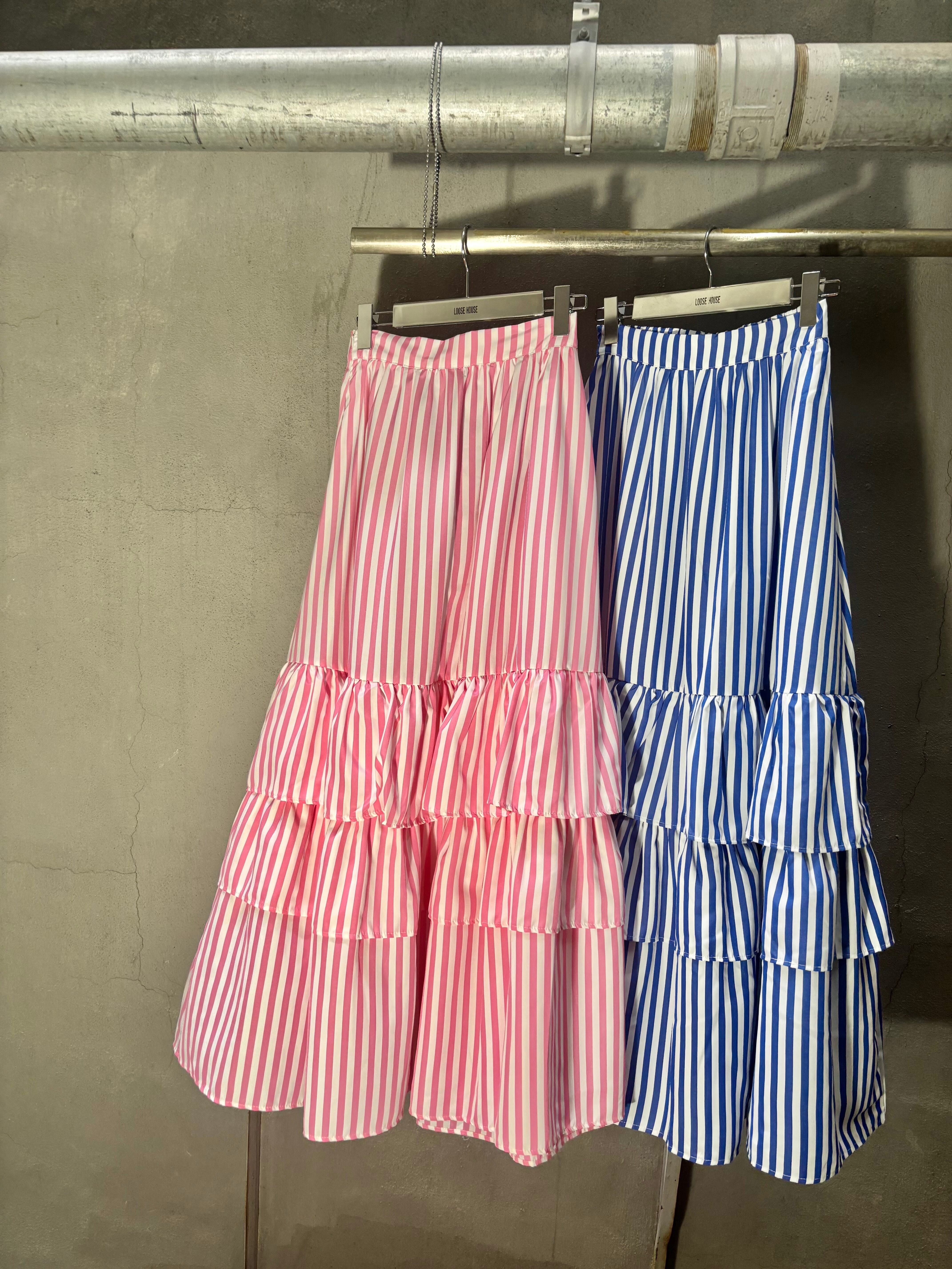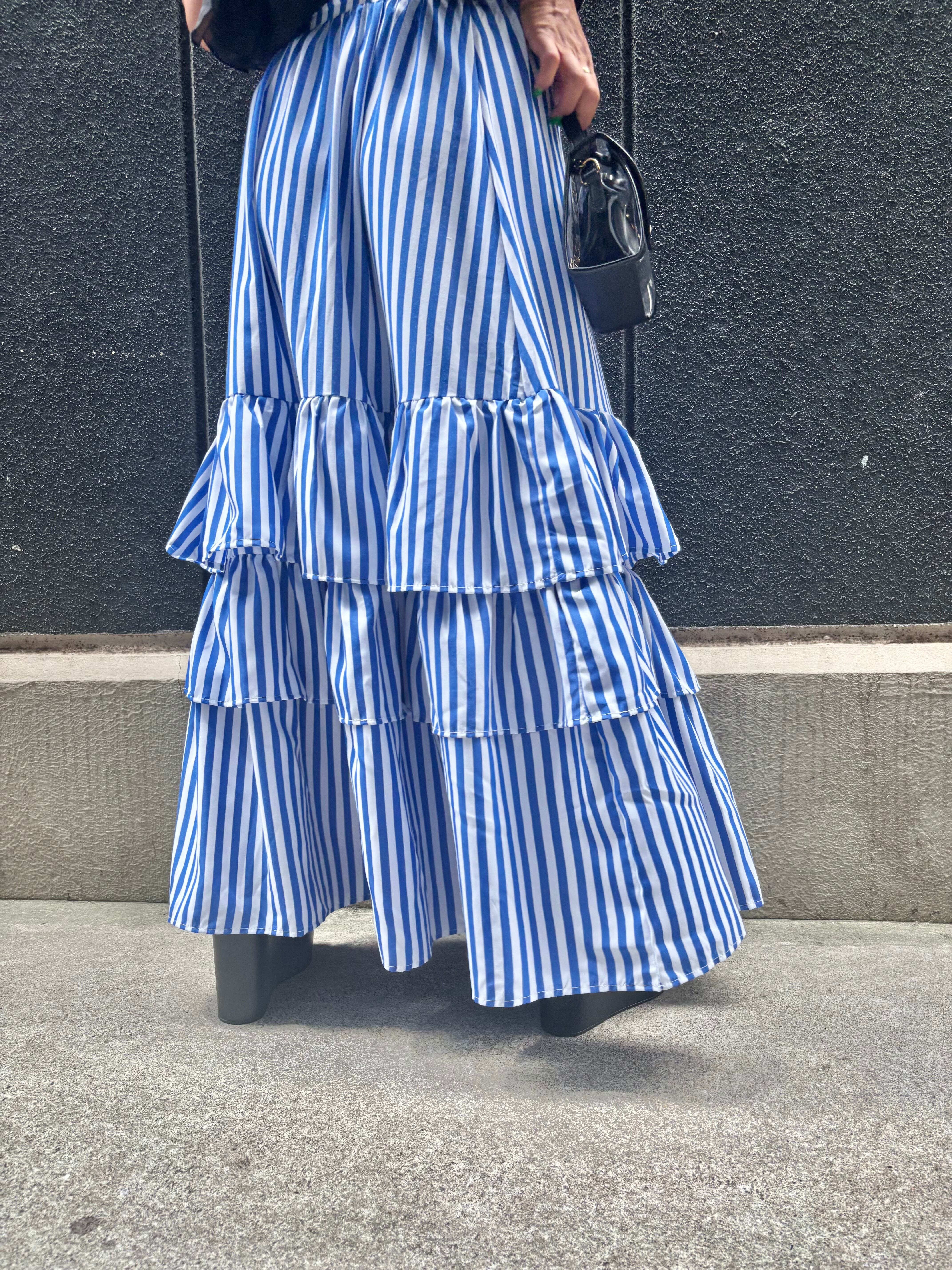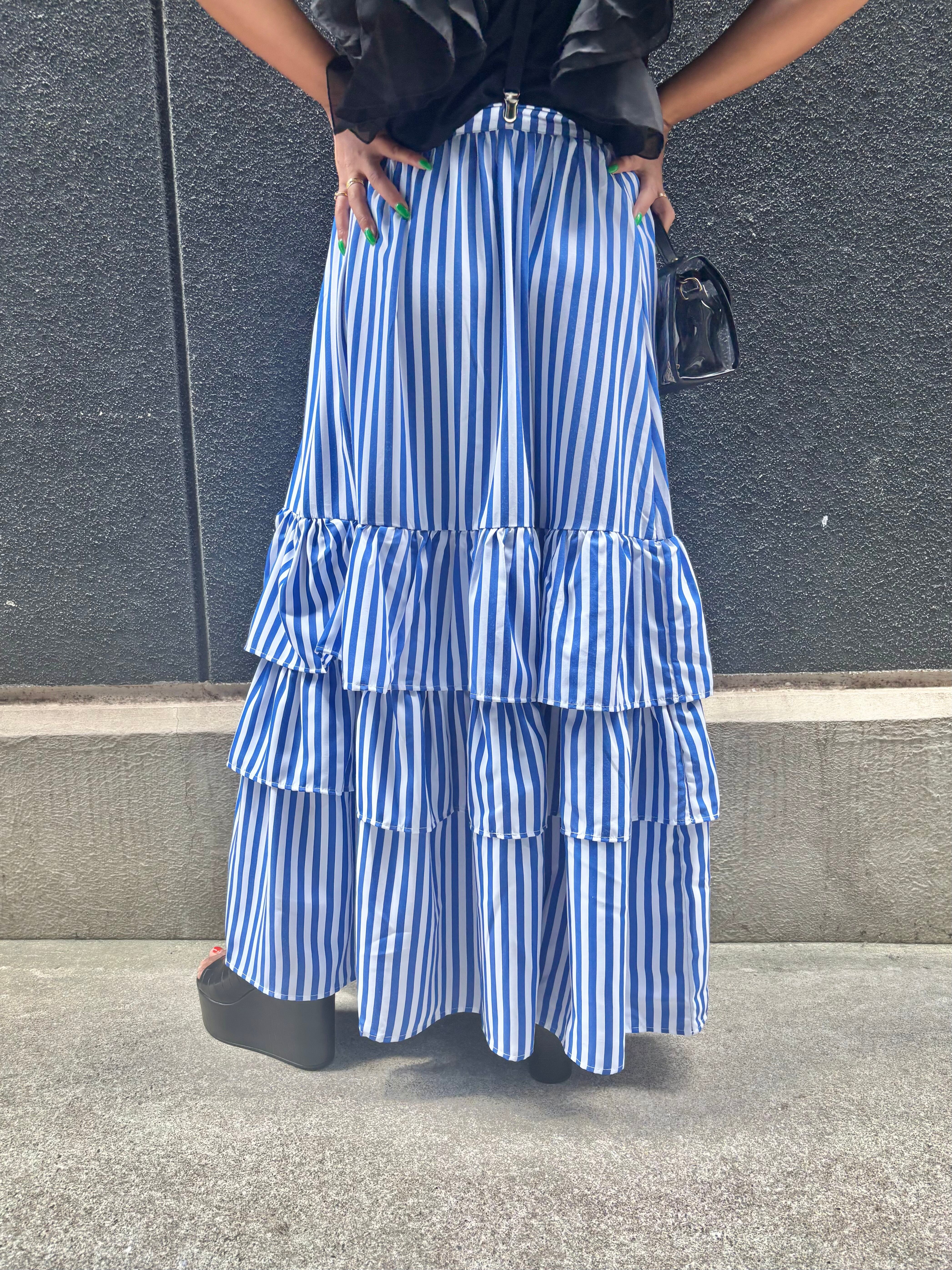 涼し気なストライプ柄と可愛らしいフリルが特徴のロングフレアスカート!
