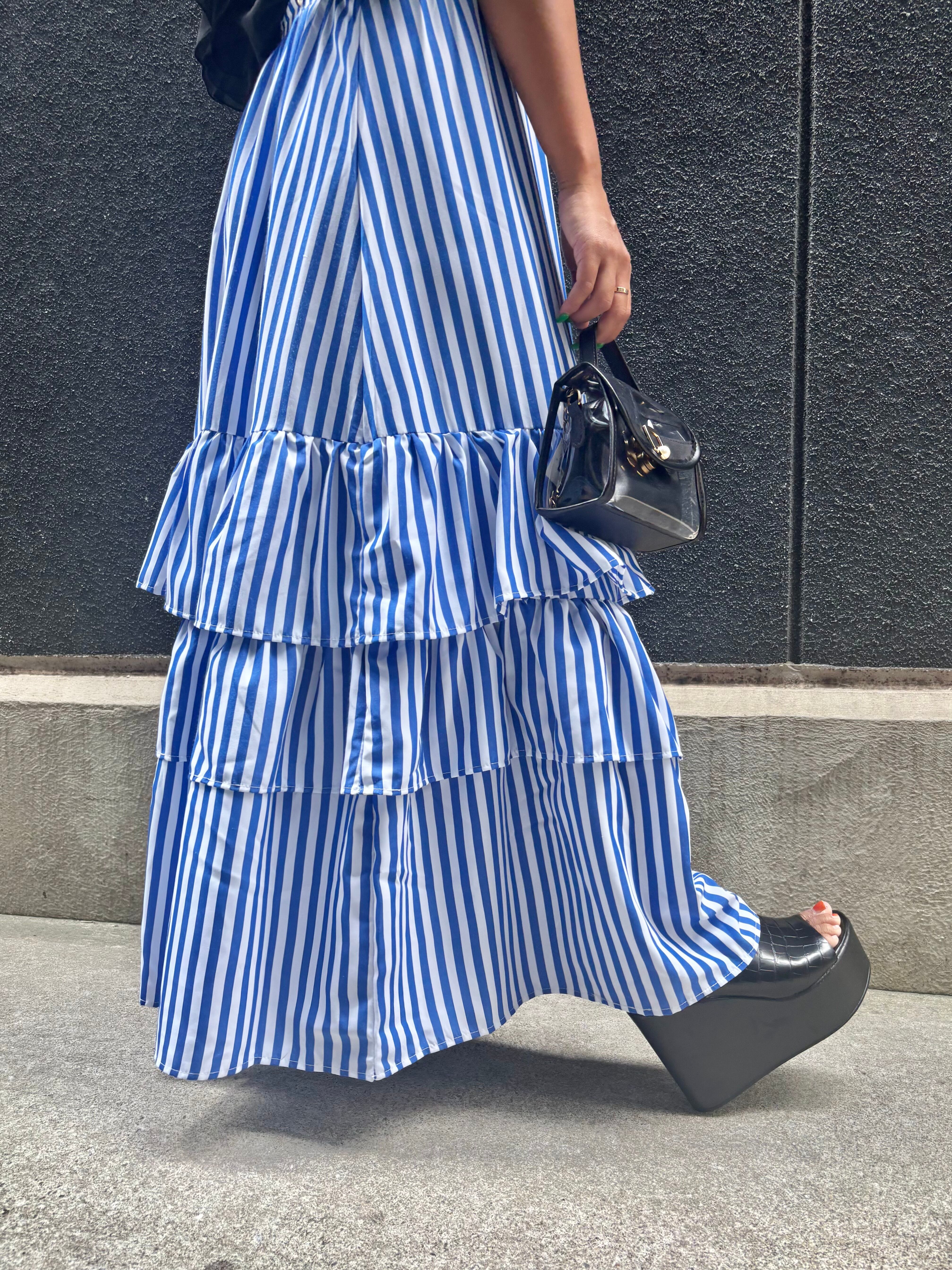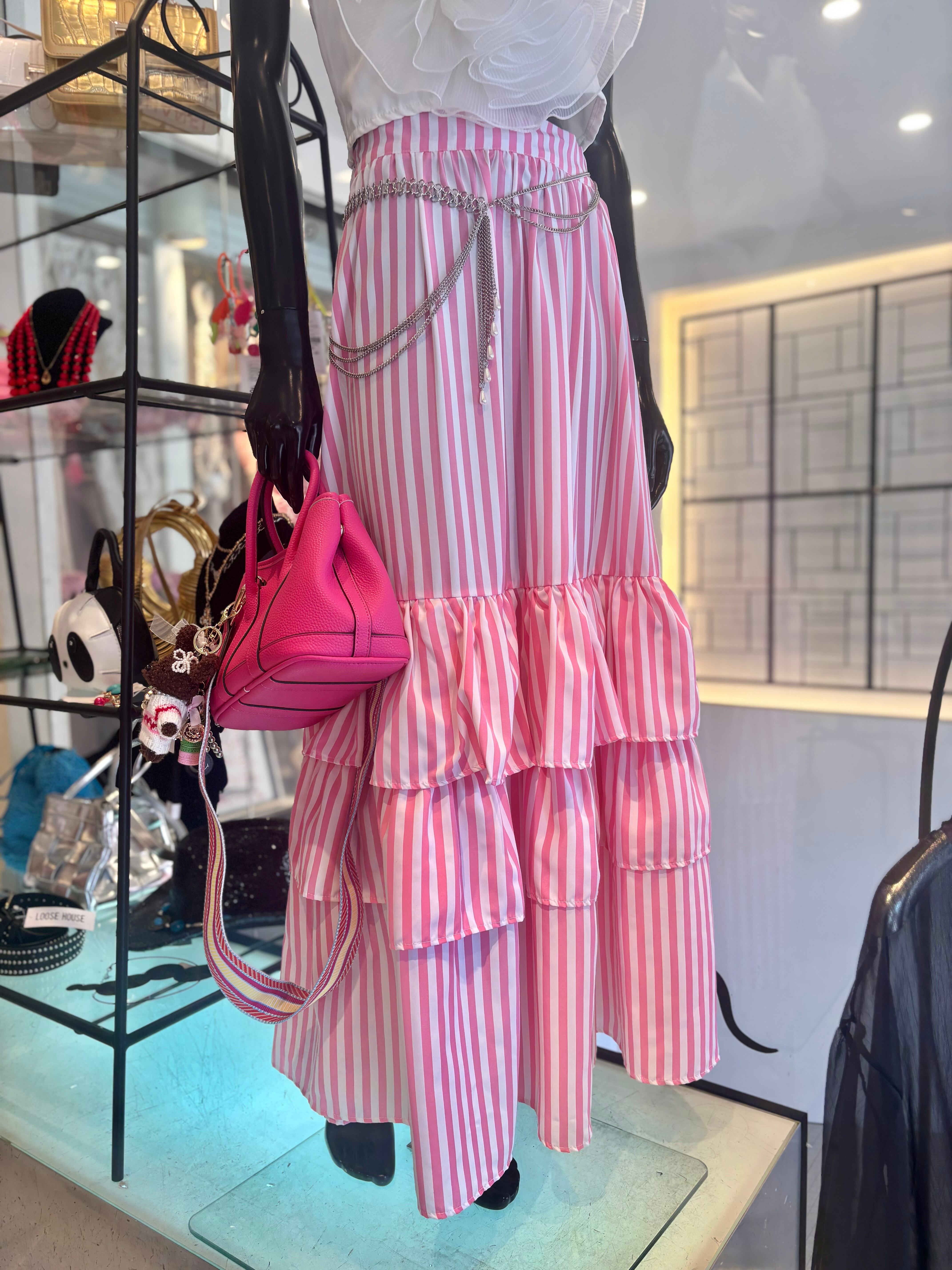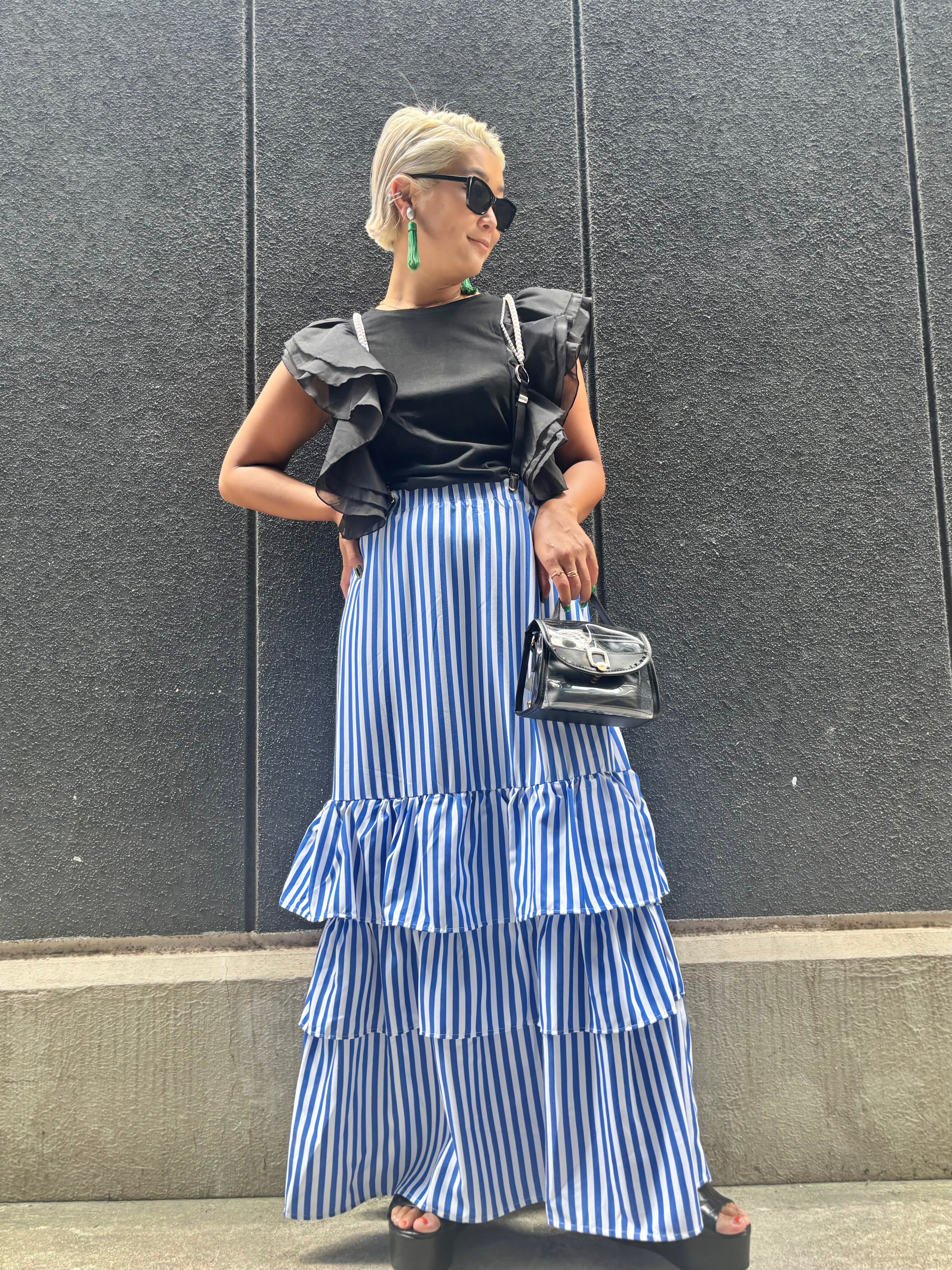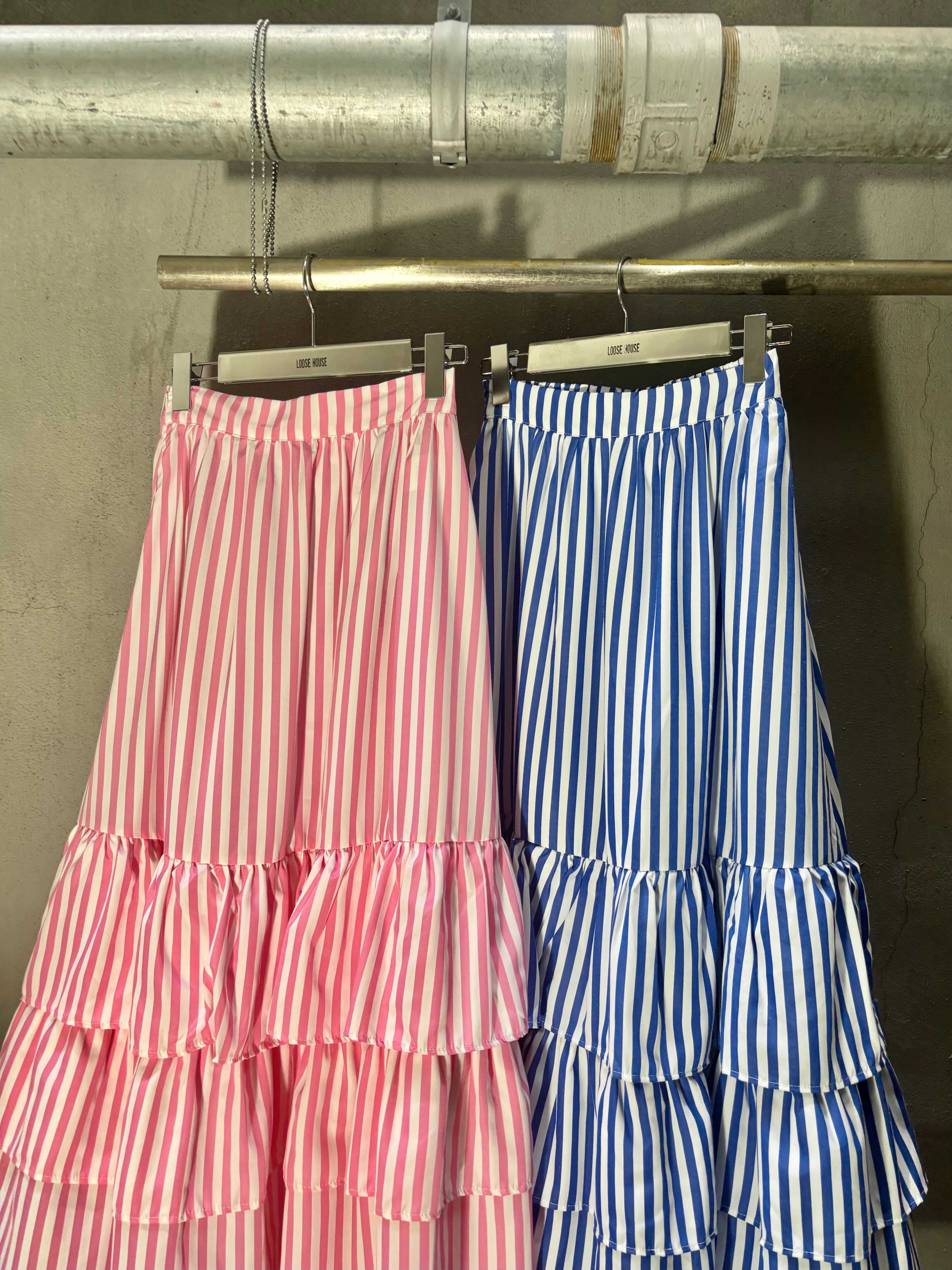涼し気なストライプ柄と可愛らしいフリルが特徴のロングフレアスカート!