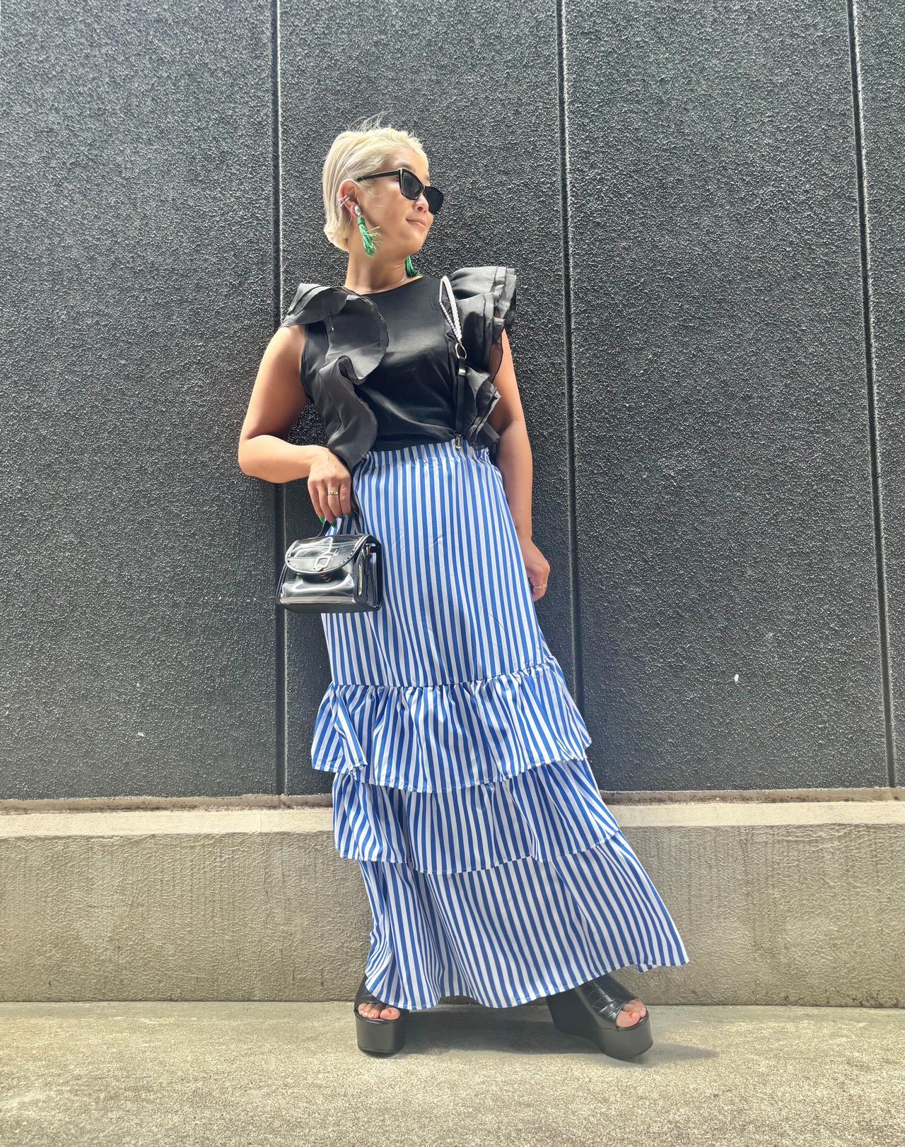 stripe × frill change design long flare skirt スカート ストライプ フリル ロングスカート 夏