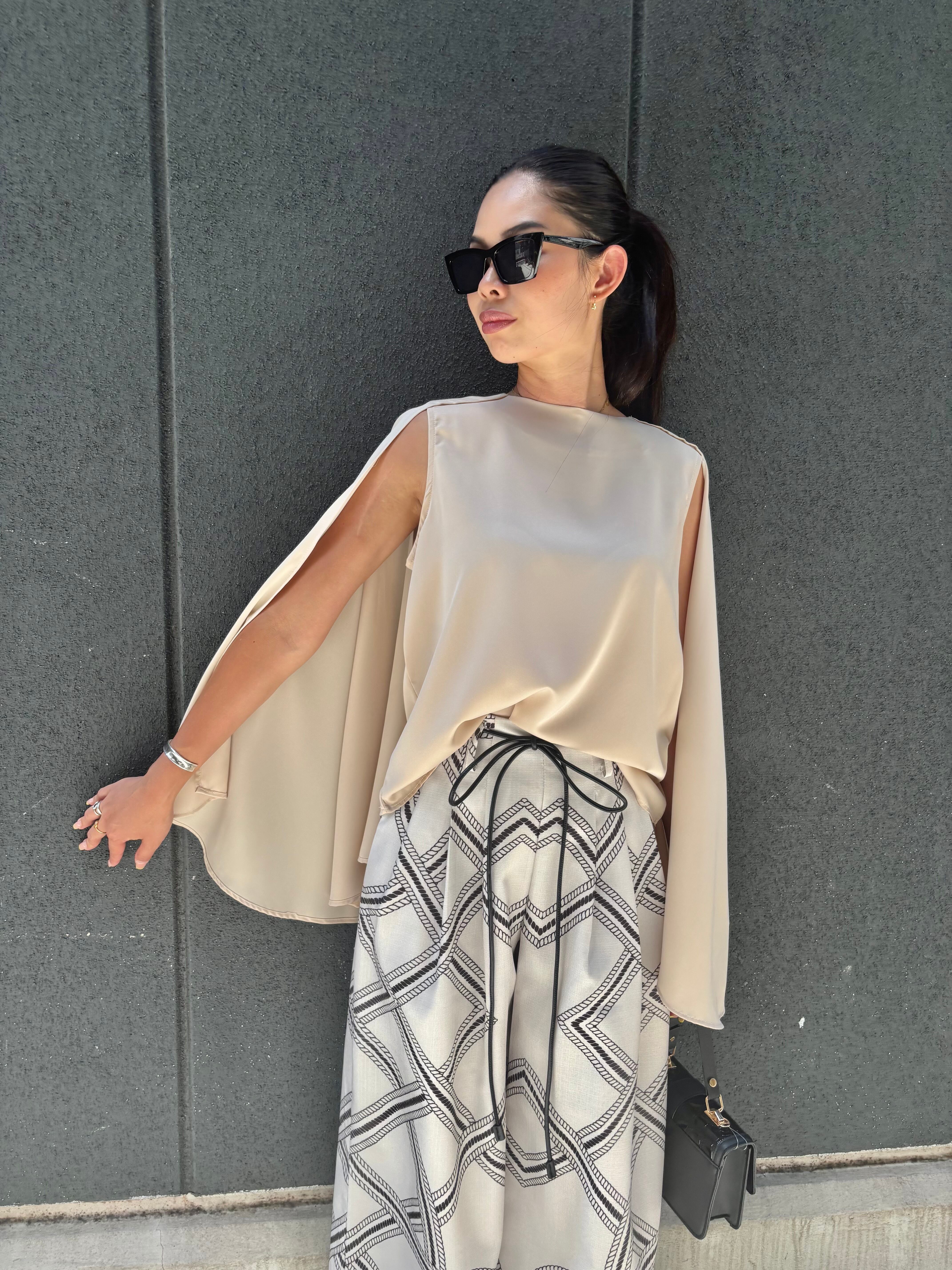 マントのようなケープデザインが特徴的なきれいめなトップスです。