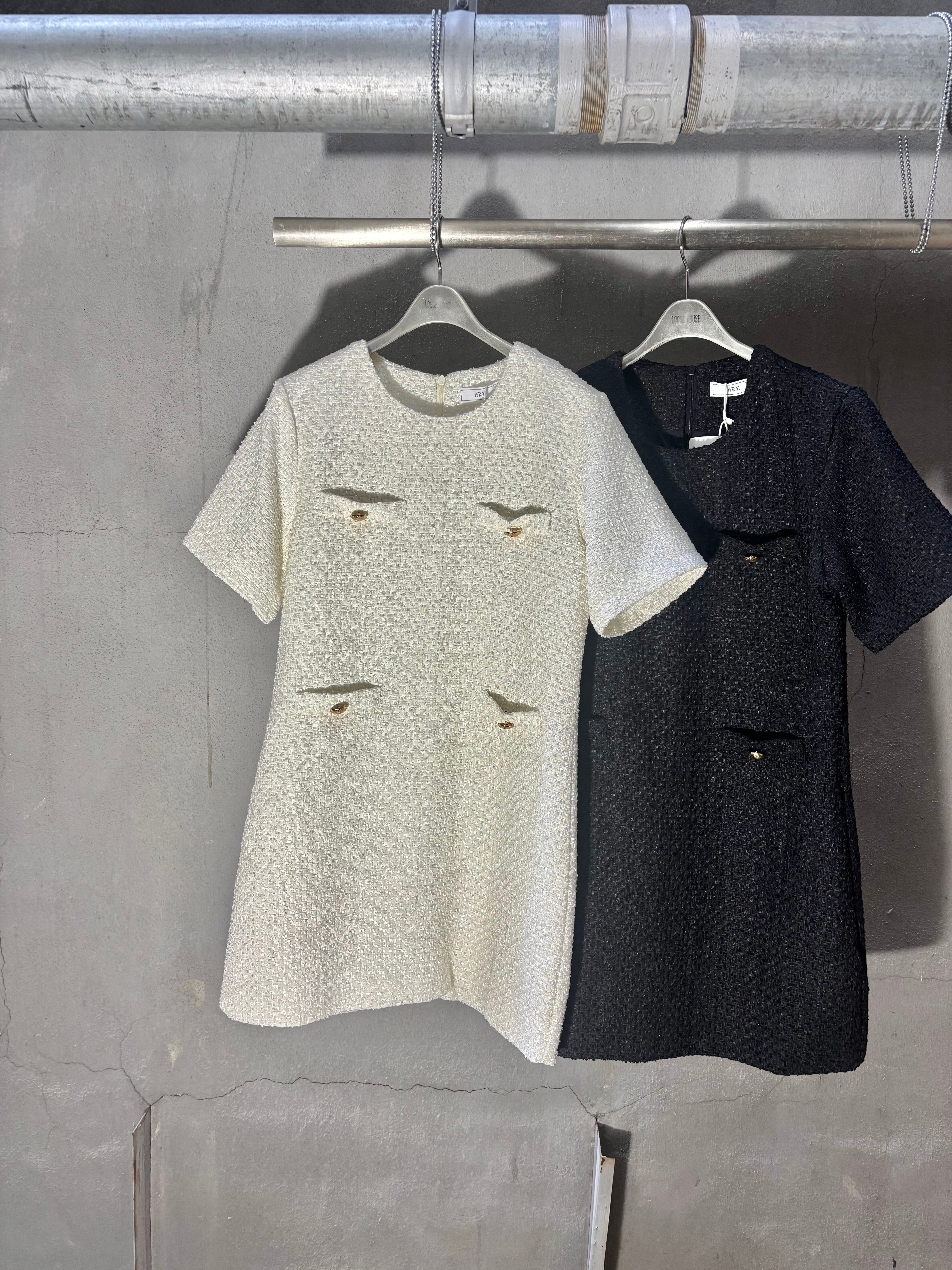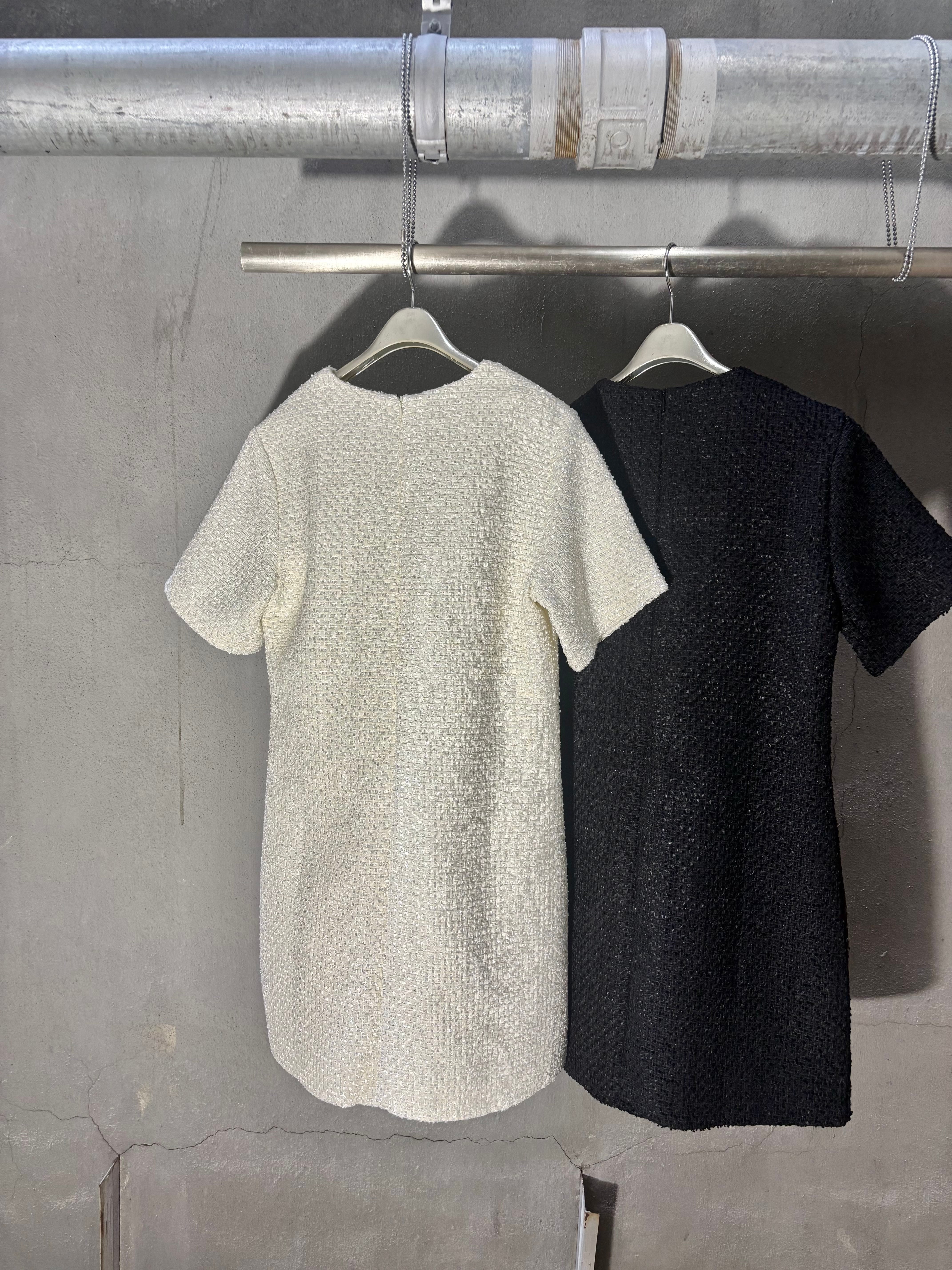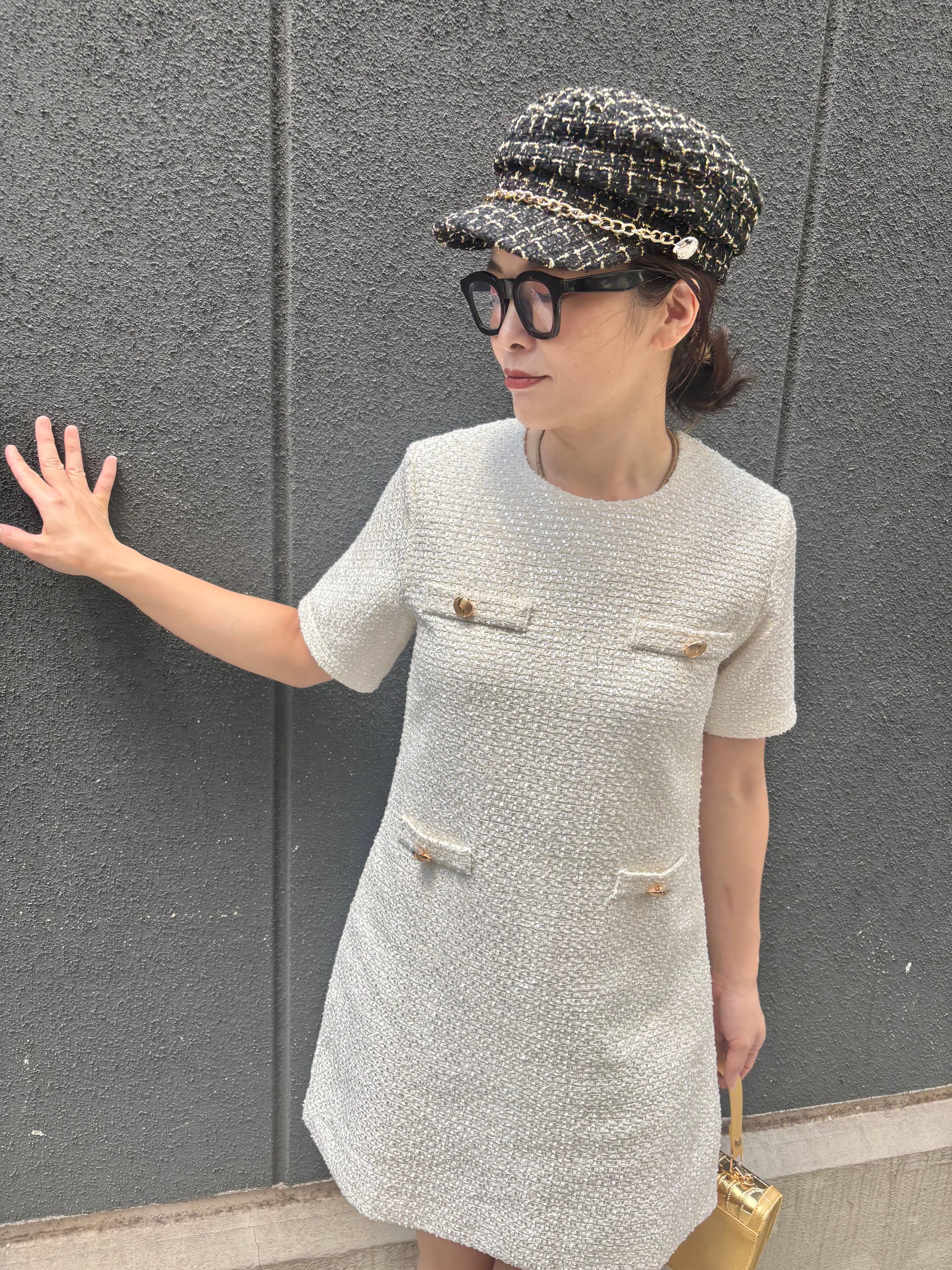 tweed touch C-neck design mini one-piece ワンピース ワンピ ミニワンピ 半袖 ツィード 金ボタン Cネック