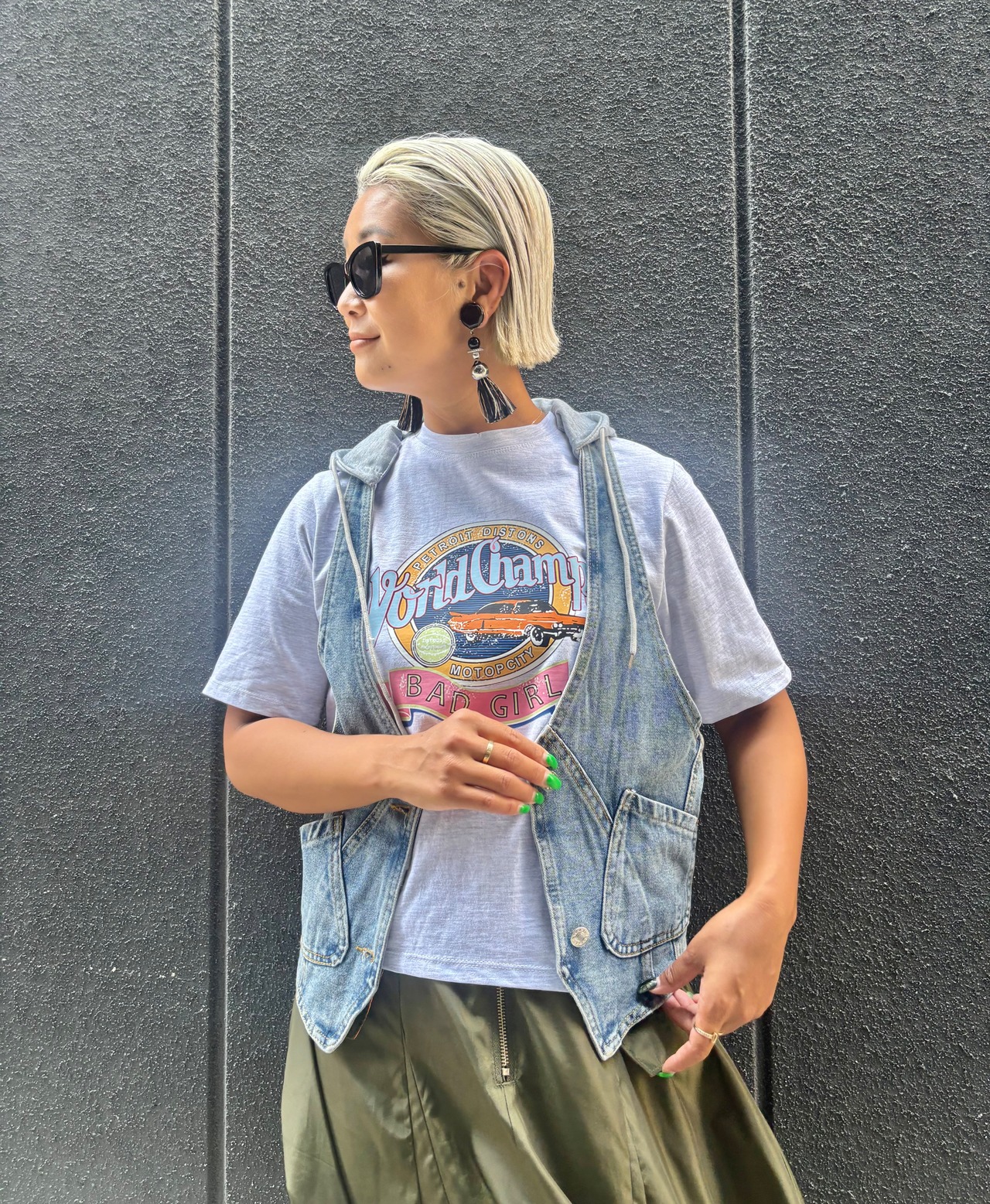 different fabrics hoodie design V-neck denim vest ベスト デニム フード フーディー 取り外し 重ね着 カジュアル Vネック