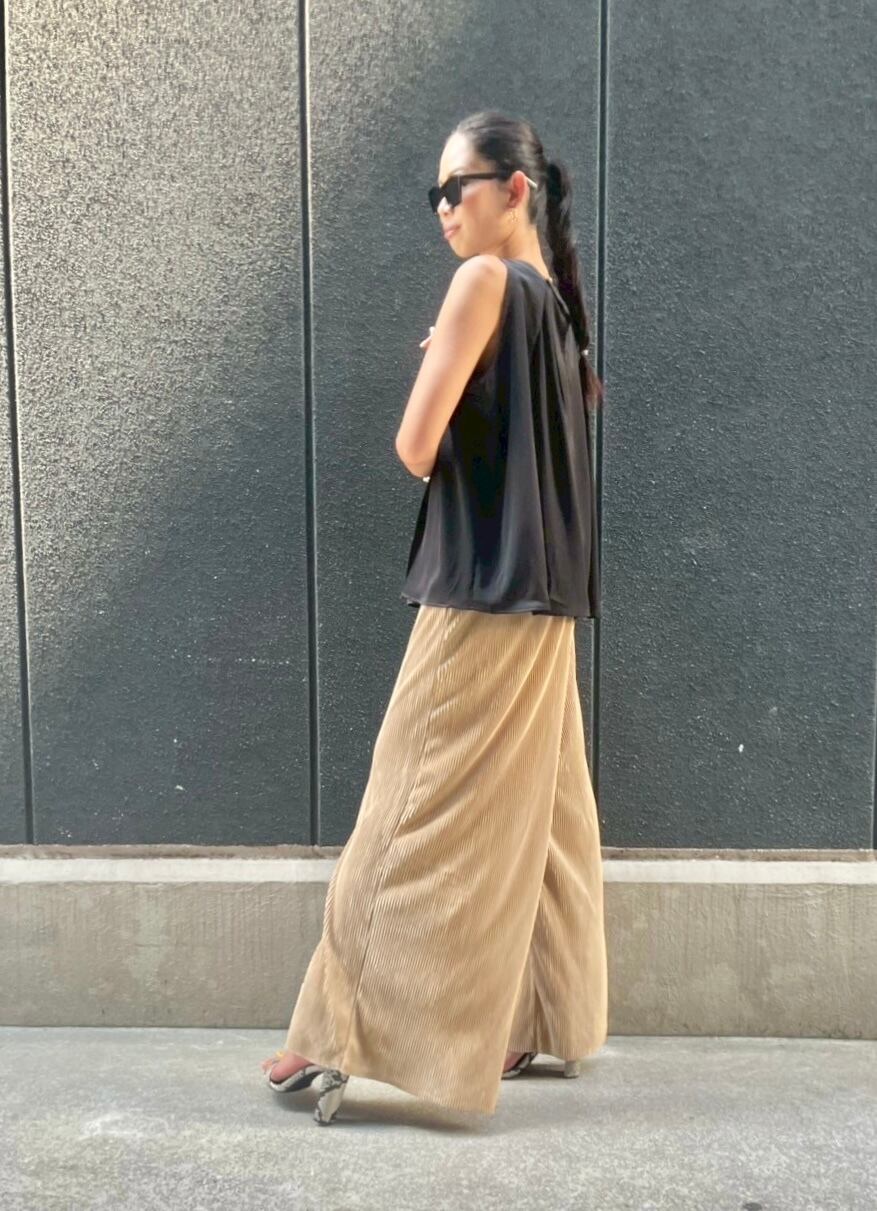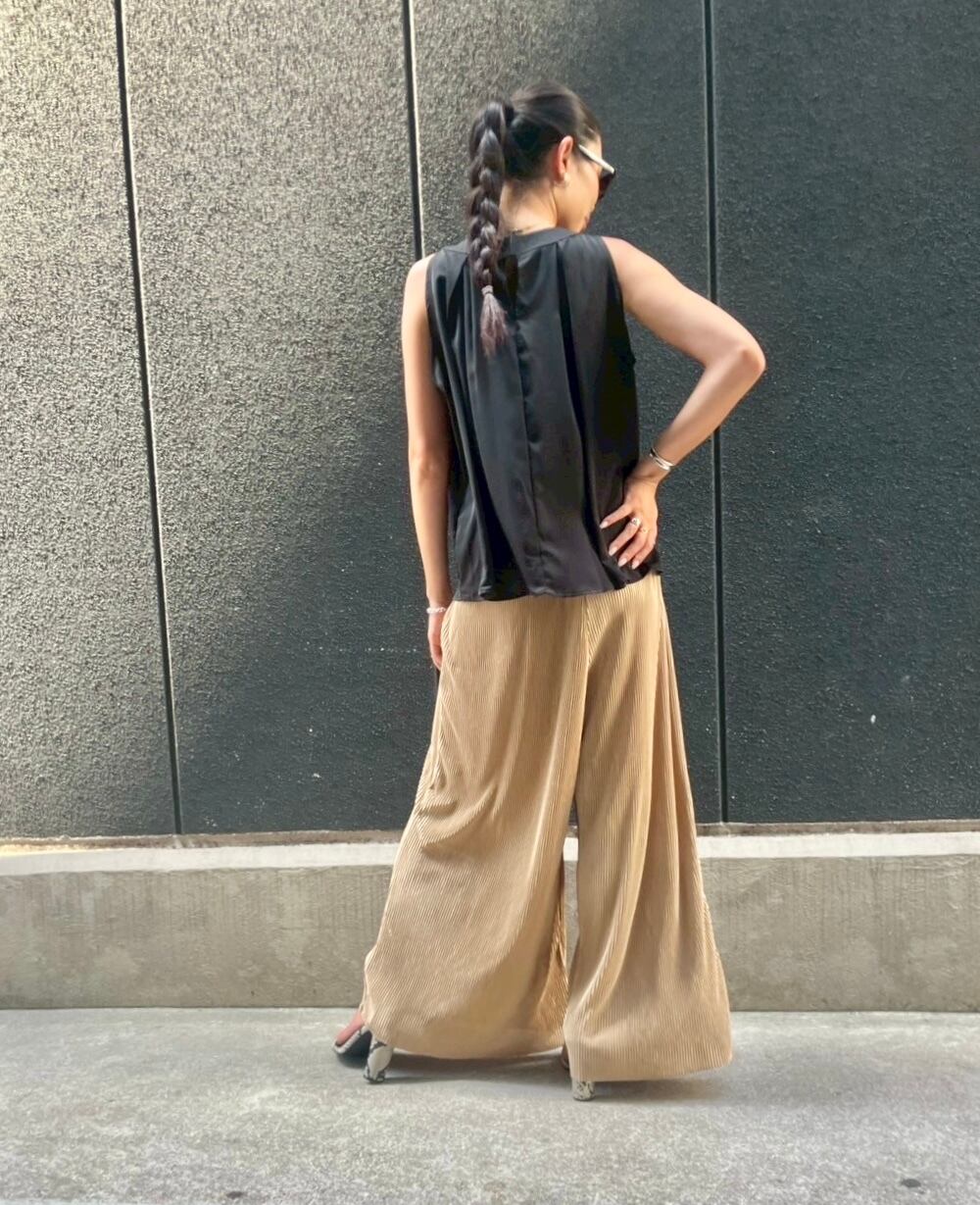 black tops × gold wide pants 2P set up セットアップ 2点セット トップス ワイドパンツ プリーツ ゴムウエスト 着回し