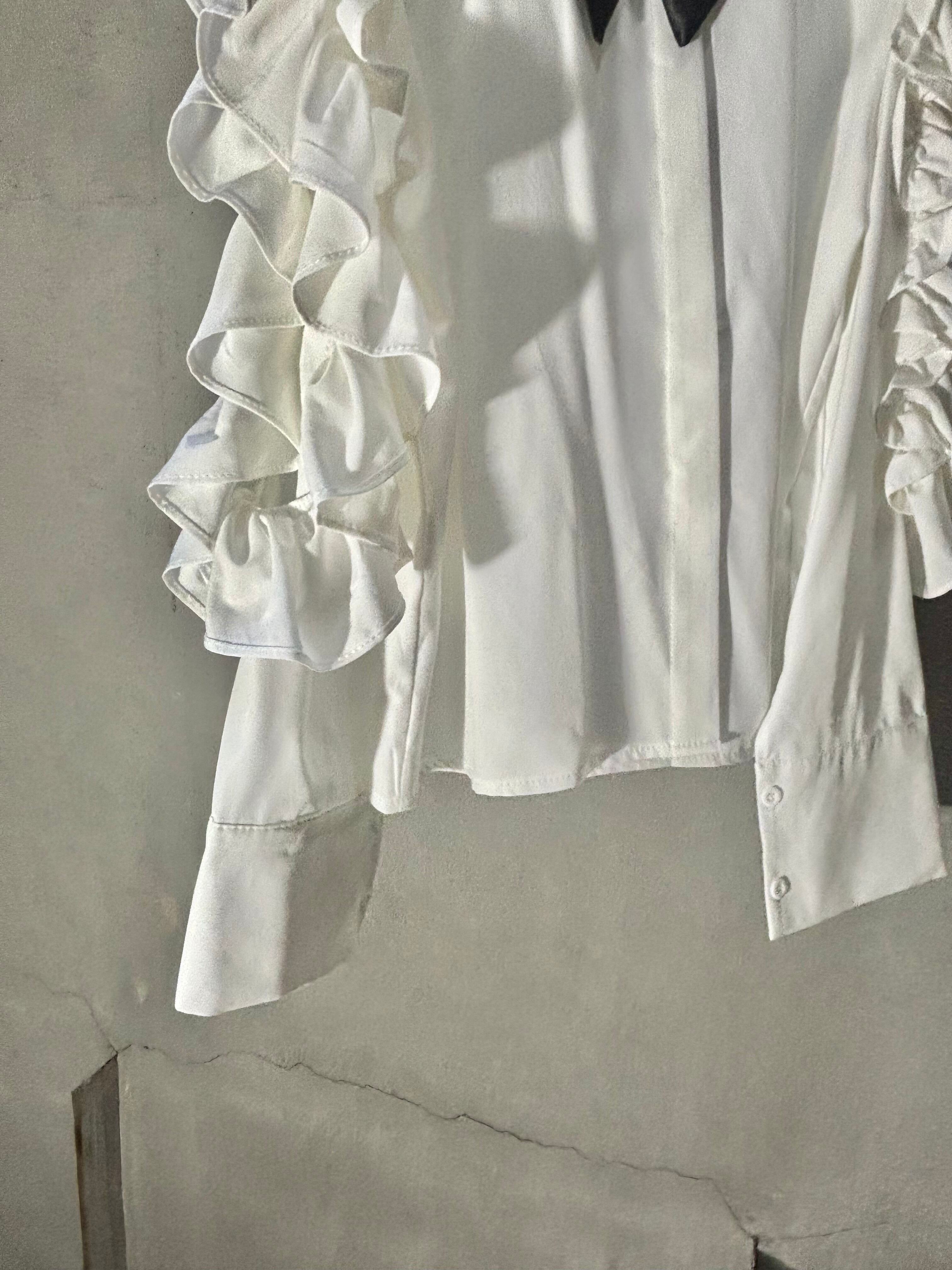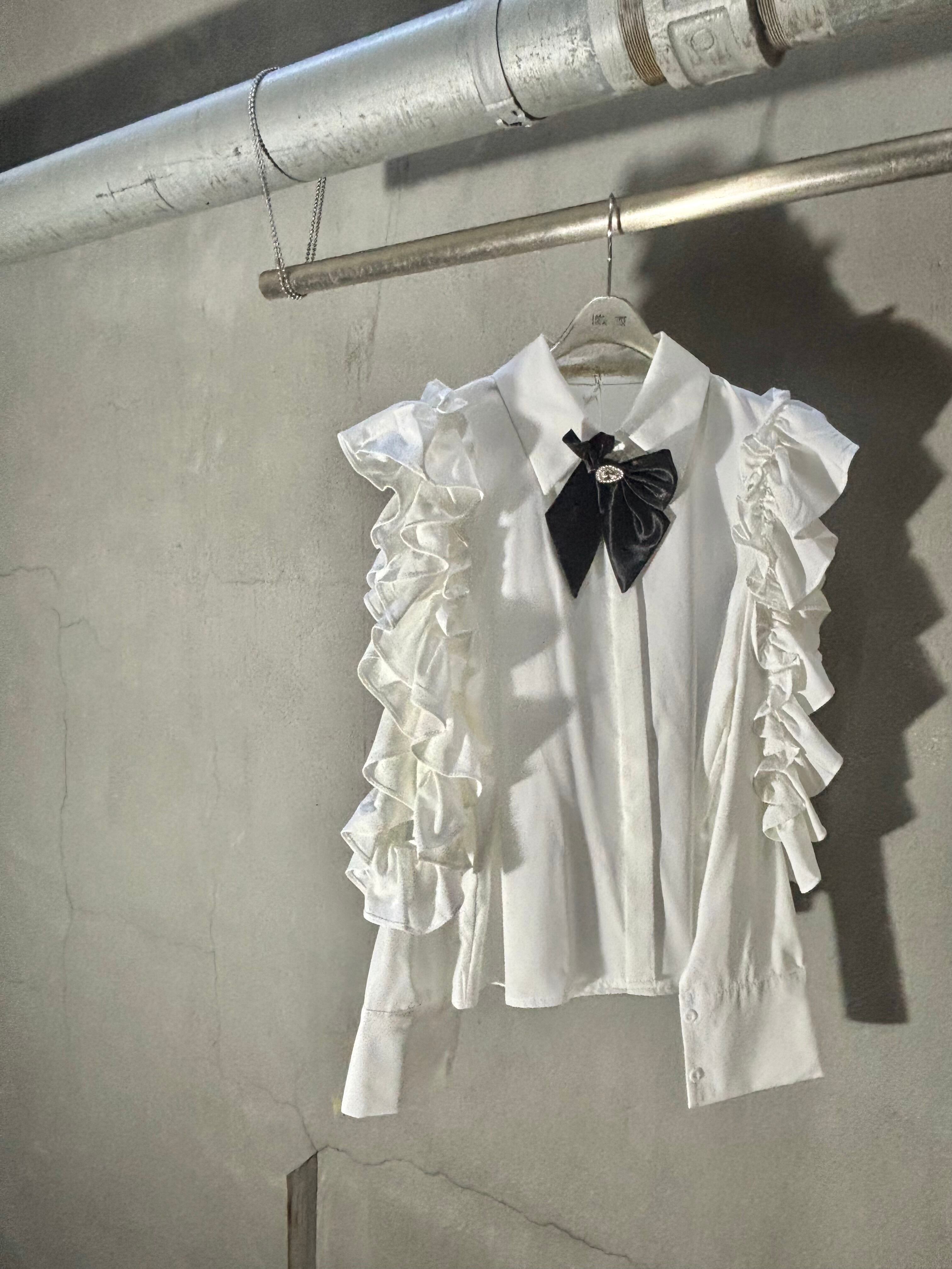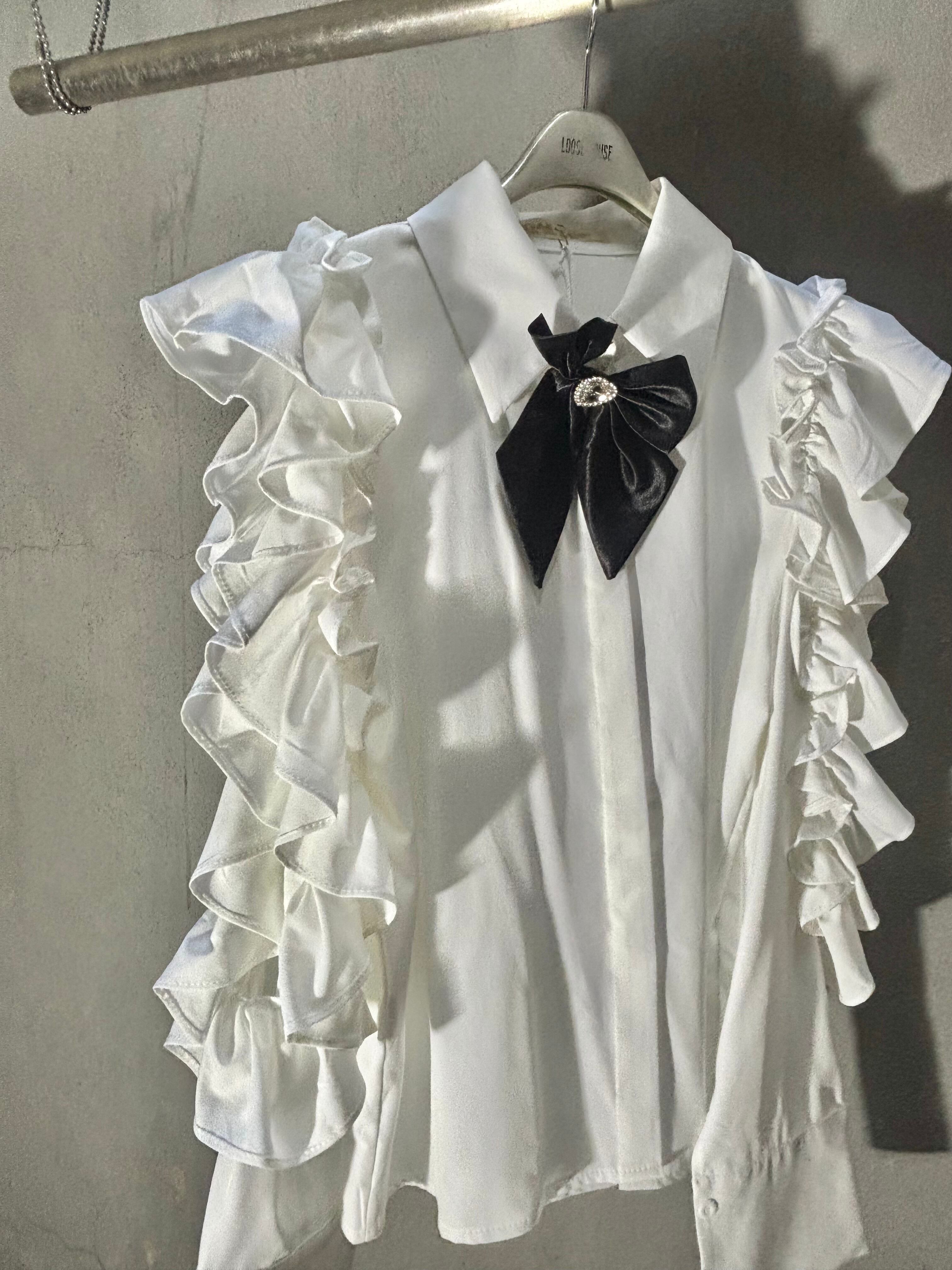 frill × open sleeve design ribbon broach shirt シャツ ブラウス フリル 肩開き リボン ブローチ