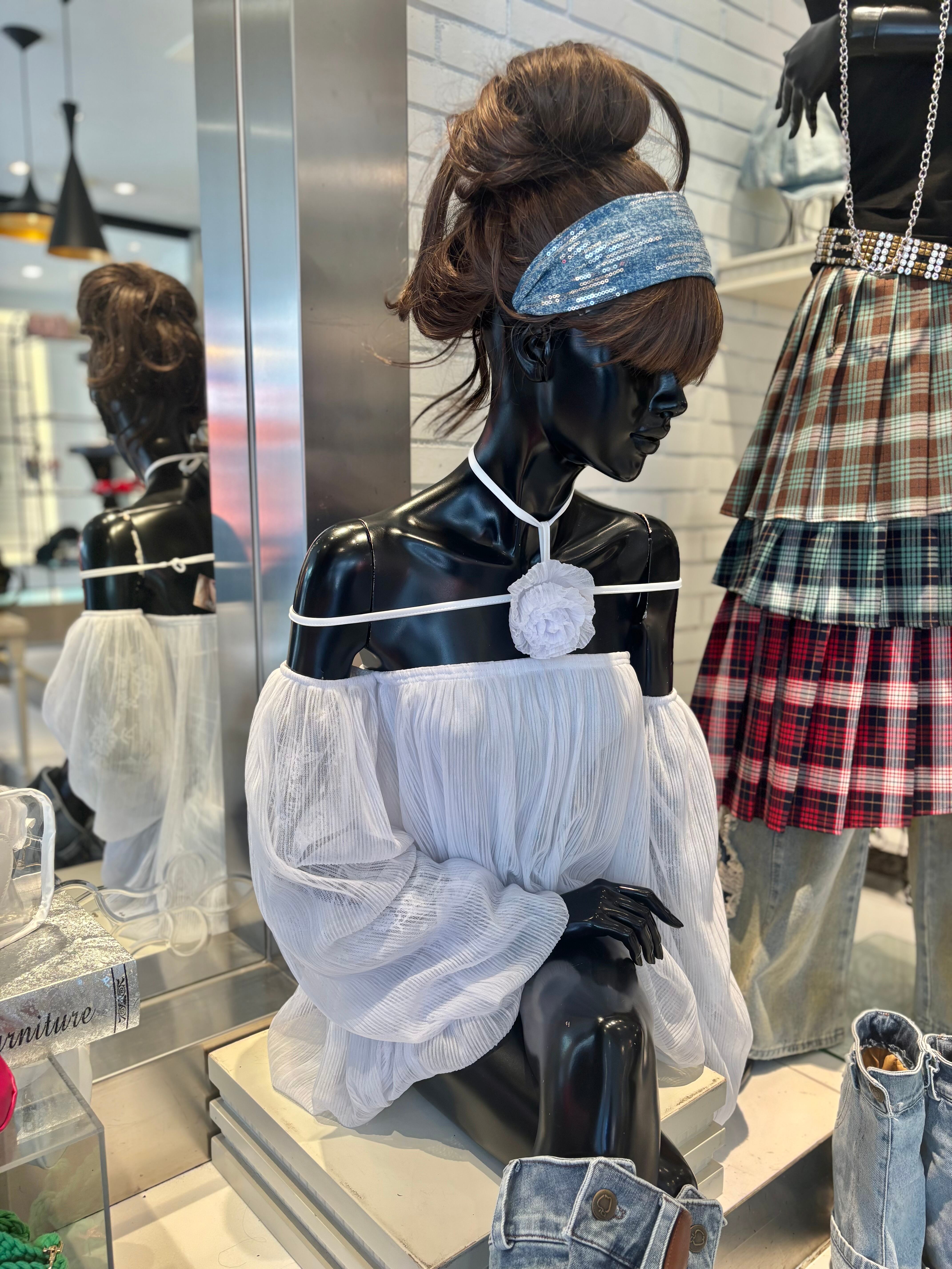 flower tape point off shoulder × balloon design tunic チュニック ミニワンピ オフショルダー バルーン 花 ホルターネック ホワイト 白