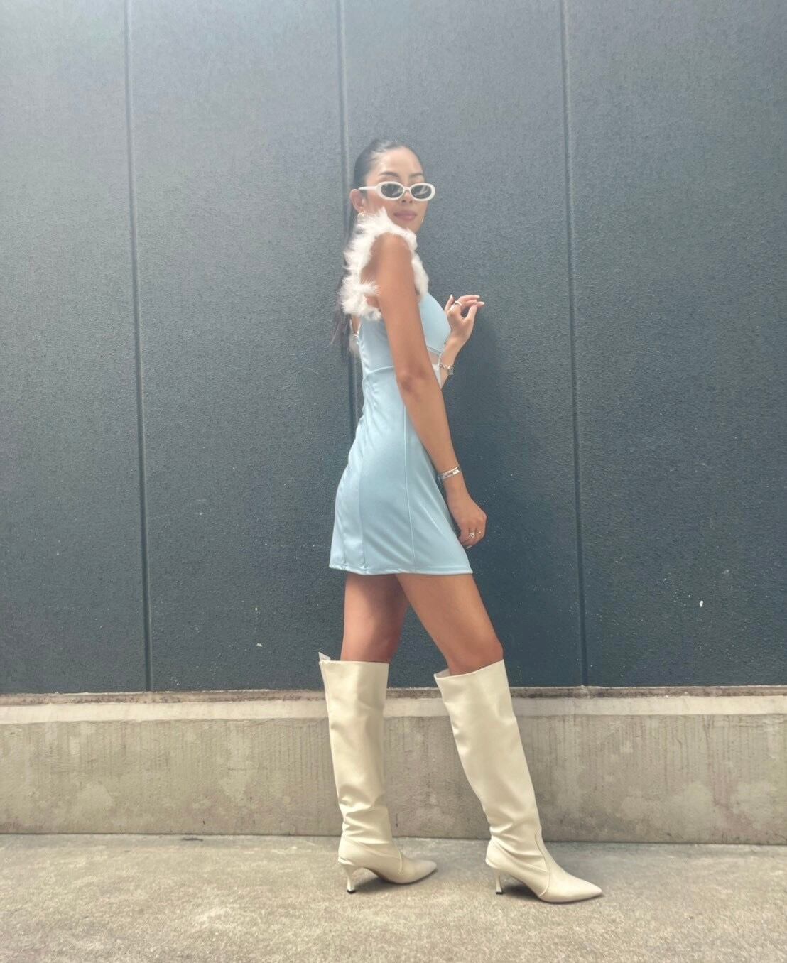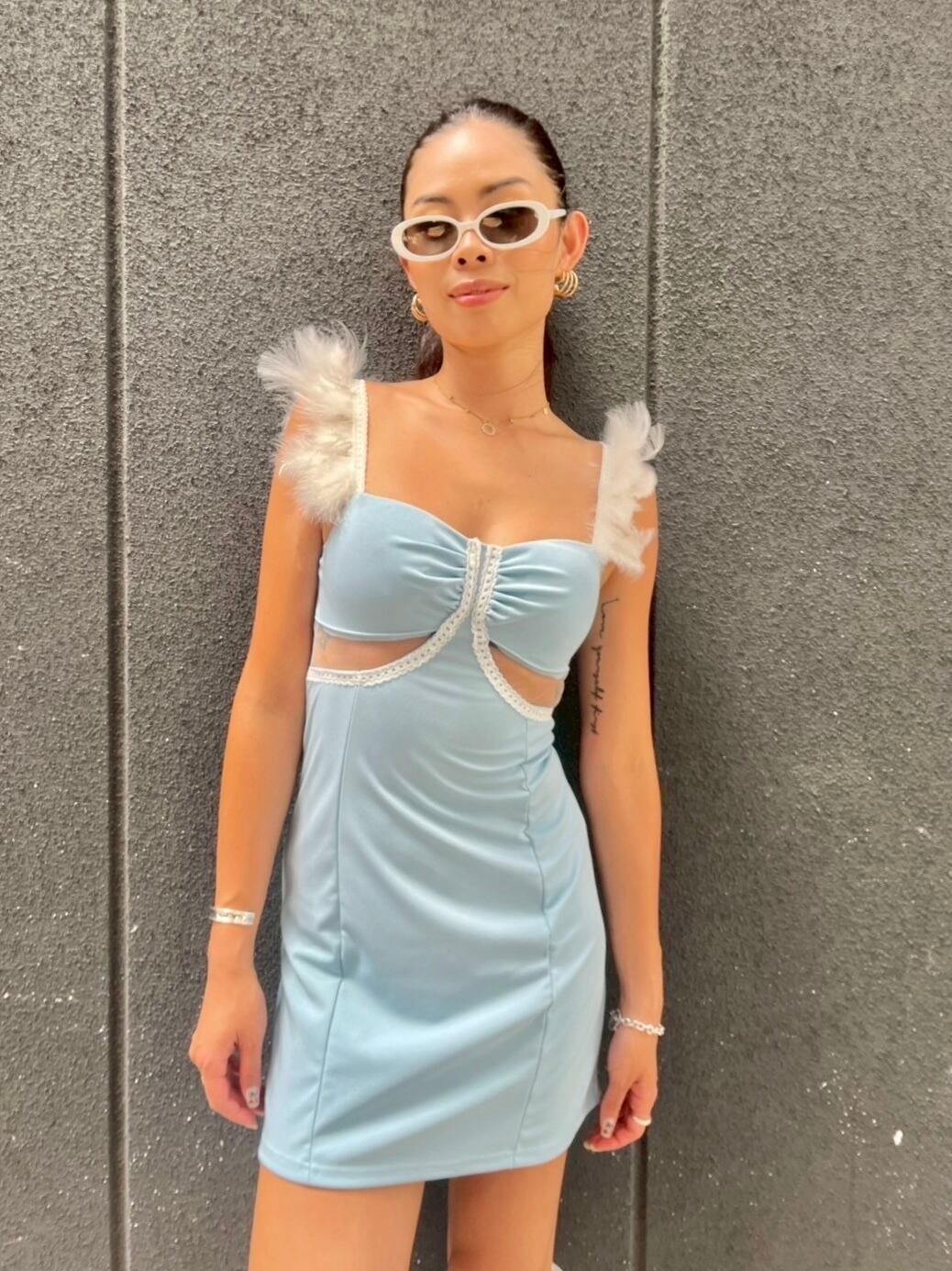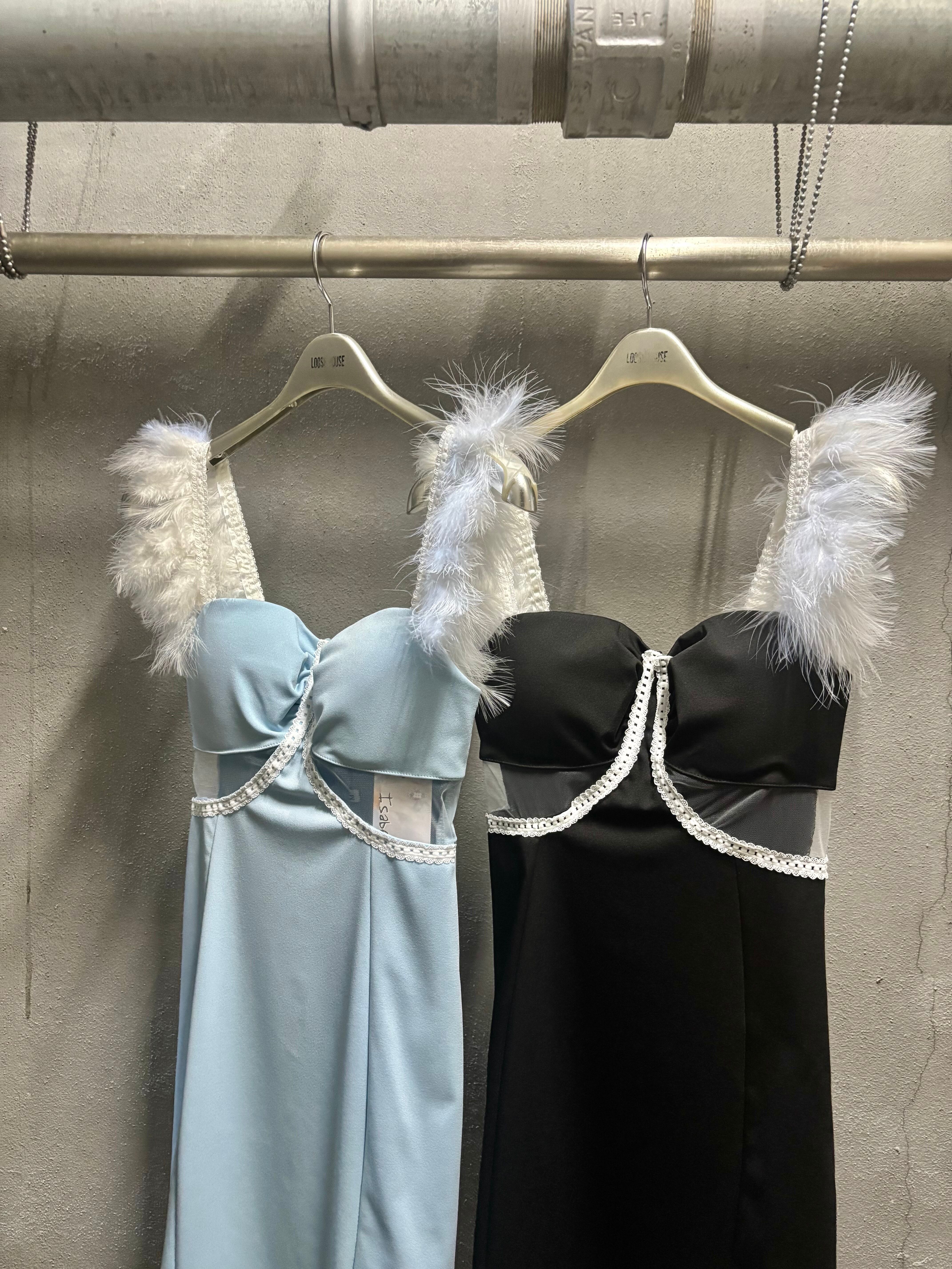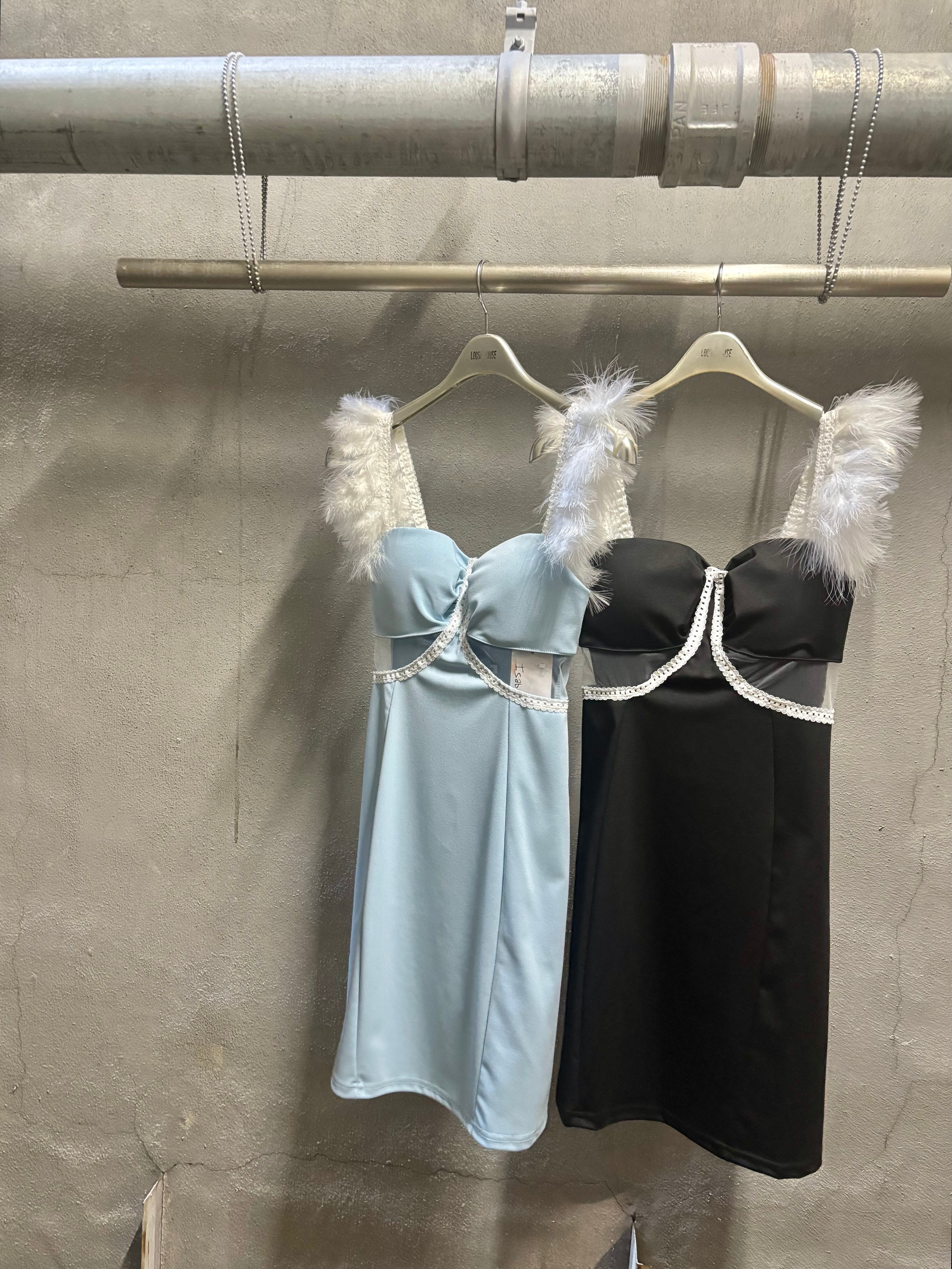 design cup × feather strap mini one-piece dress ワンピース ワンピ ドレス ブルー カップ付き フェザー