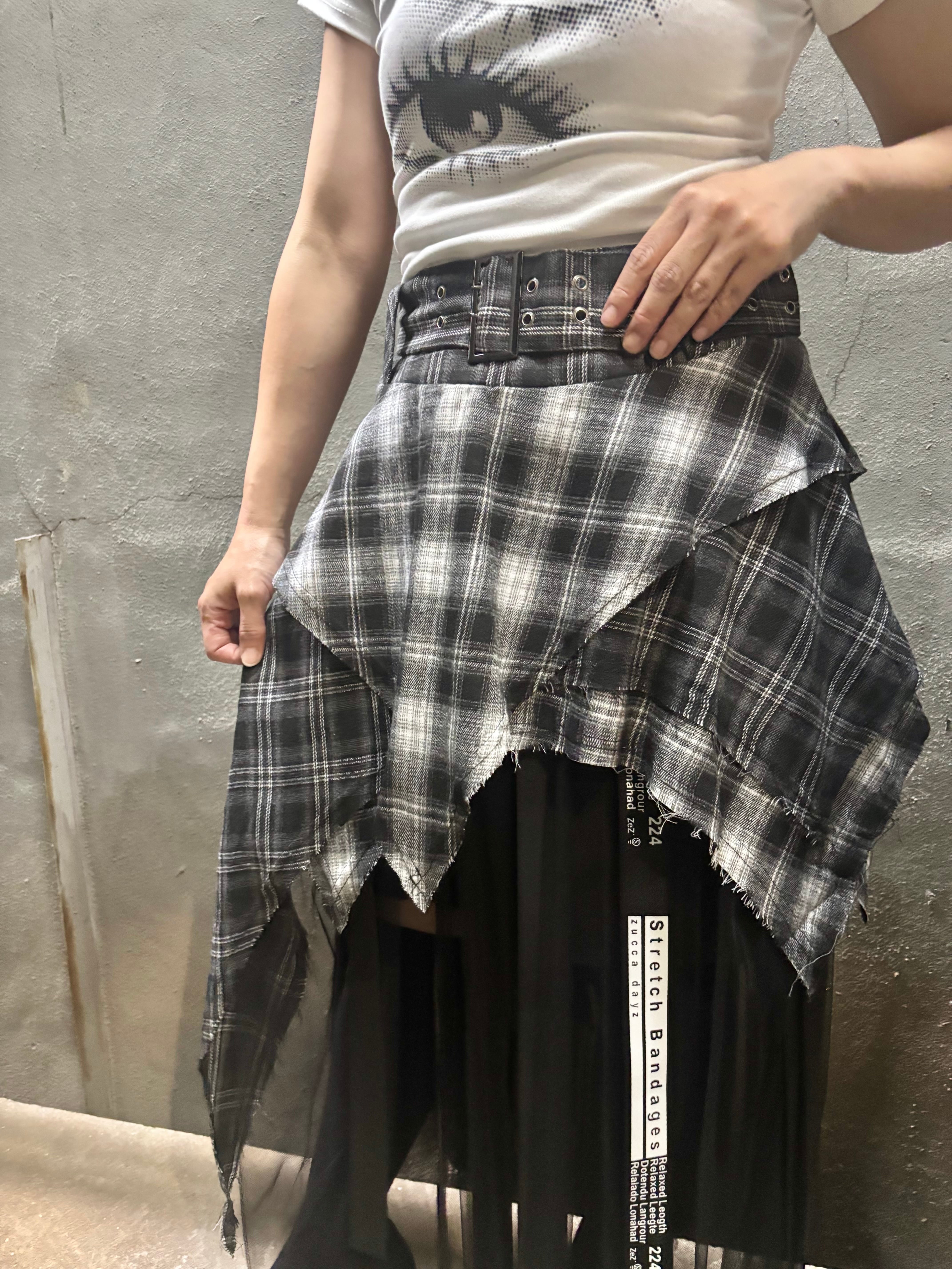 mix check pattern irregular design mini skirt スカート ミニスカート チェック ベルト付き イレギュラー 重ね着