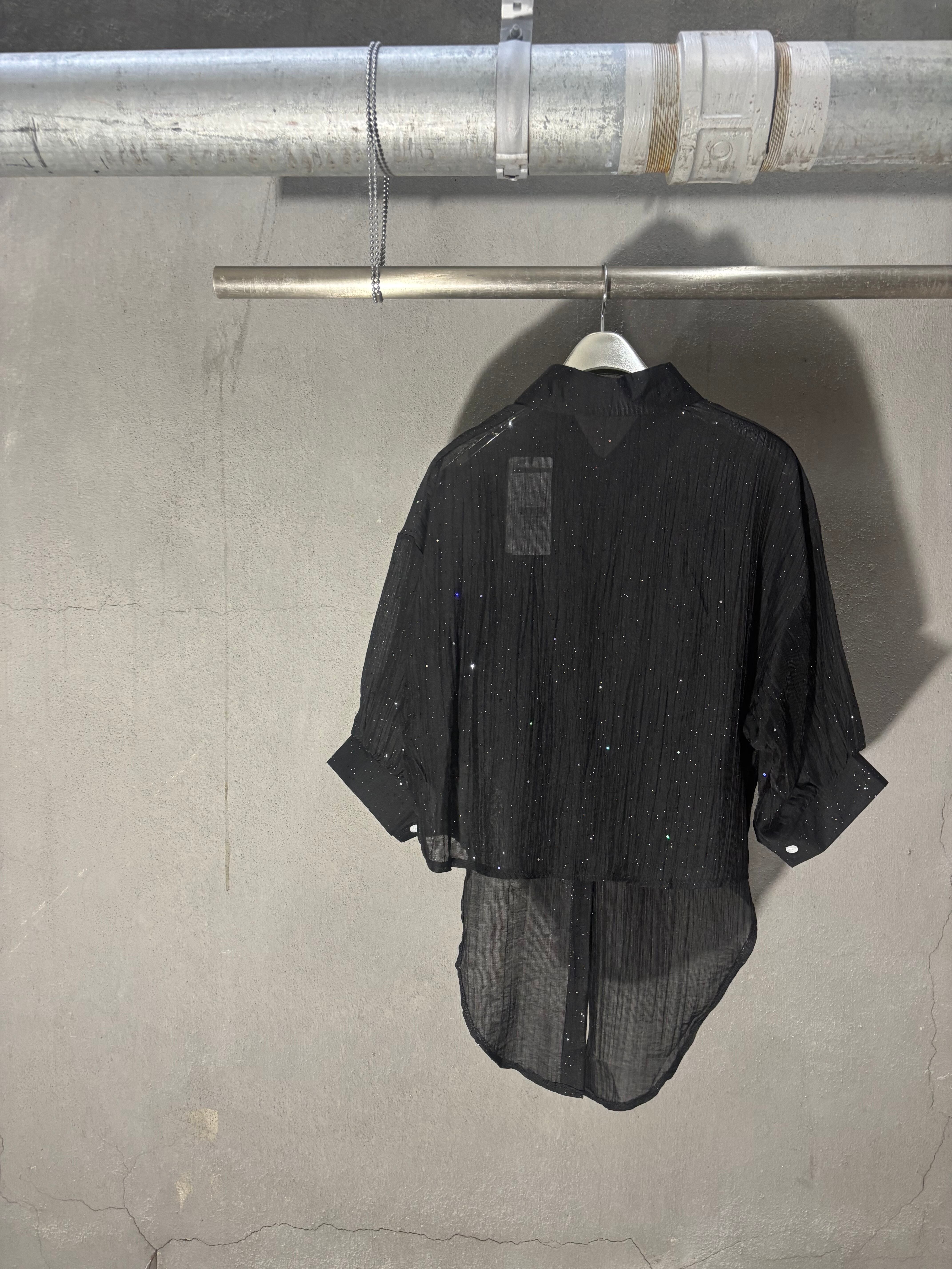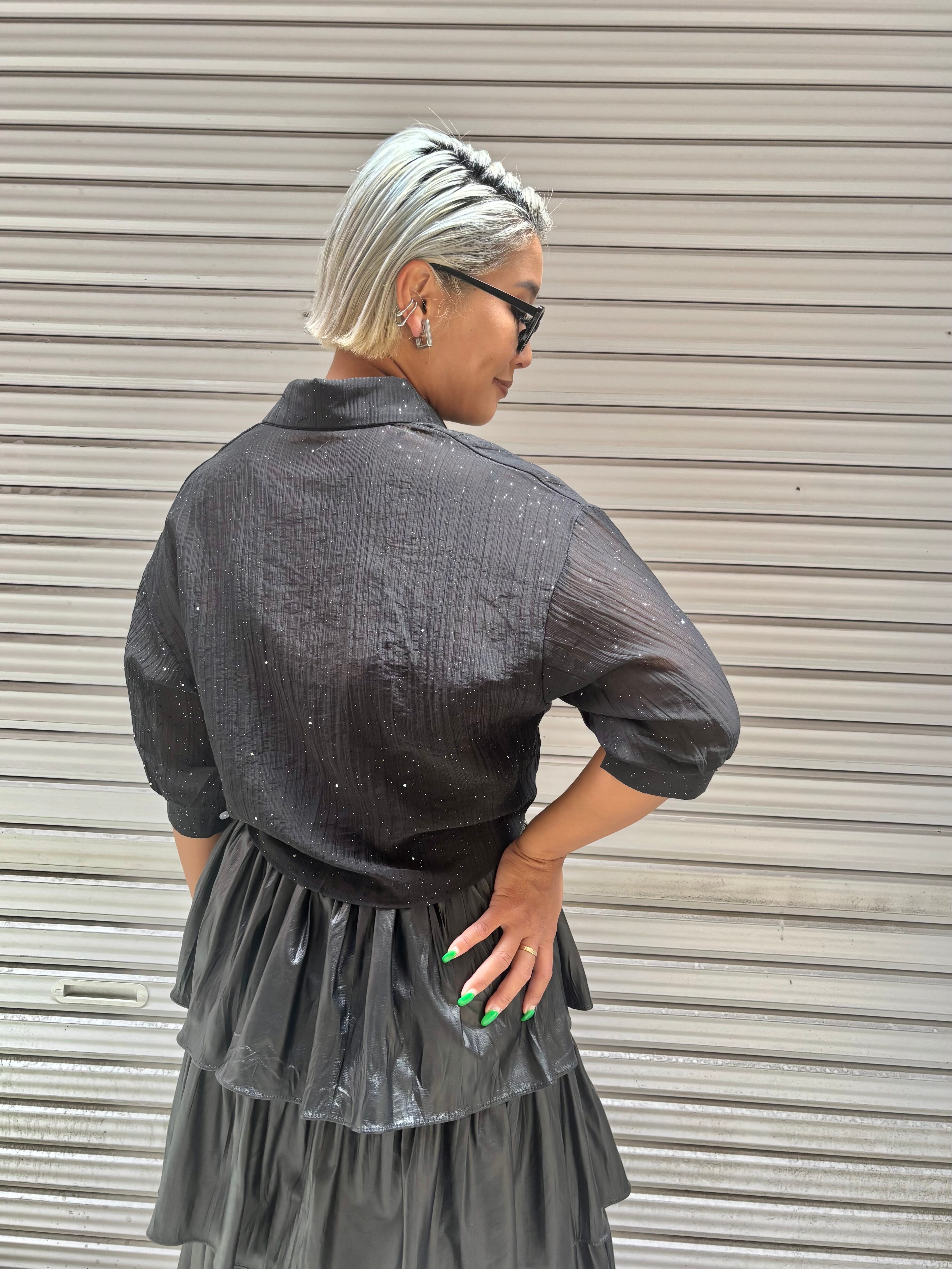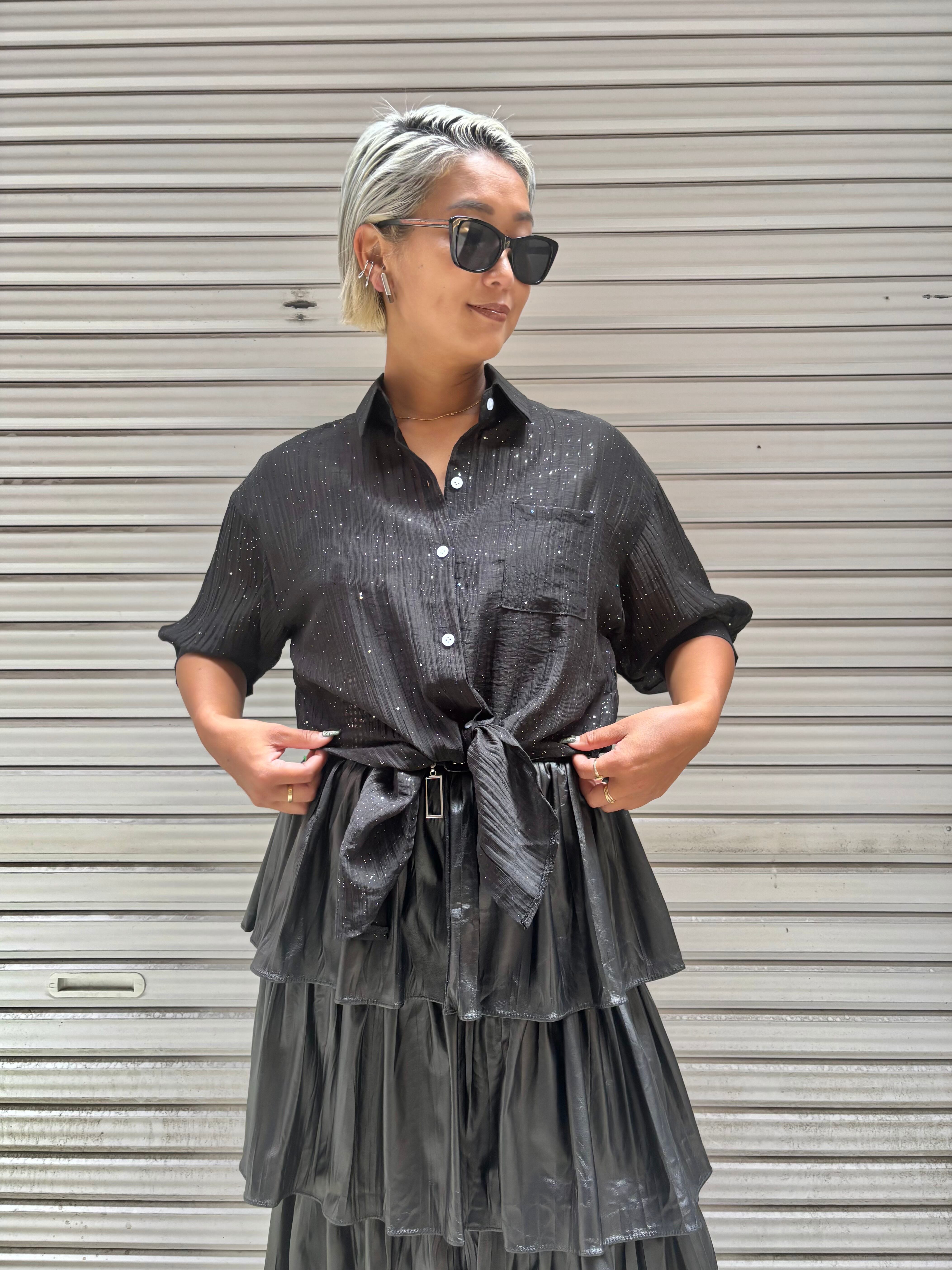 glitter chiffon front ribbon design shir tops シャツ トップス シフォン グリッター シースルー 前結び ブラック 黒