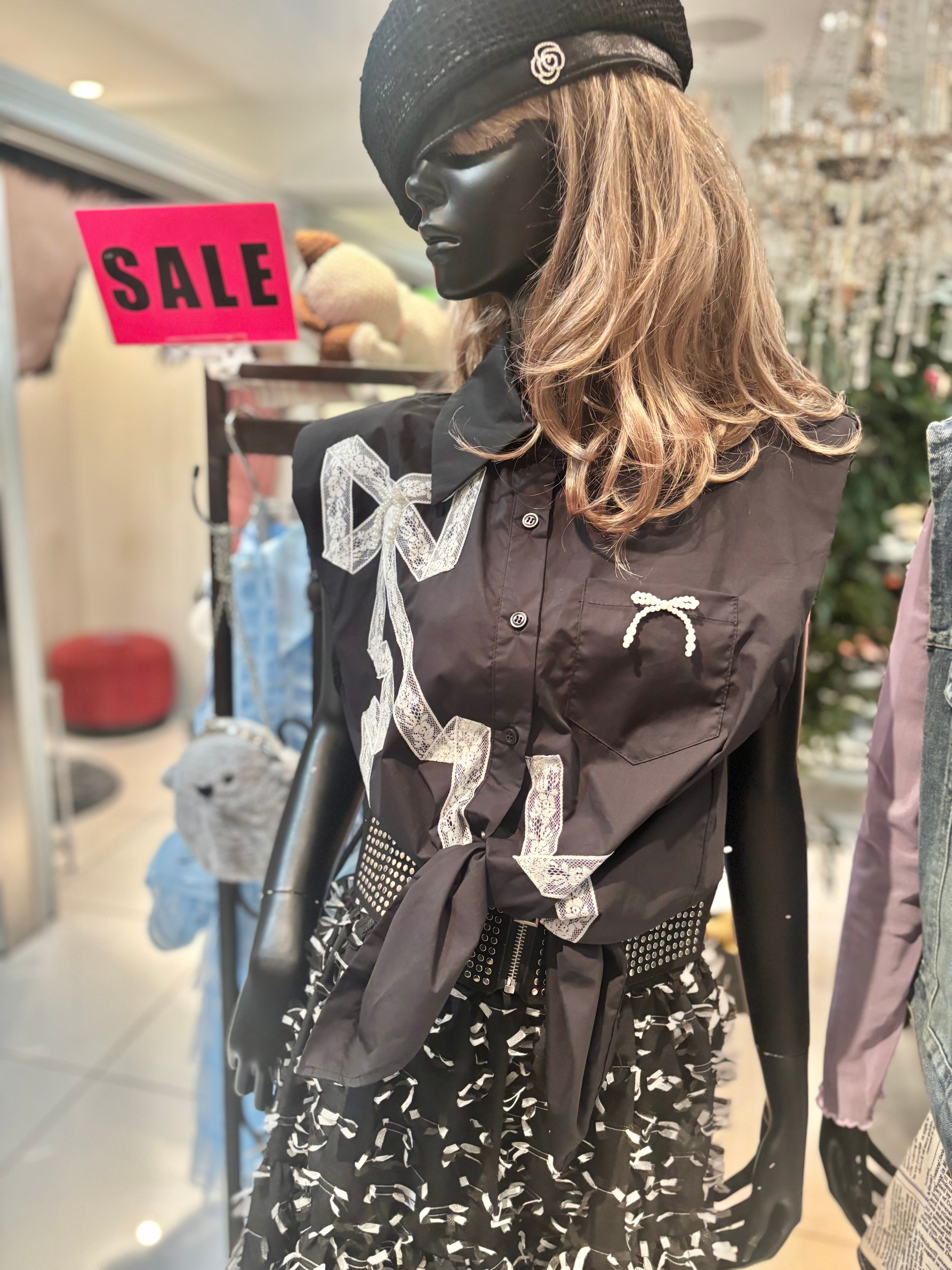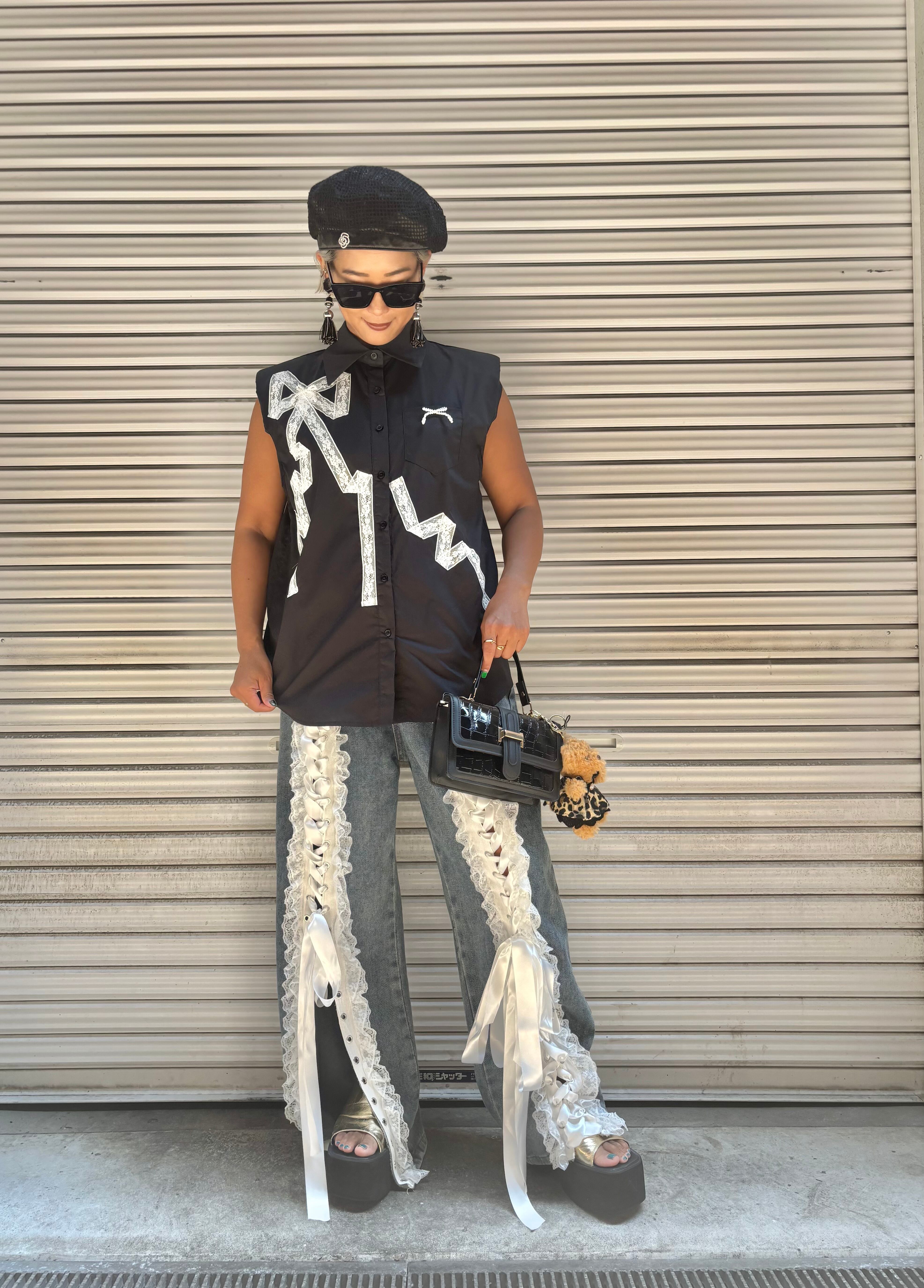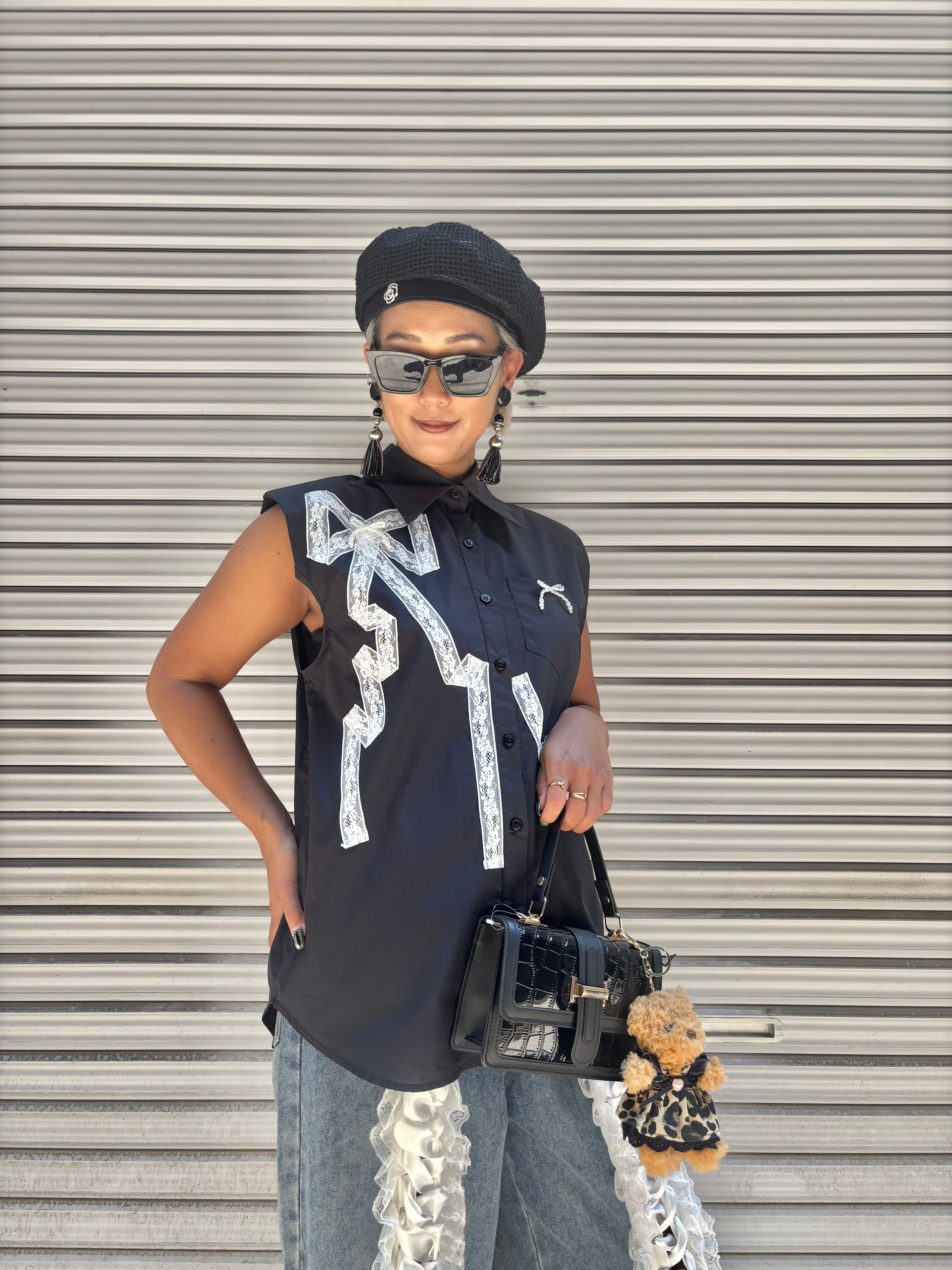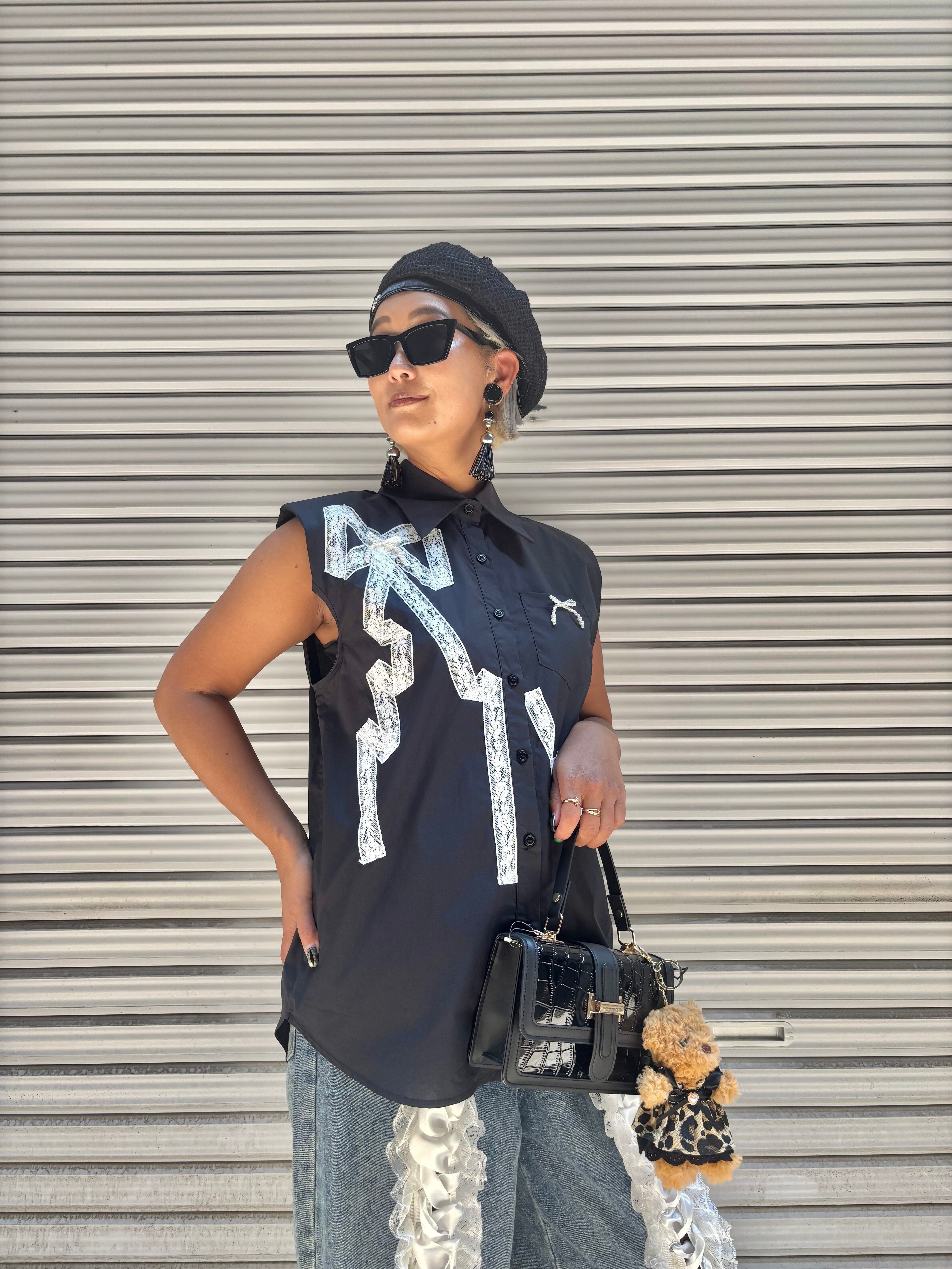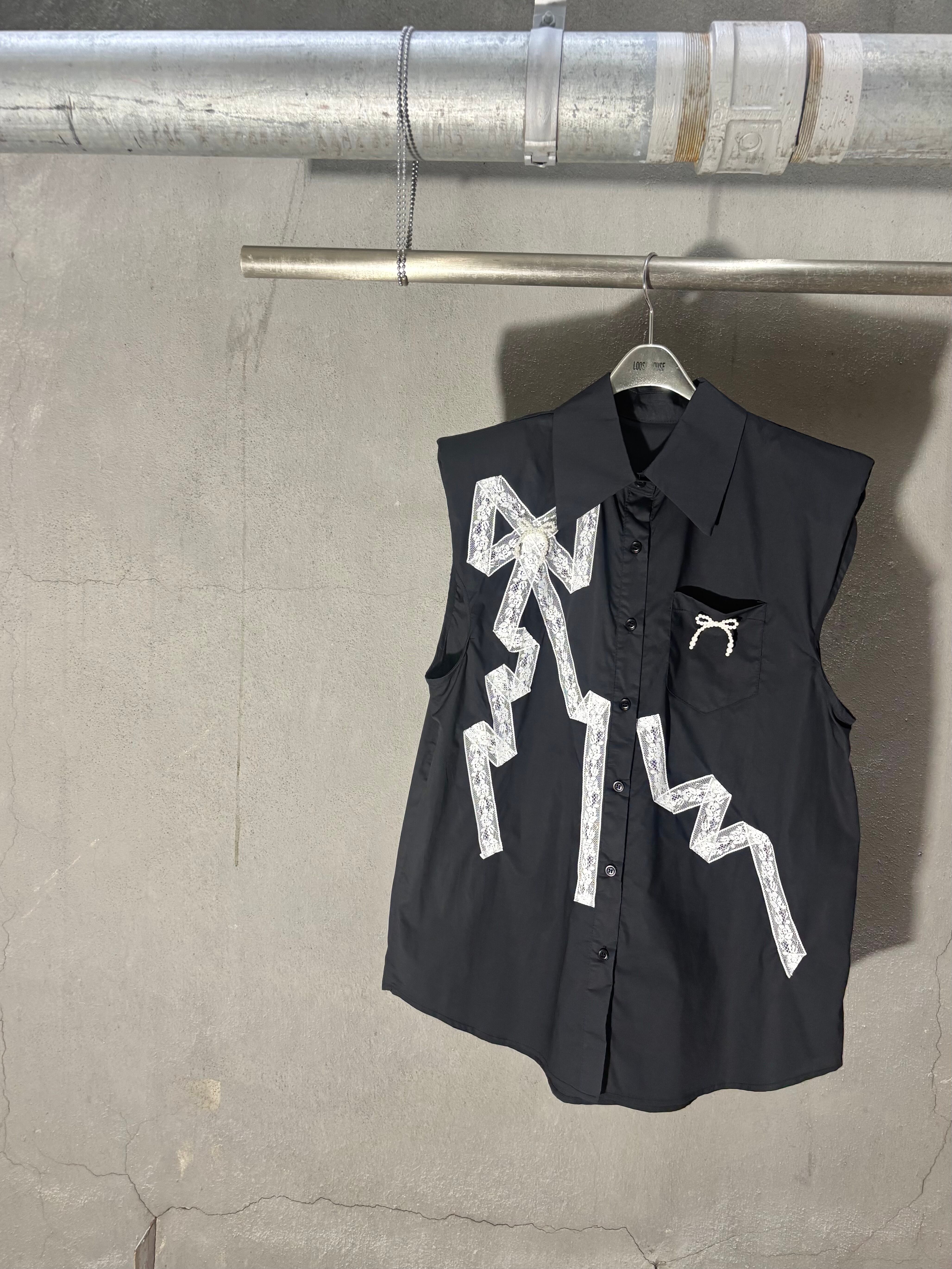 white lace × pearl ribbon design sleeveless shirt シャツ レース リボン パール ノースリーブ ブラック 黒