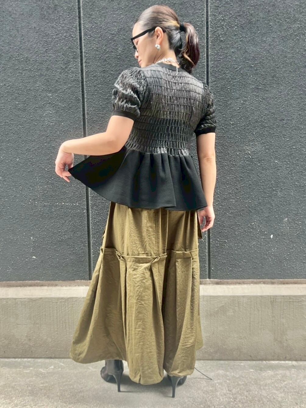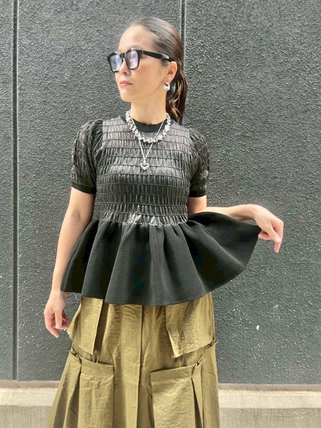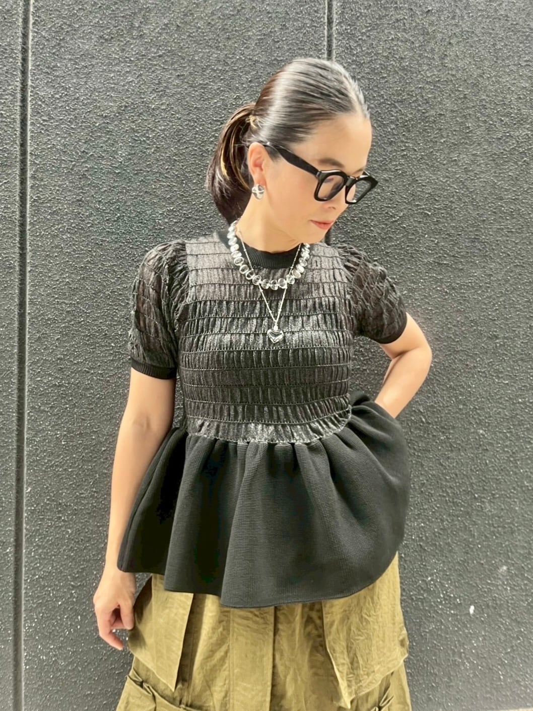 シンプルなブラックカラーは、どんなスタイルとも相性抜群。シャーリングの切替デザインが、女性らしいシルエットを演出してくれます。さりげないキラキラ感が日常のコーディネートに華やかさをプラスします!