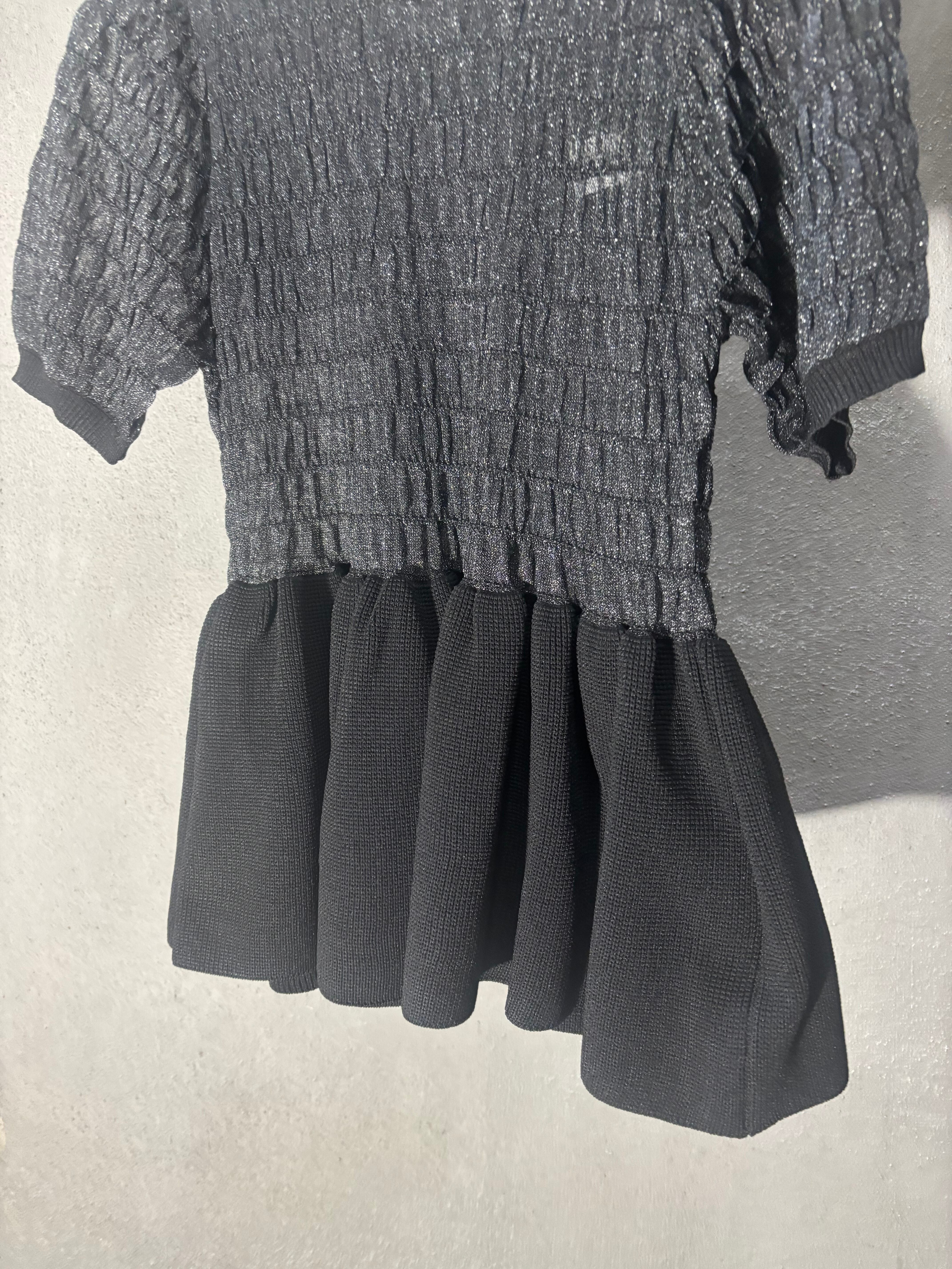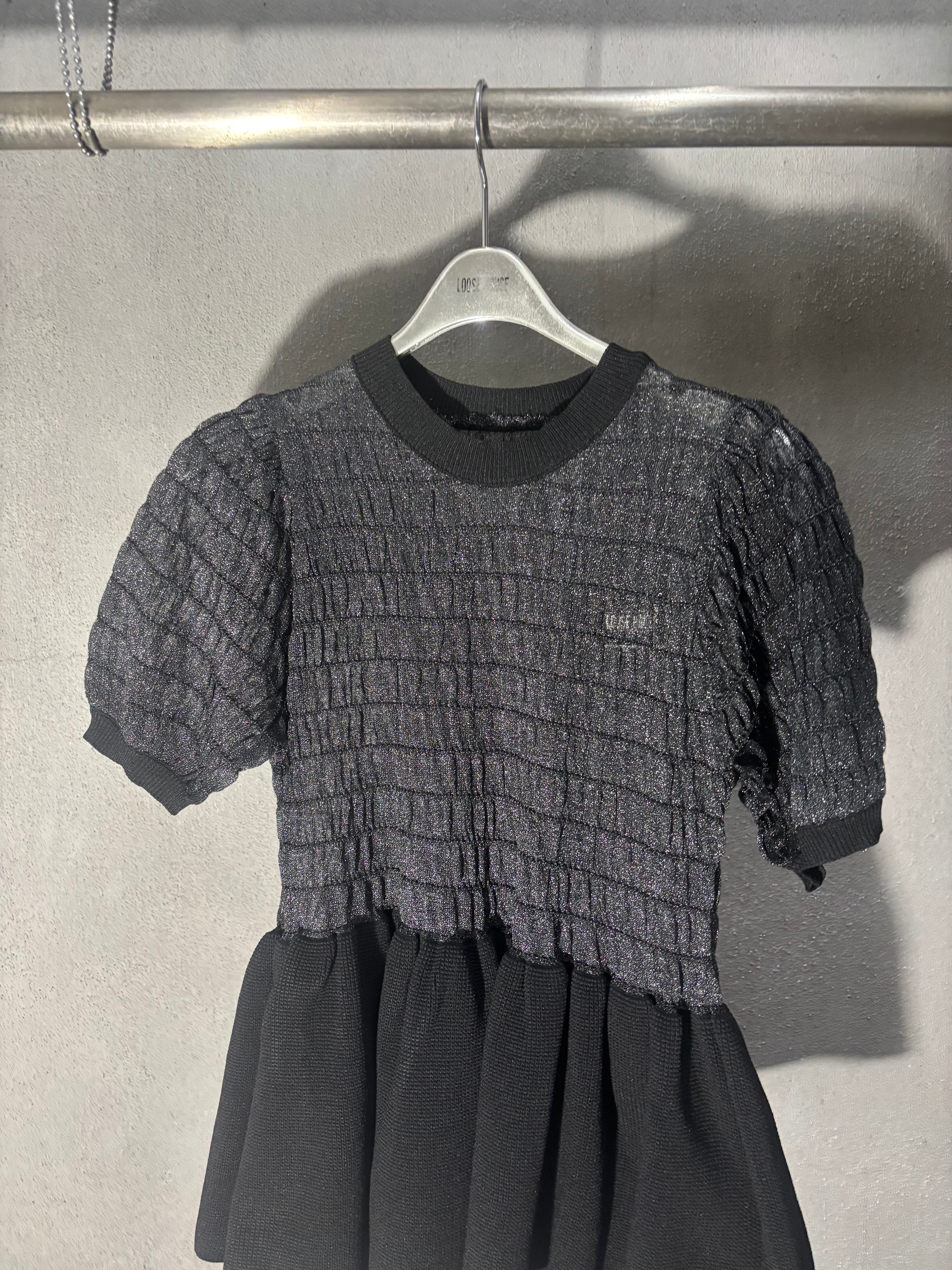 glitter × shirring design knit tops トップス グリッター ニット シャーリング 切替デザイン 半袖 黒 ブラック