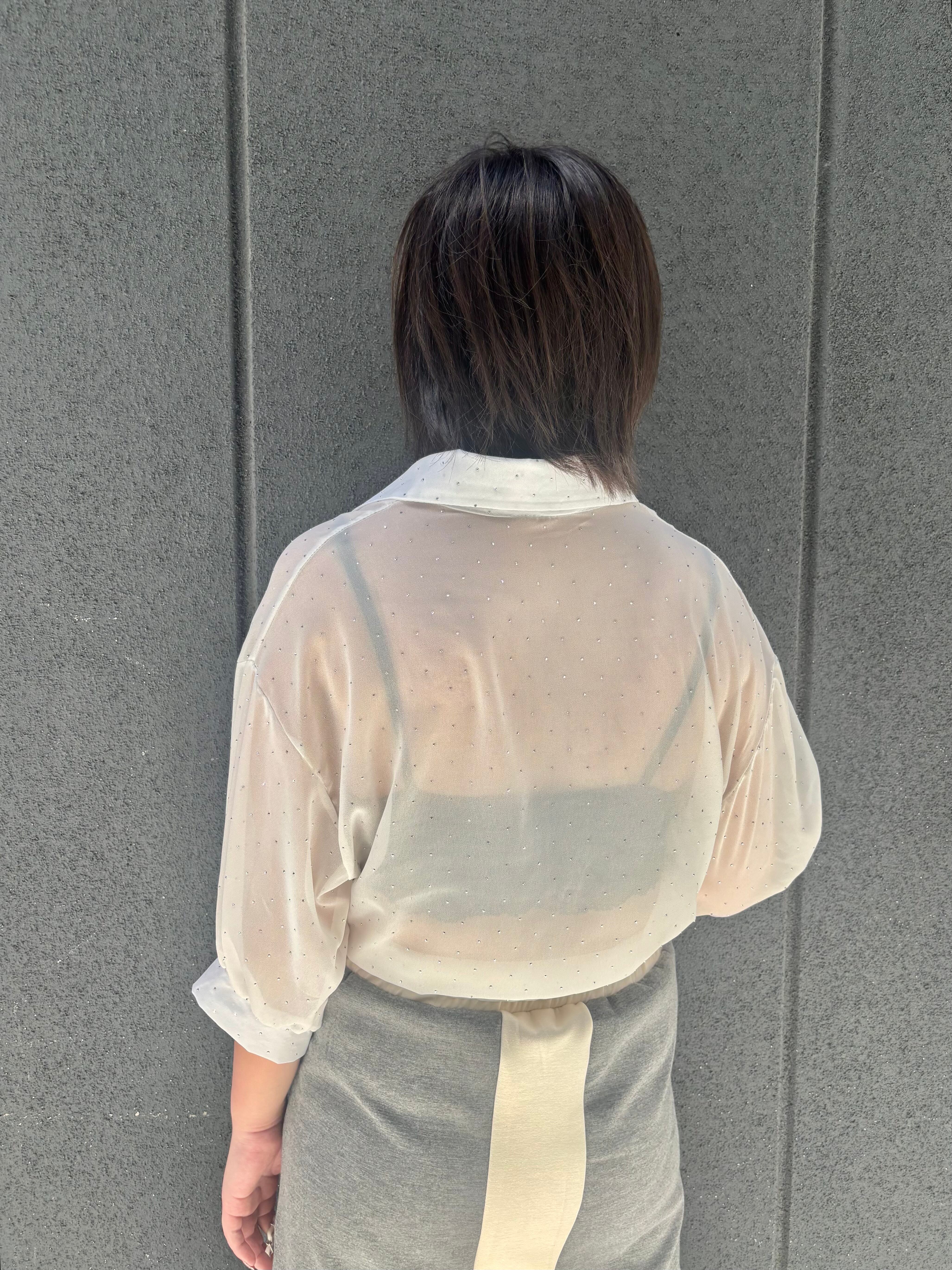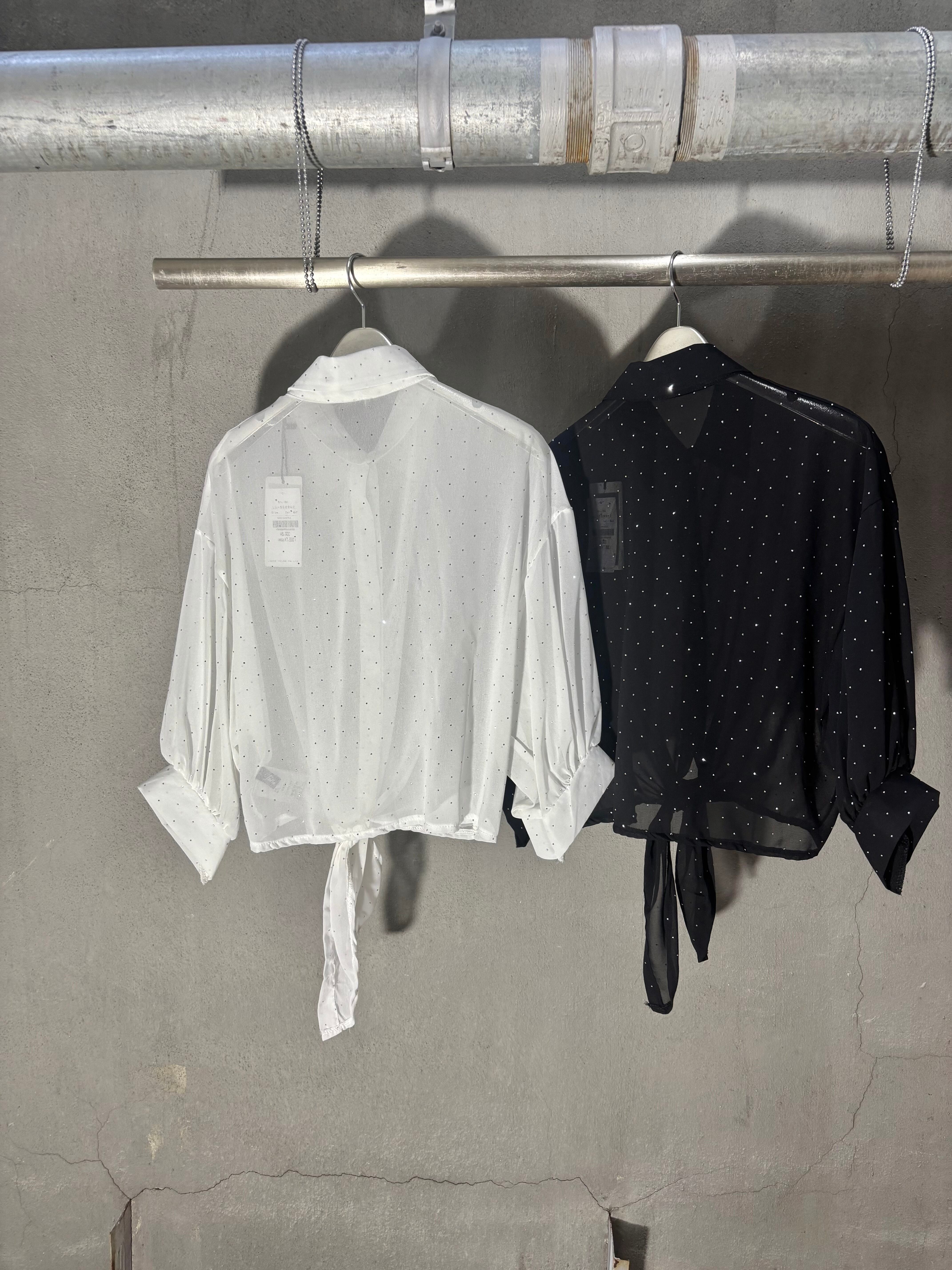 see-through chiffon × mini stone front ribbon design shirt シャツ シースルー シアー リボン ハピス 羽織
