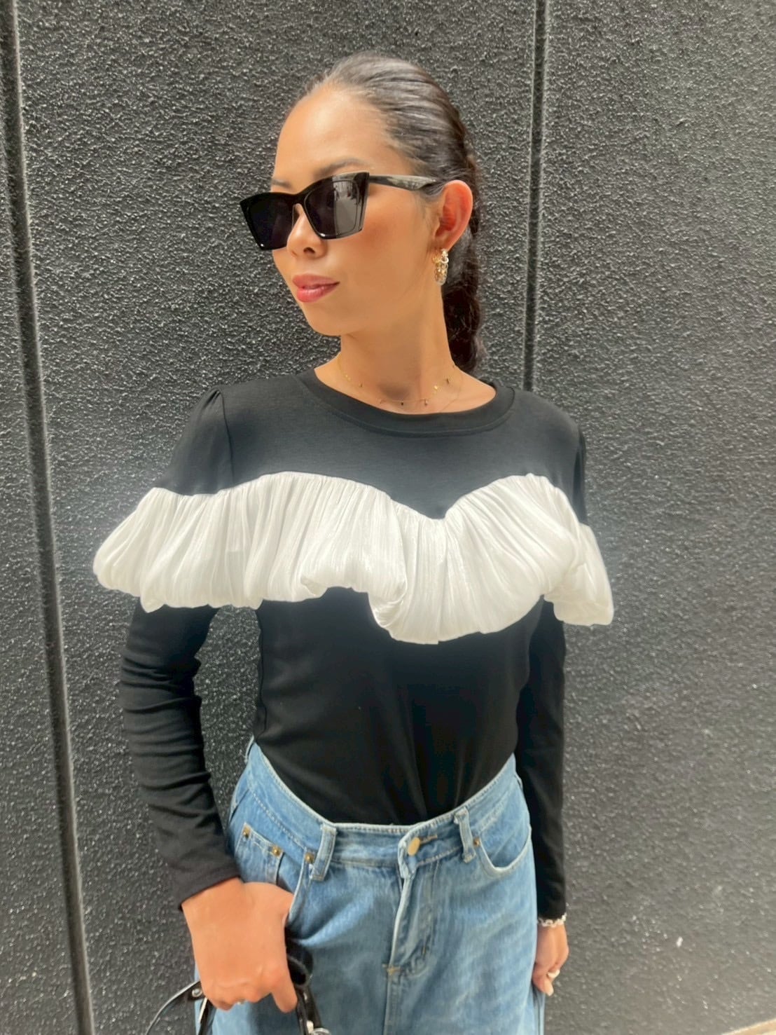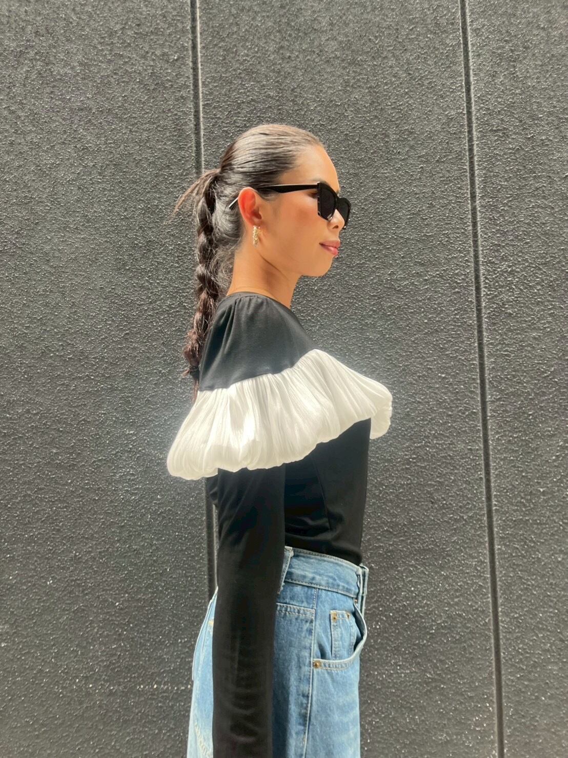 胸元のバルーン切り替えデザインがポイントのトップス♪