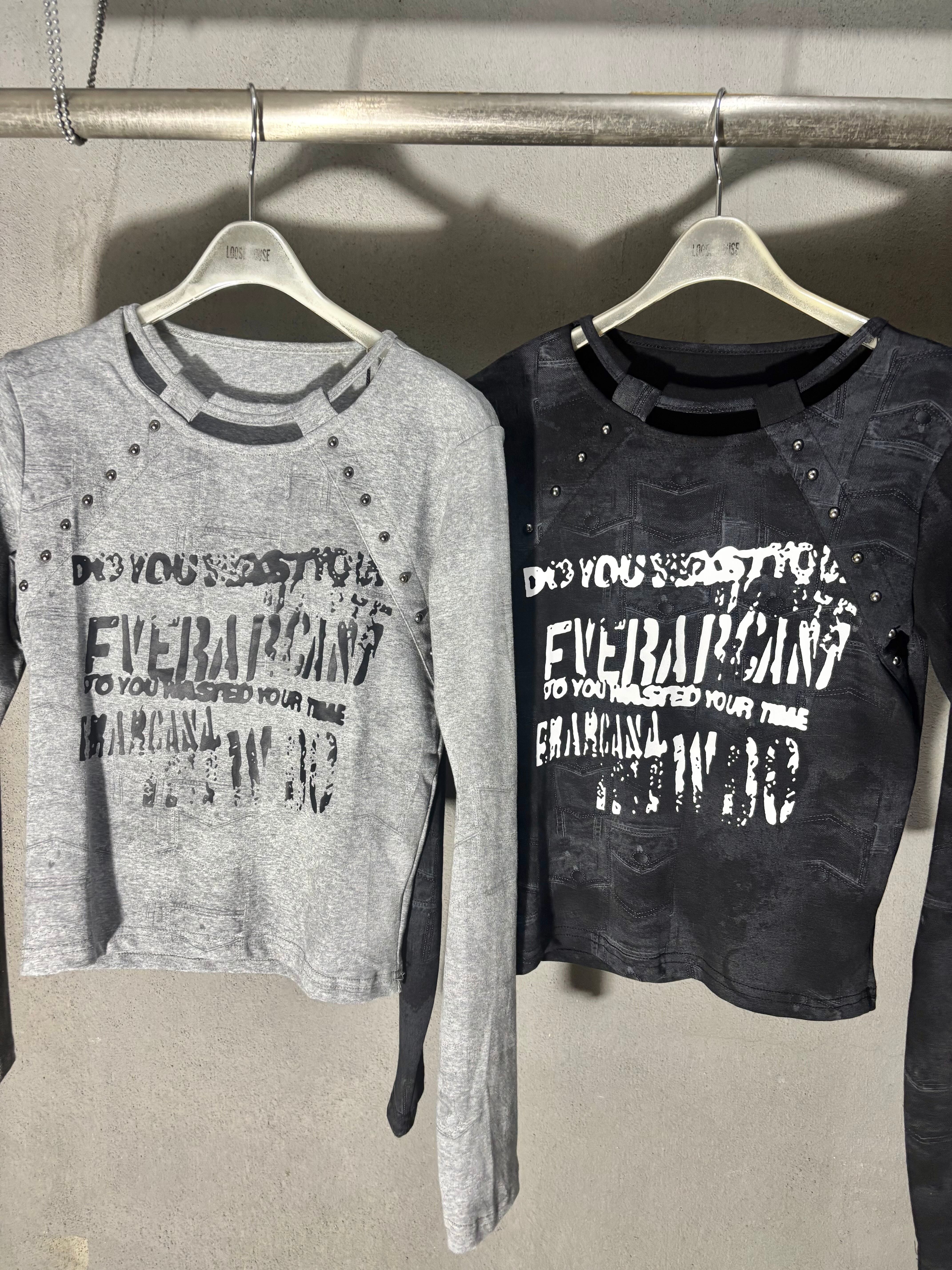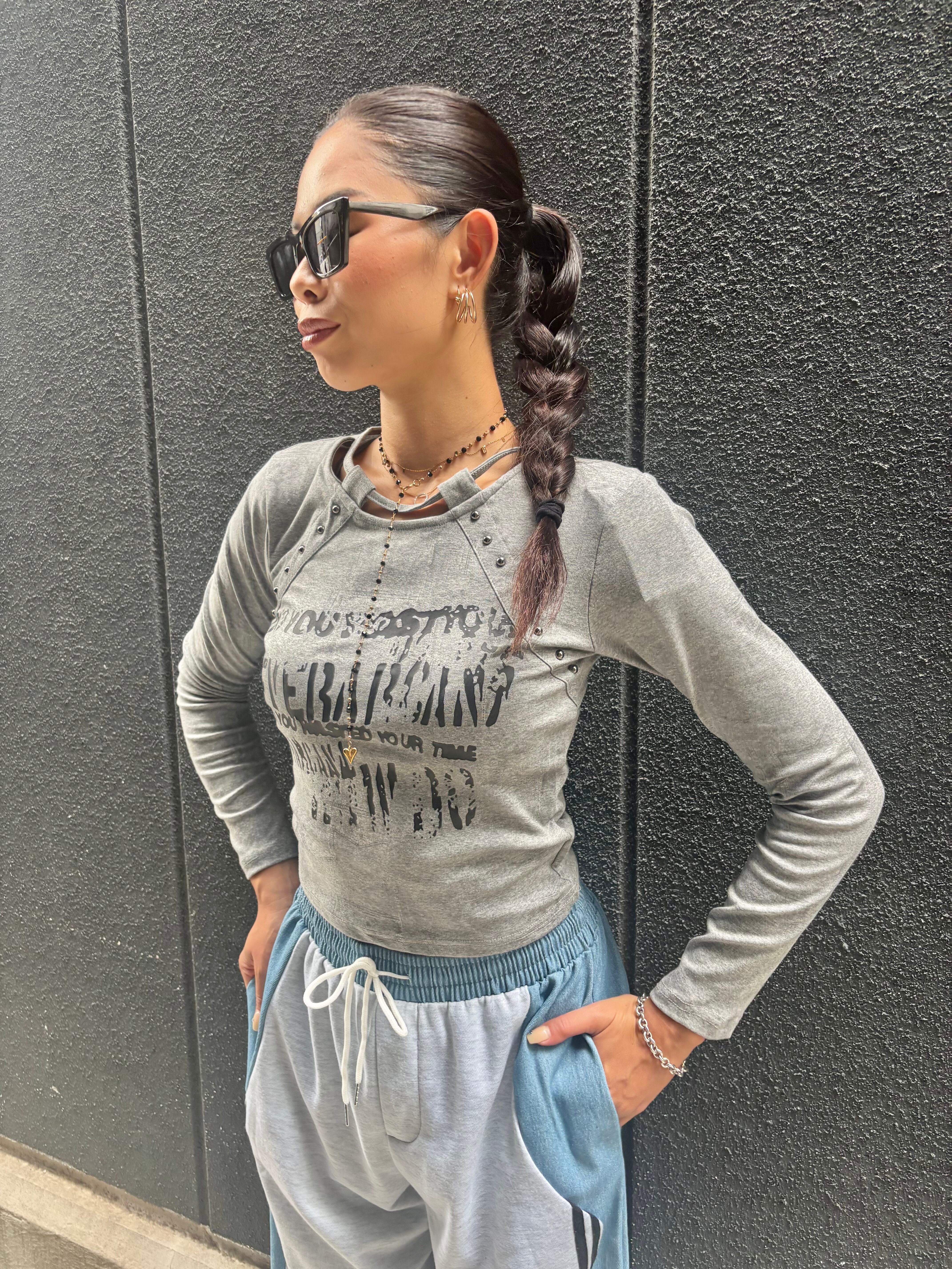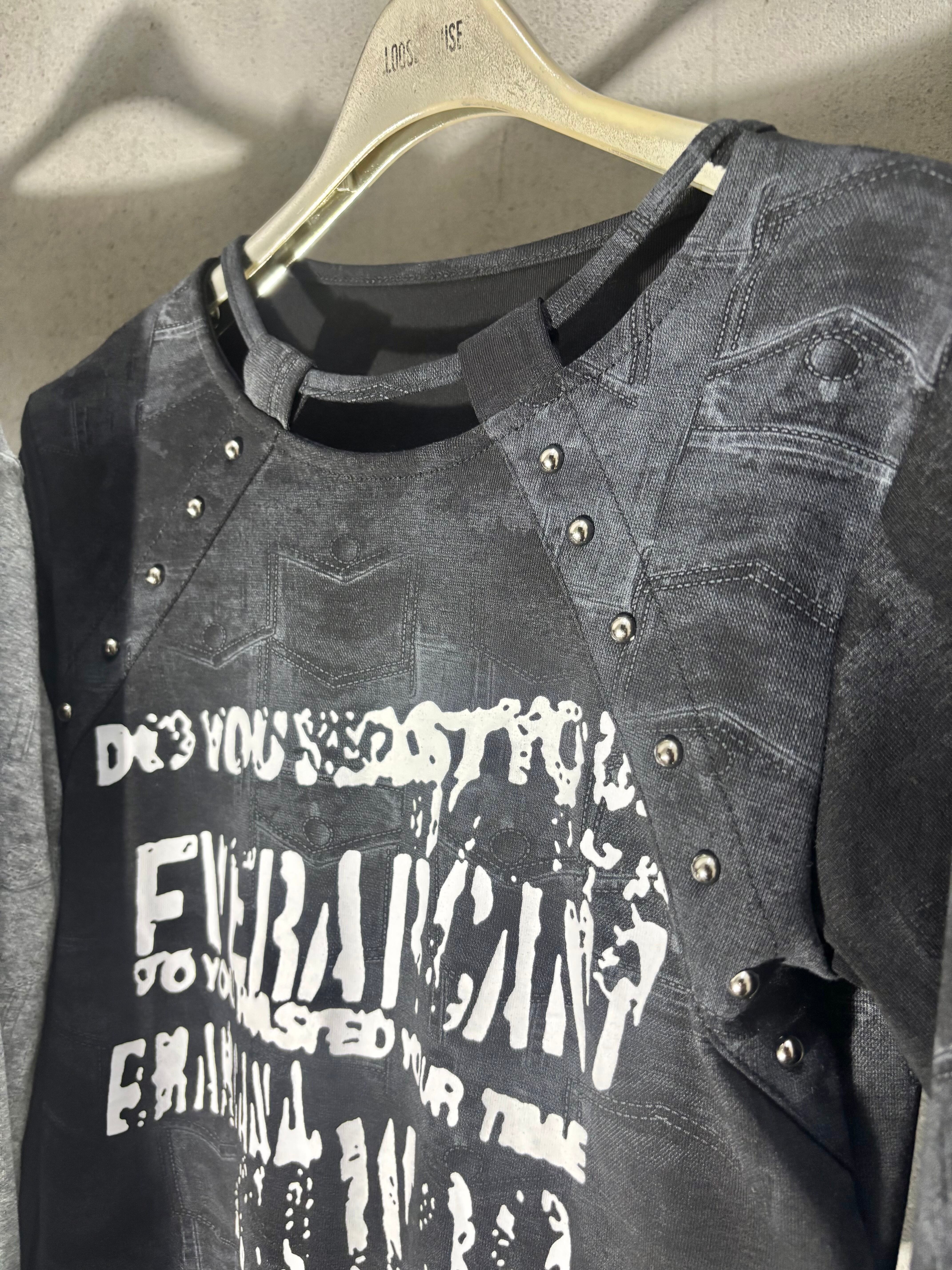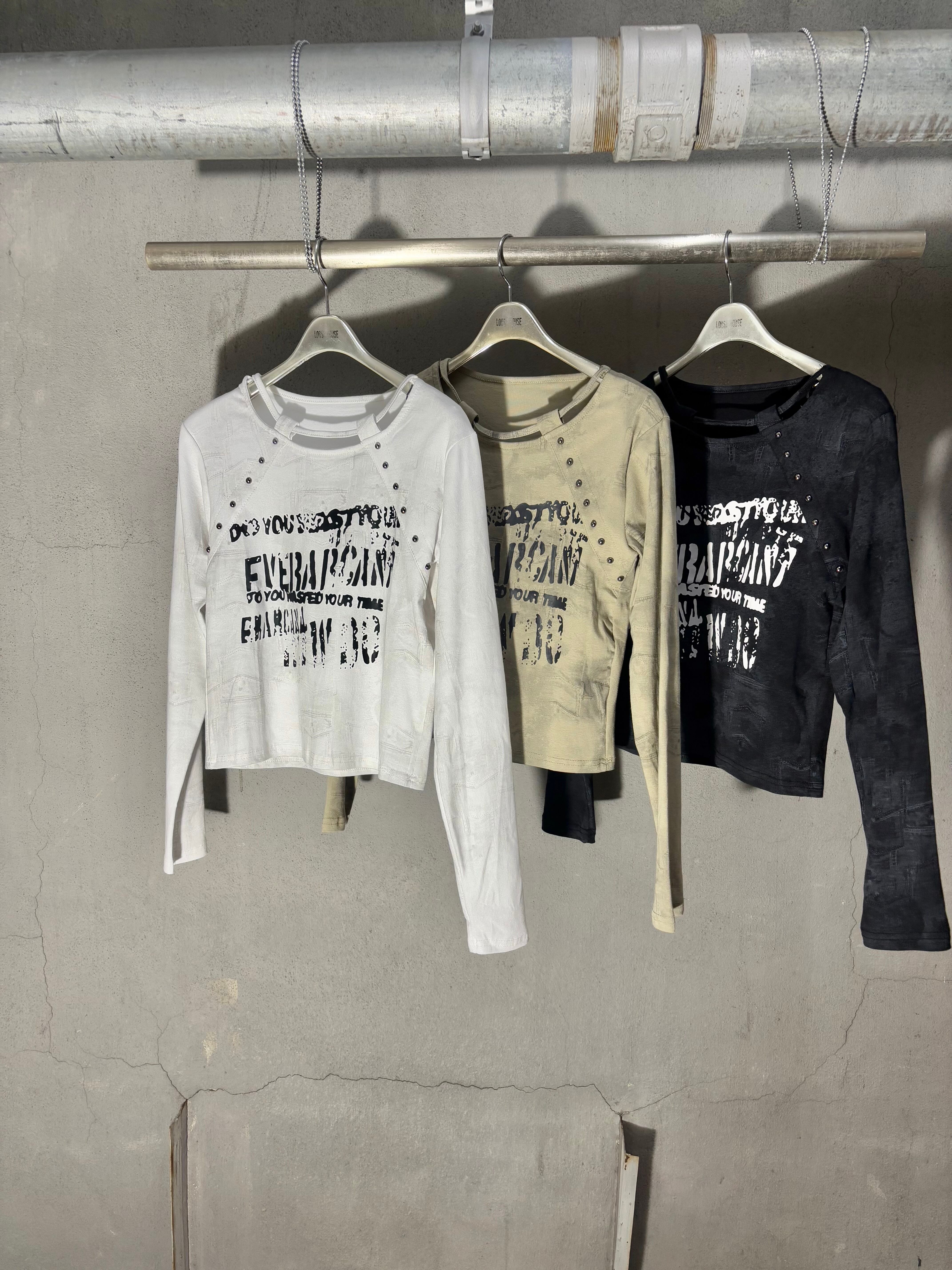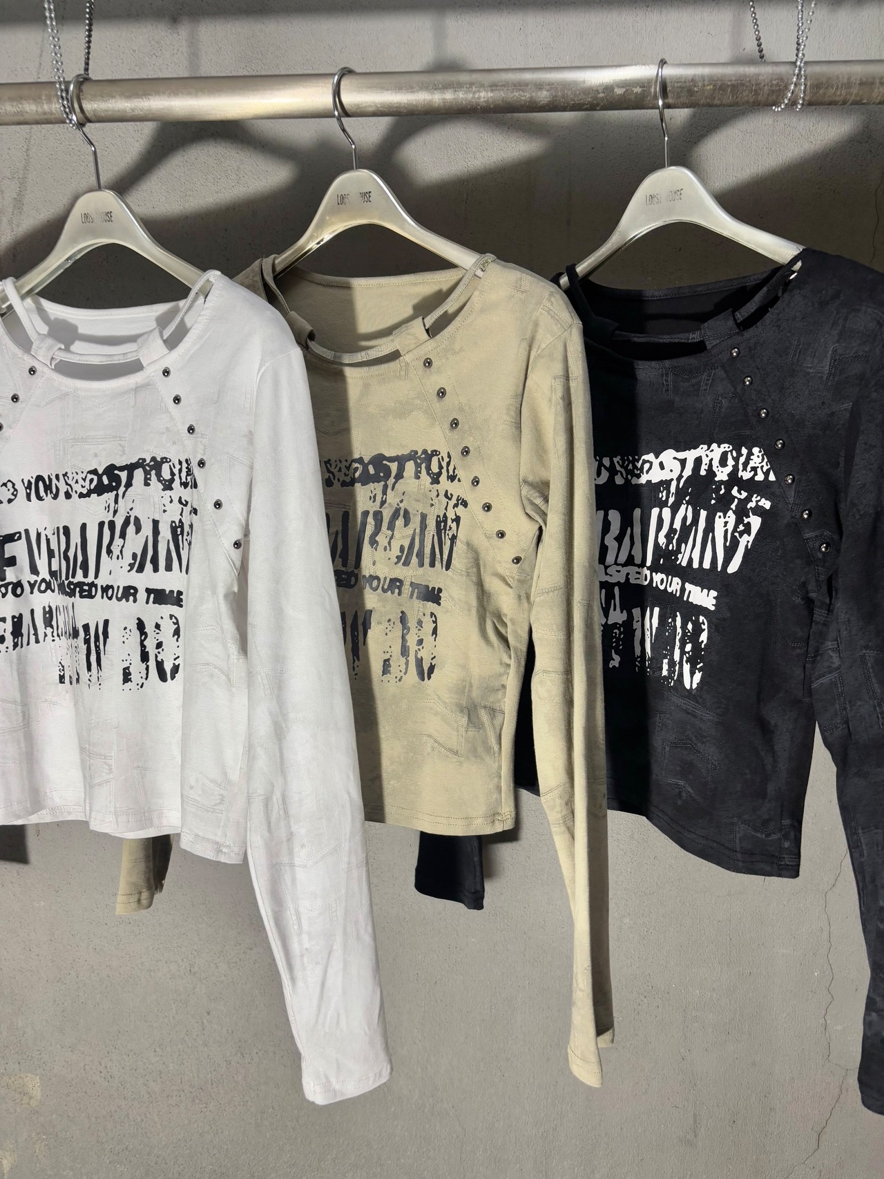 design neck × print long sleeve tops トップス ロングスリーブ プリント スタッズ チビT
