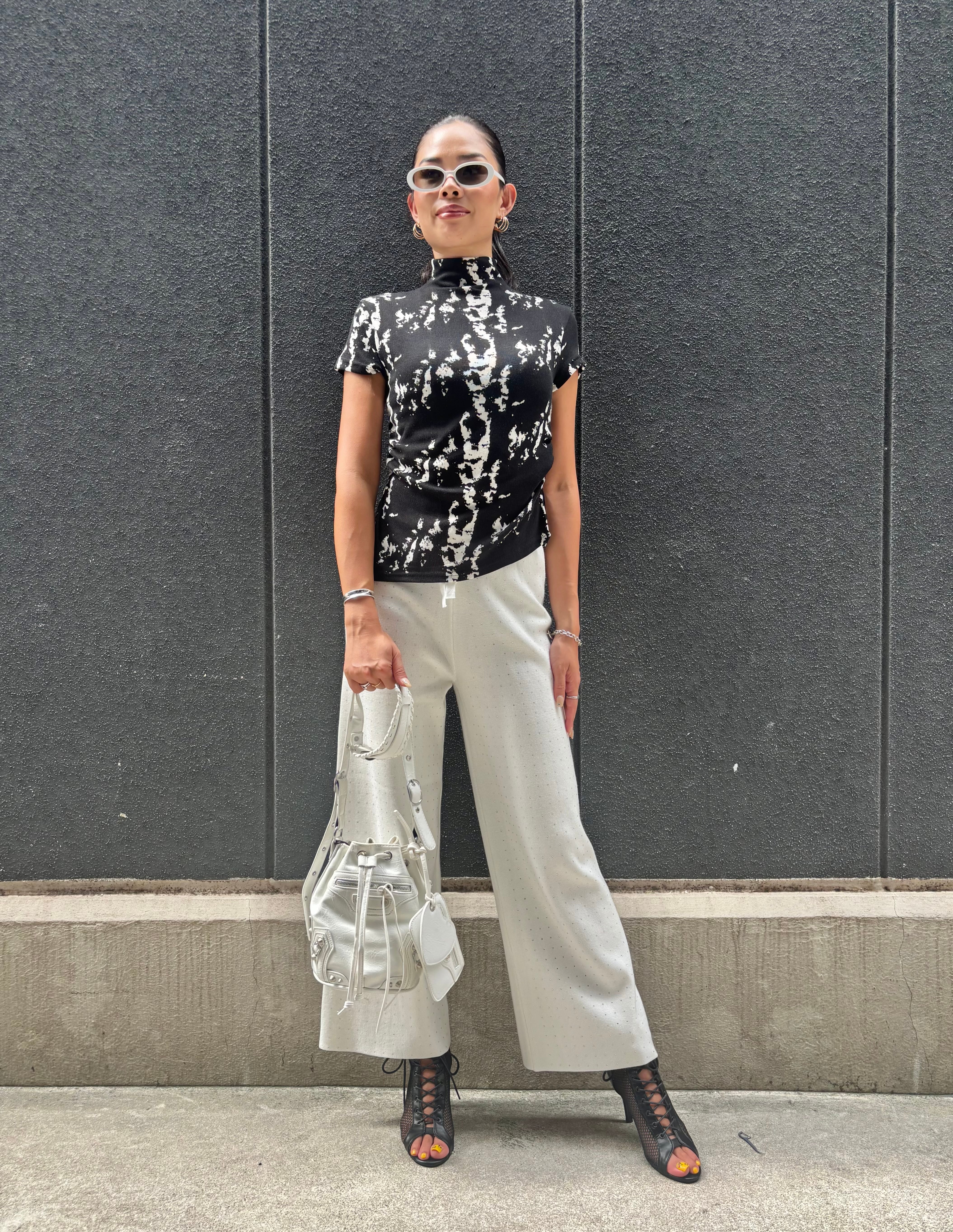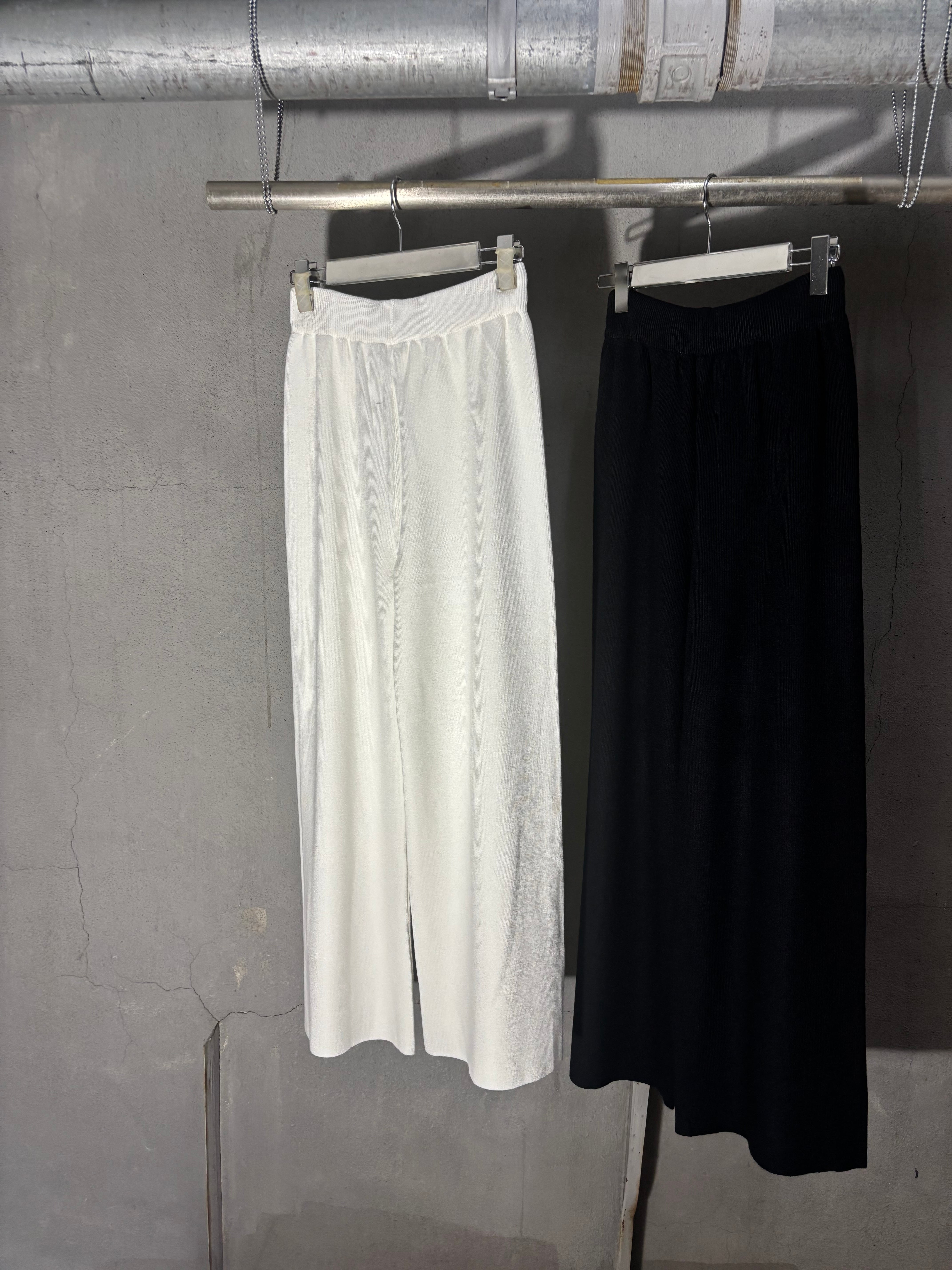 シルバーストーンのキラキラとしたデザインが特徴のニットワイドパンツです。