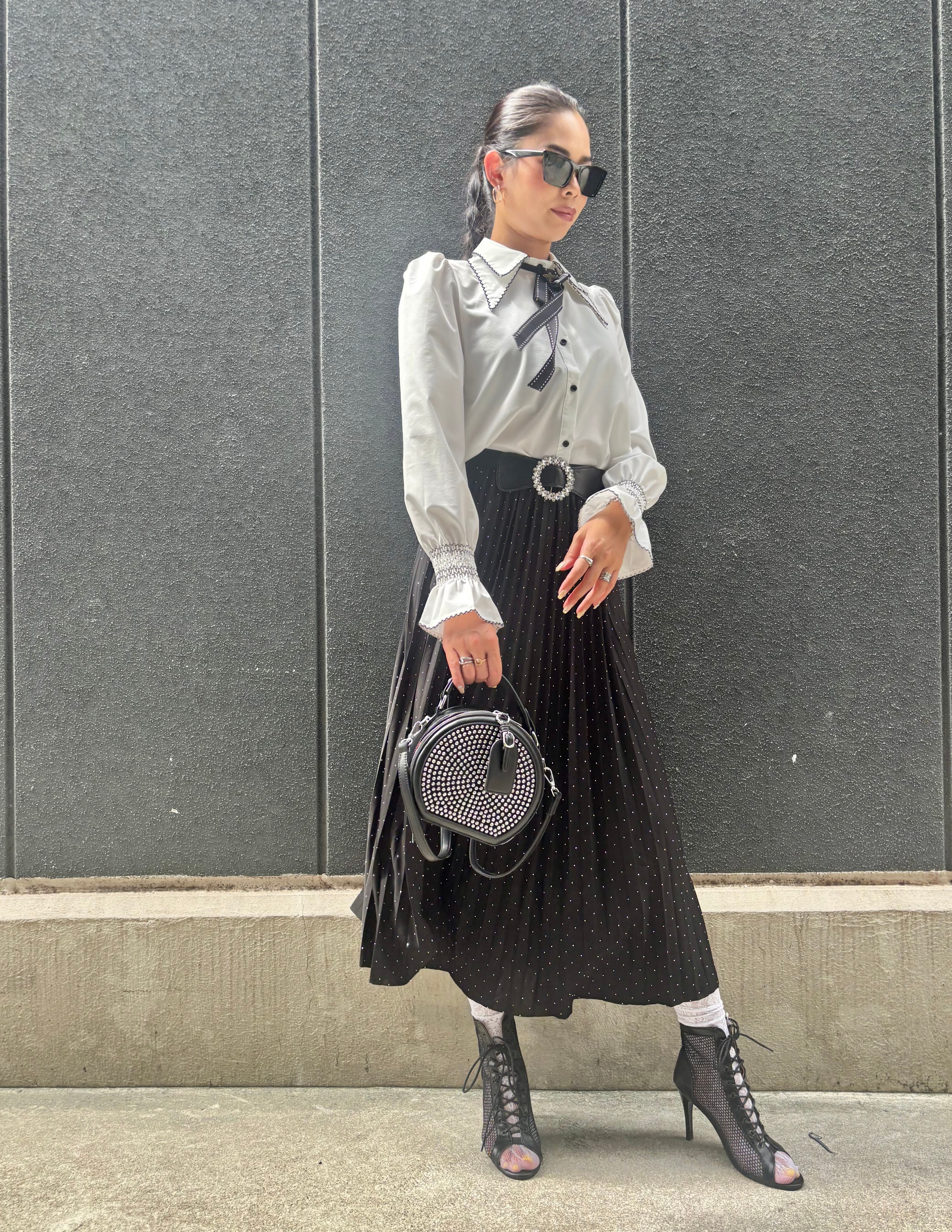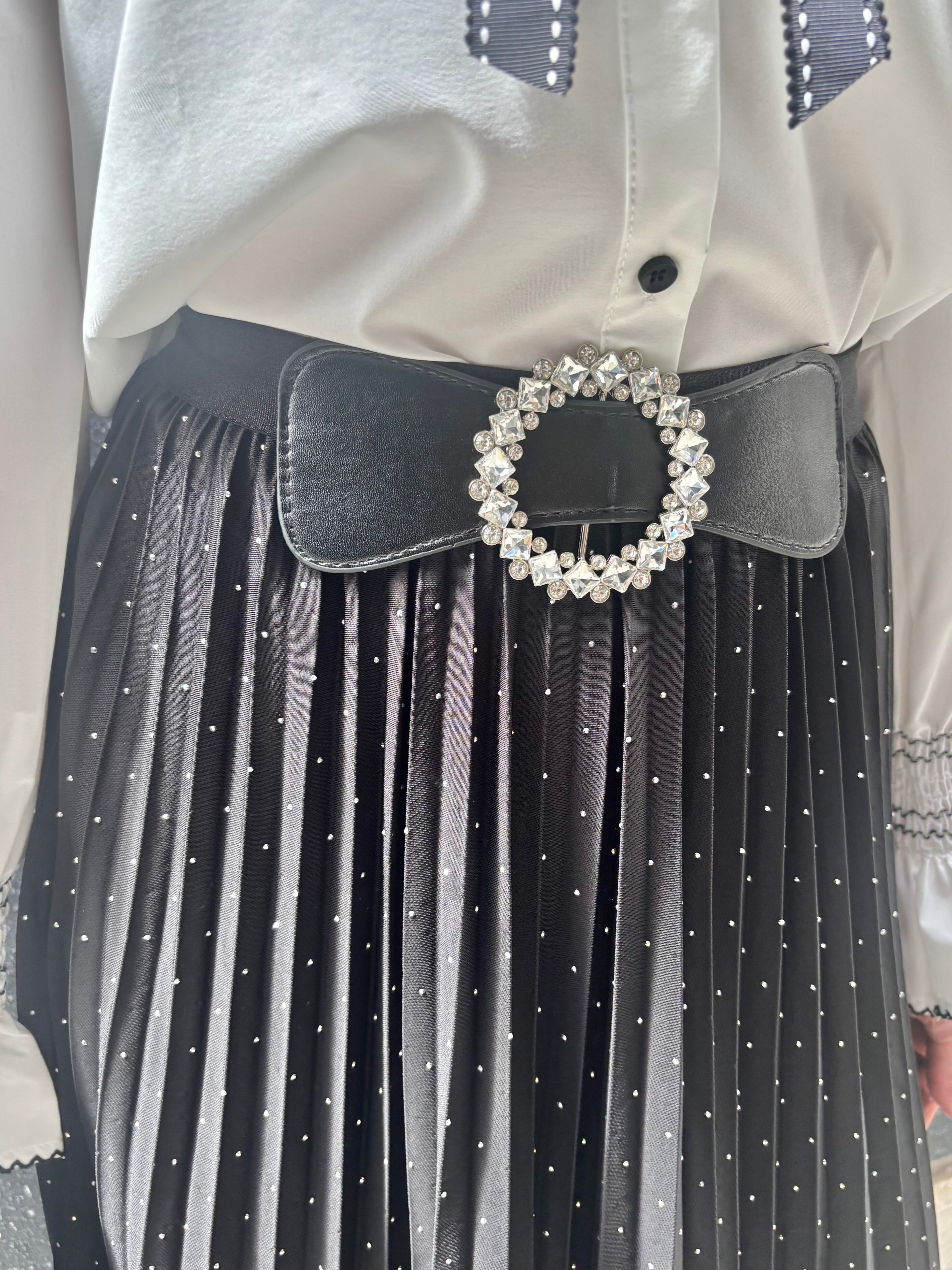 mini silver stone × buckle design pleats skirt スカート プリーツ ハピス ストーン バックル ブラック 黒