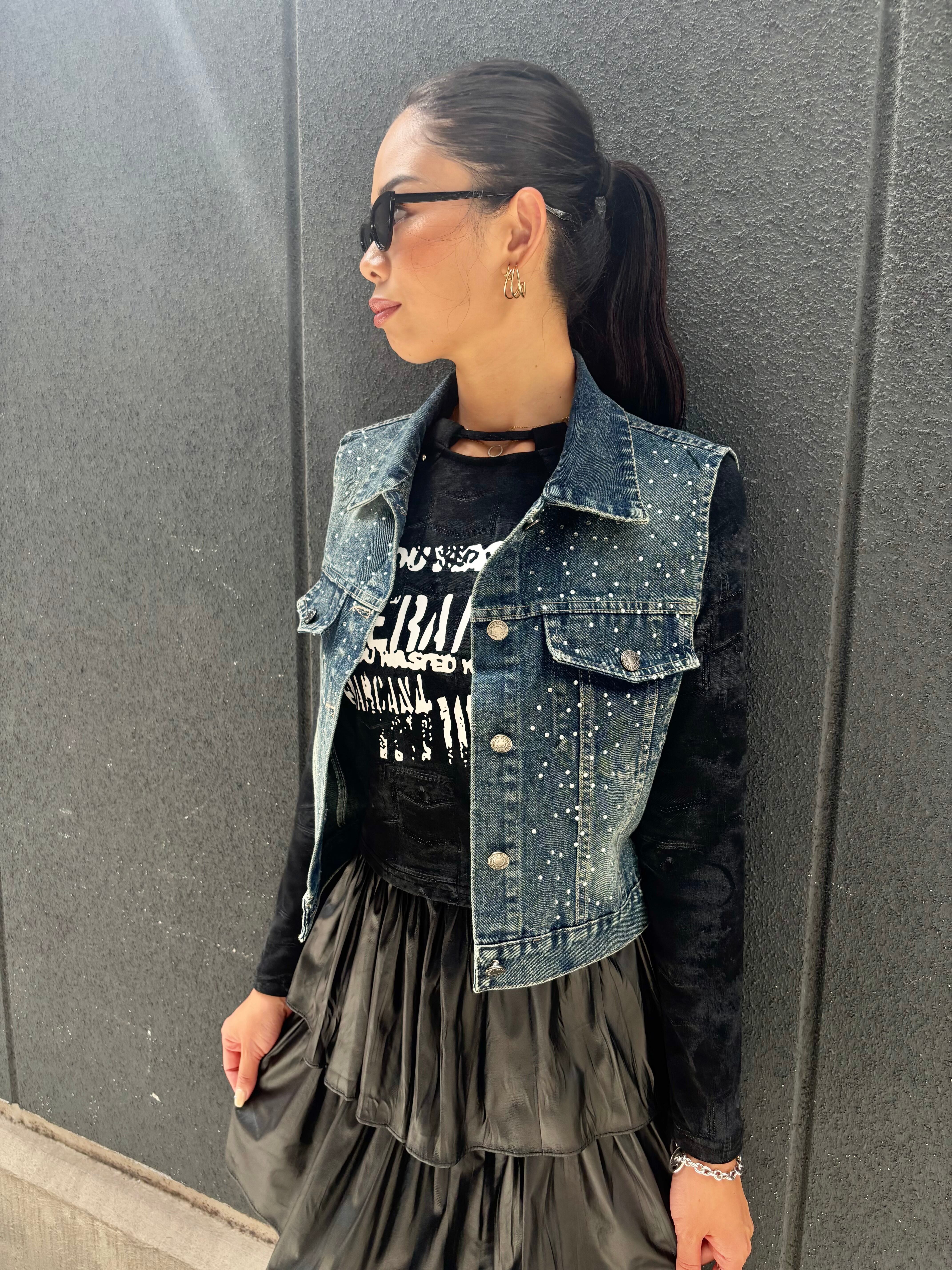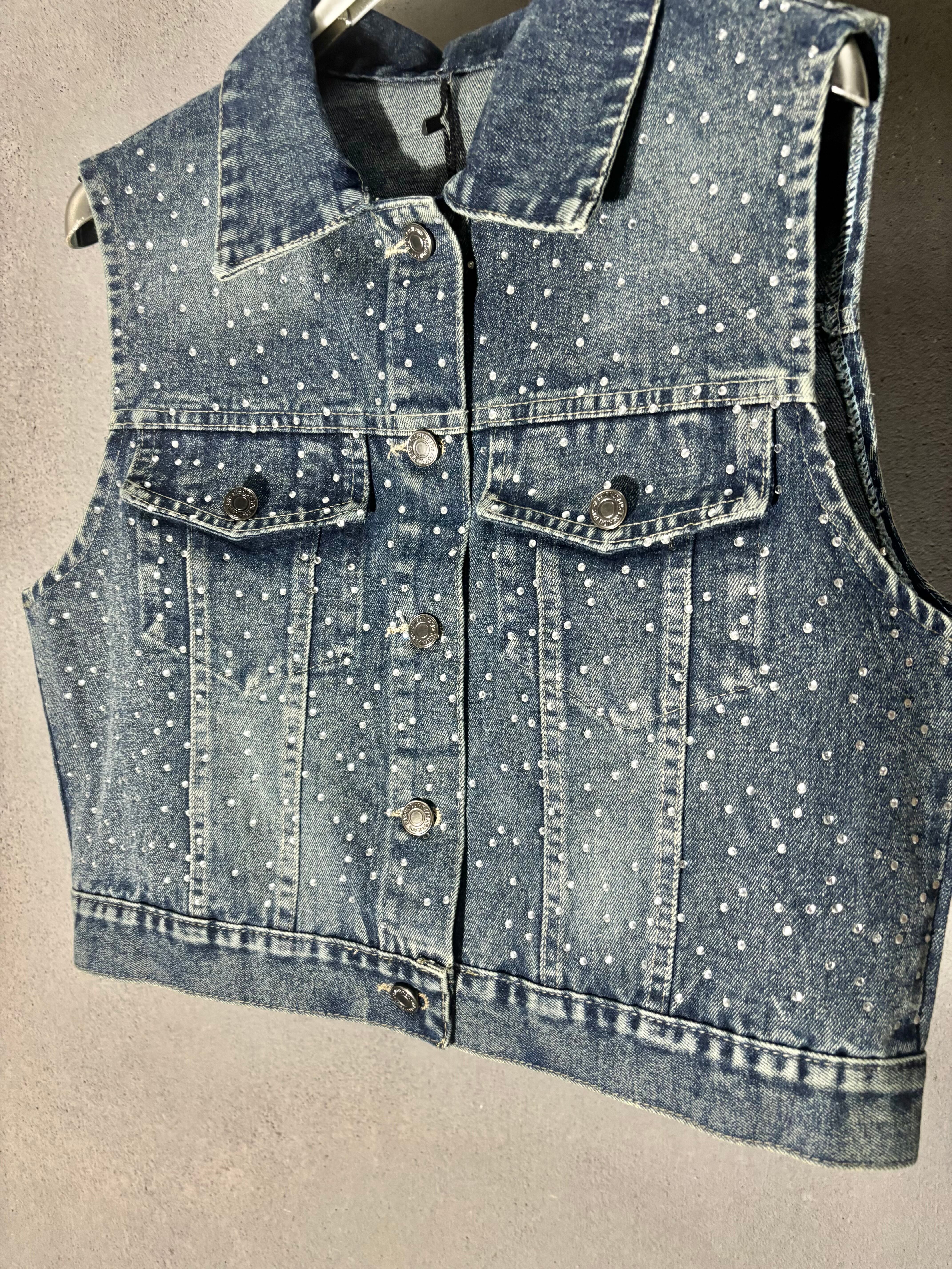 シルバーストーンが施されたデニムベストです。視線を引くキラキラとしたデザインは、重ね着にも最適で、おしゃれのポイントになります!