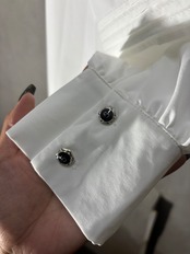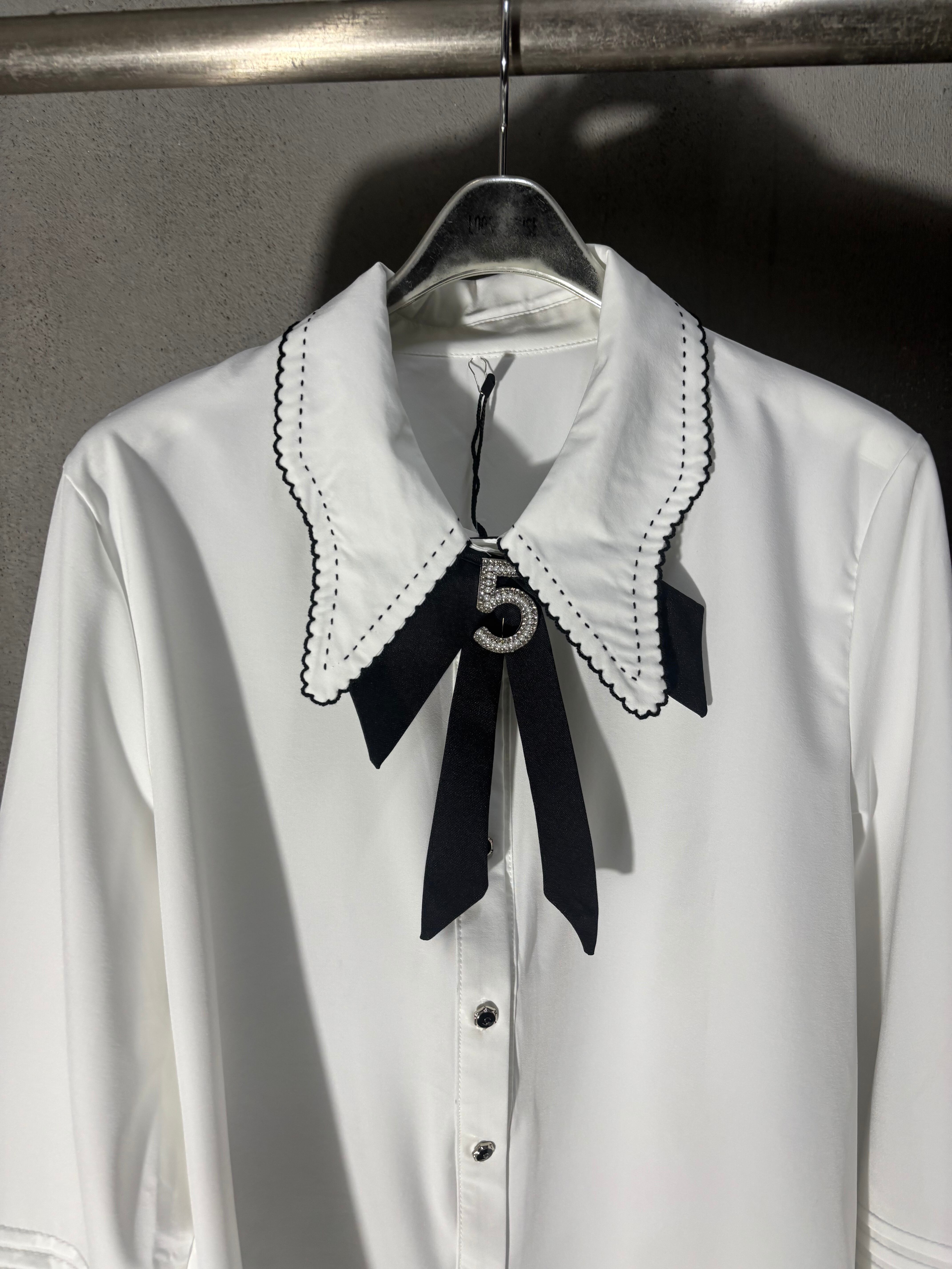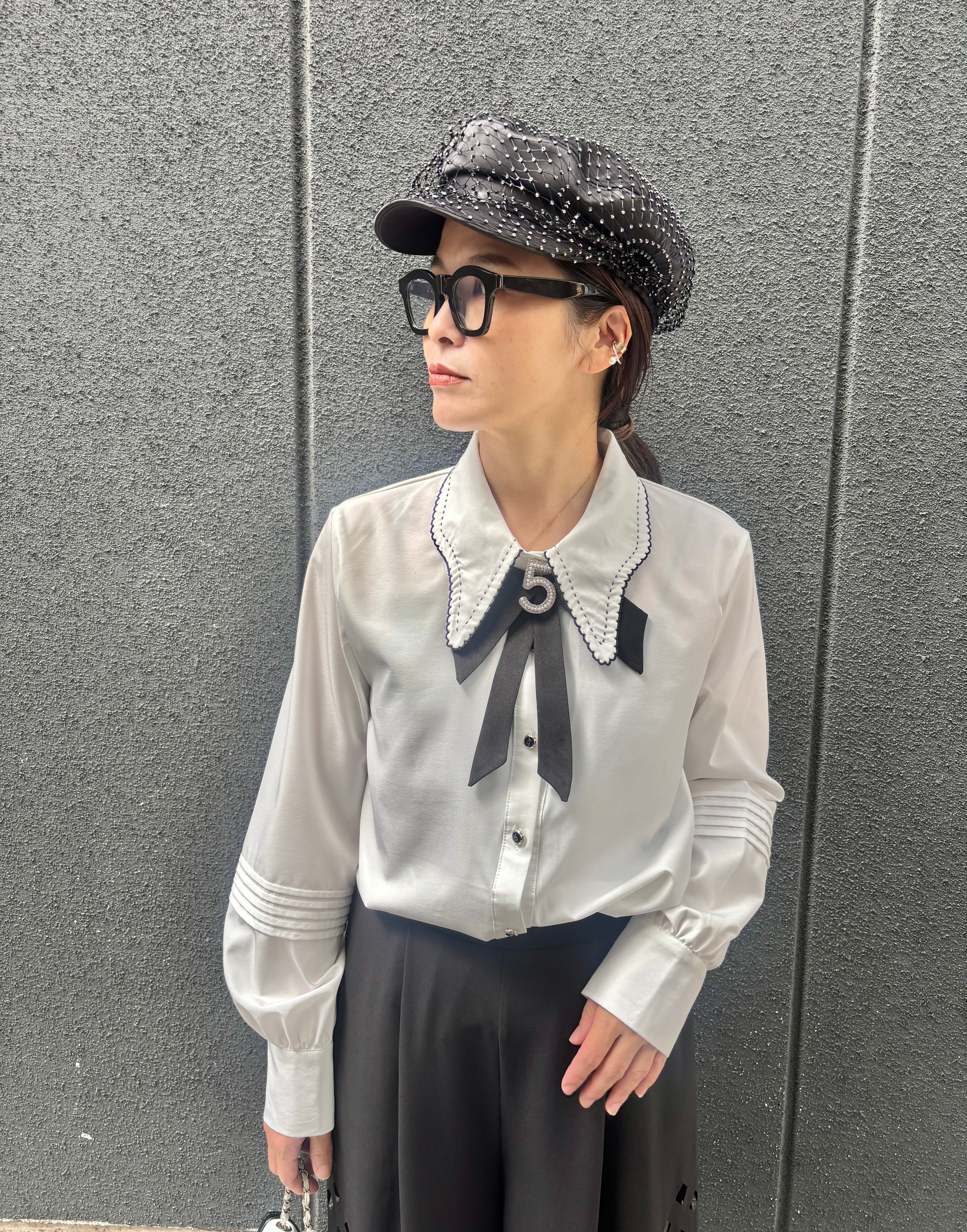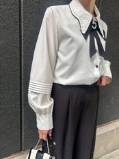 black stitch × ribbon tie design white shirt シャツ ブラウス ステッチ リボン タイ 白シャツ