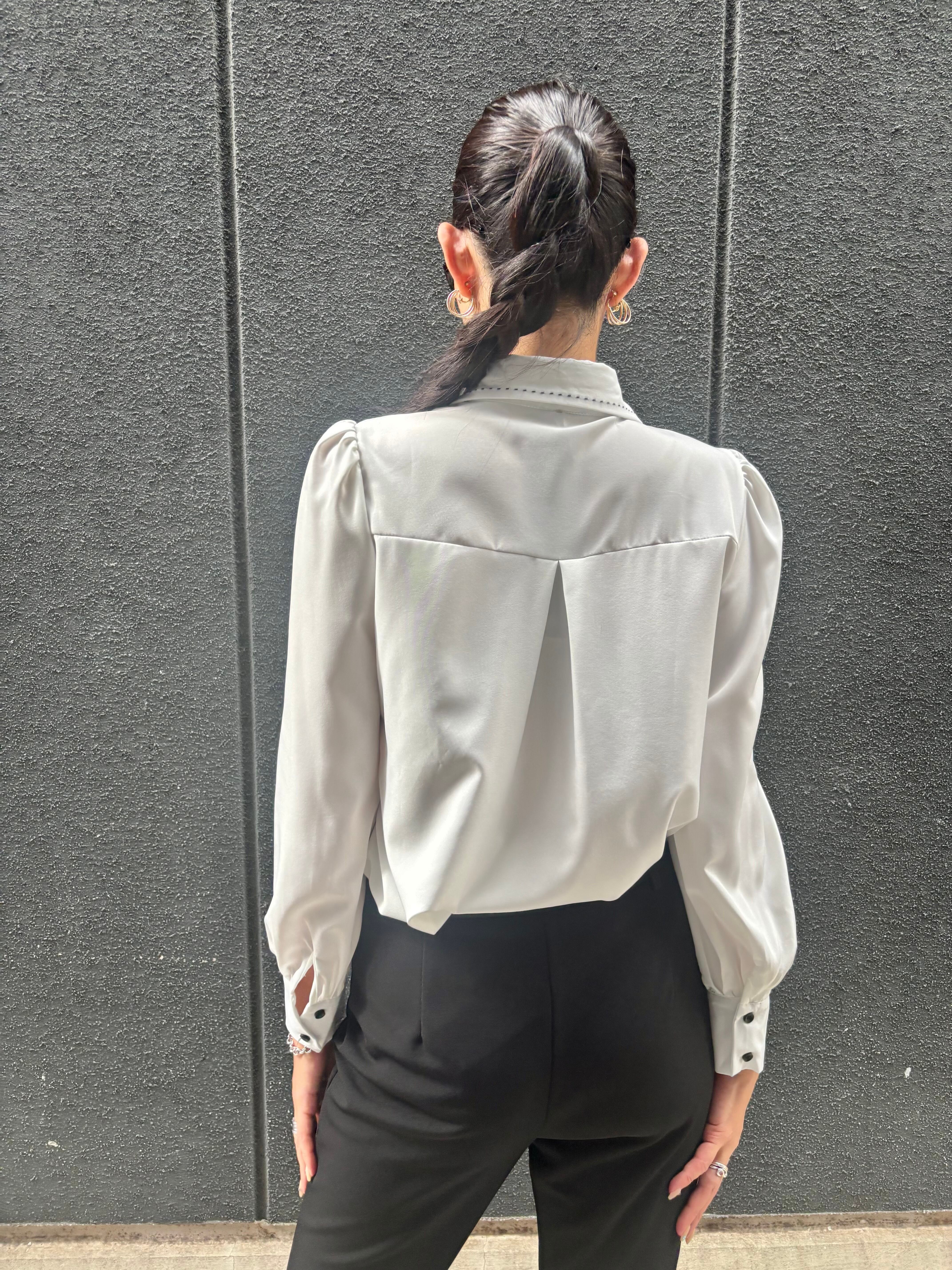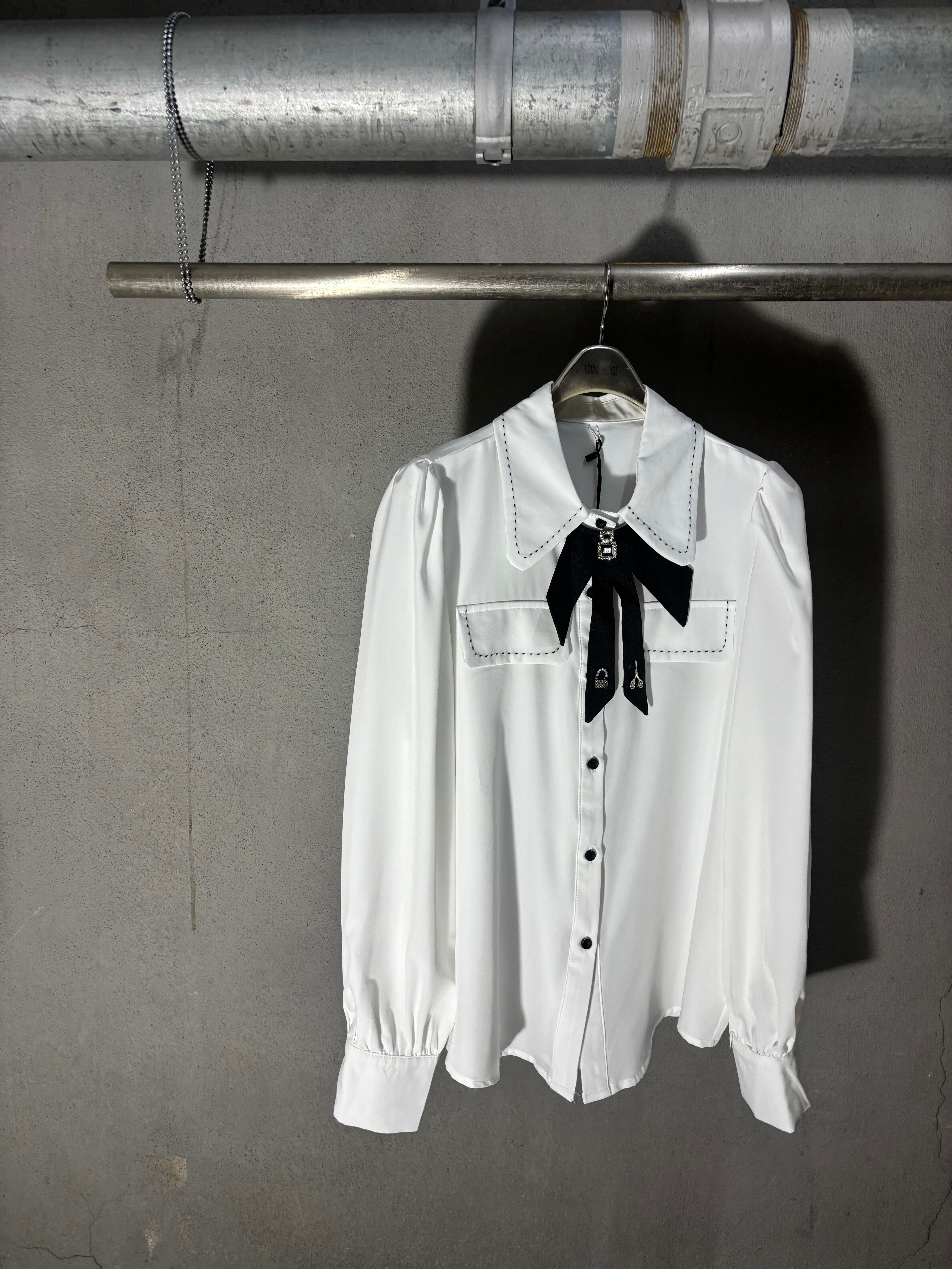 black stitch × ribbon tie design white shirt シャツ ブラウス ステッチ リボン タイ 白シャツ